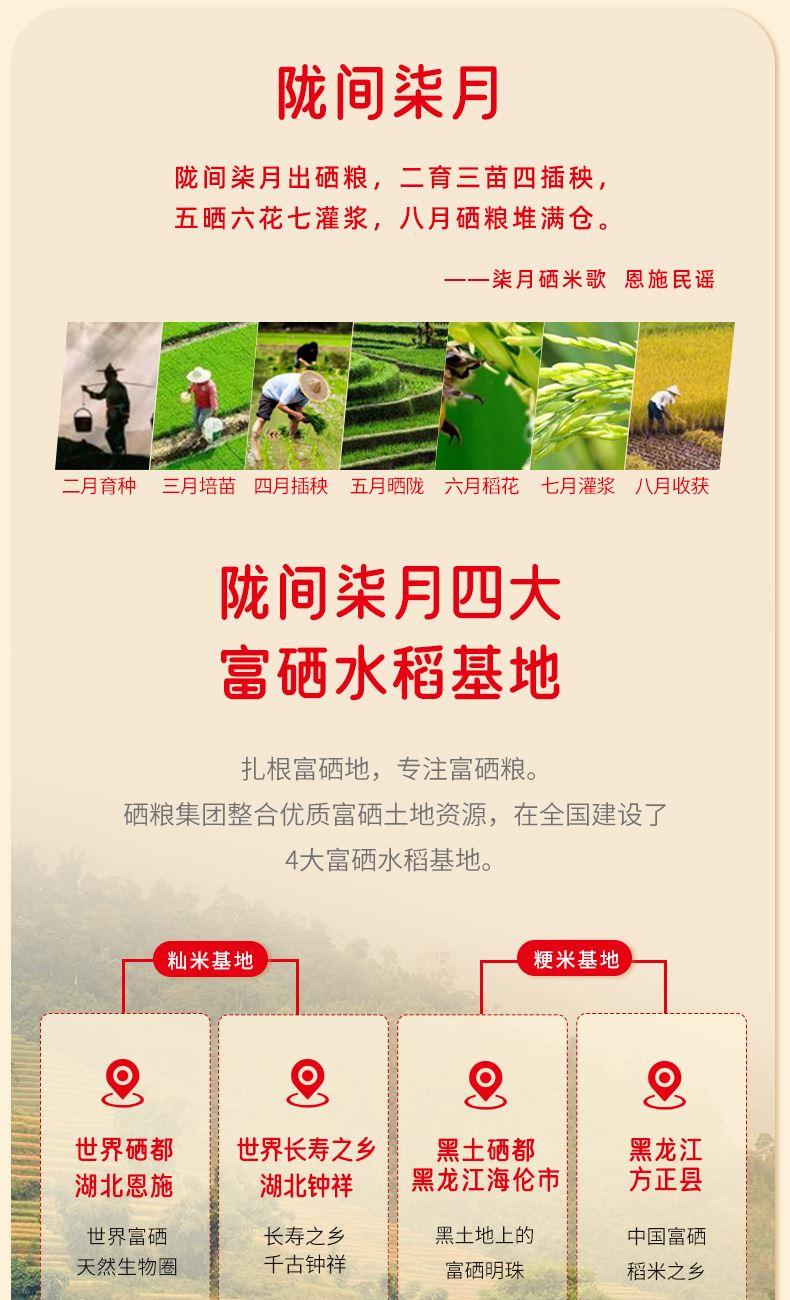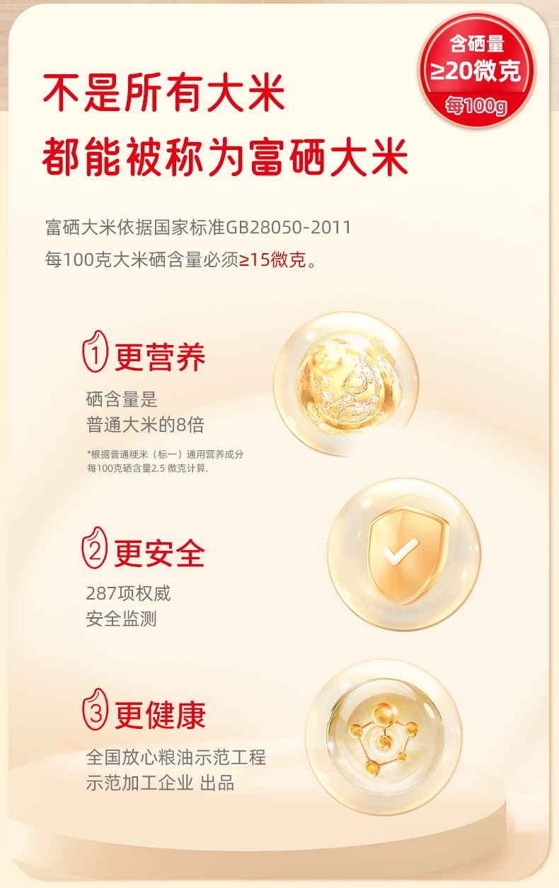 1、源自世界长寿之乡·湖北钟祥,南方籼米; 2、鲜稻现碾,纤细苗条,晶莹洁白,软硬适中,饭粒松软; 3、富有机硒认证,富有机硒认证,每100g平均硒含量≥20ug;