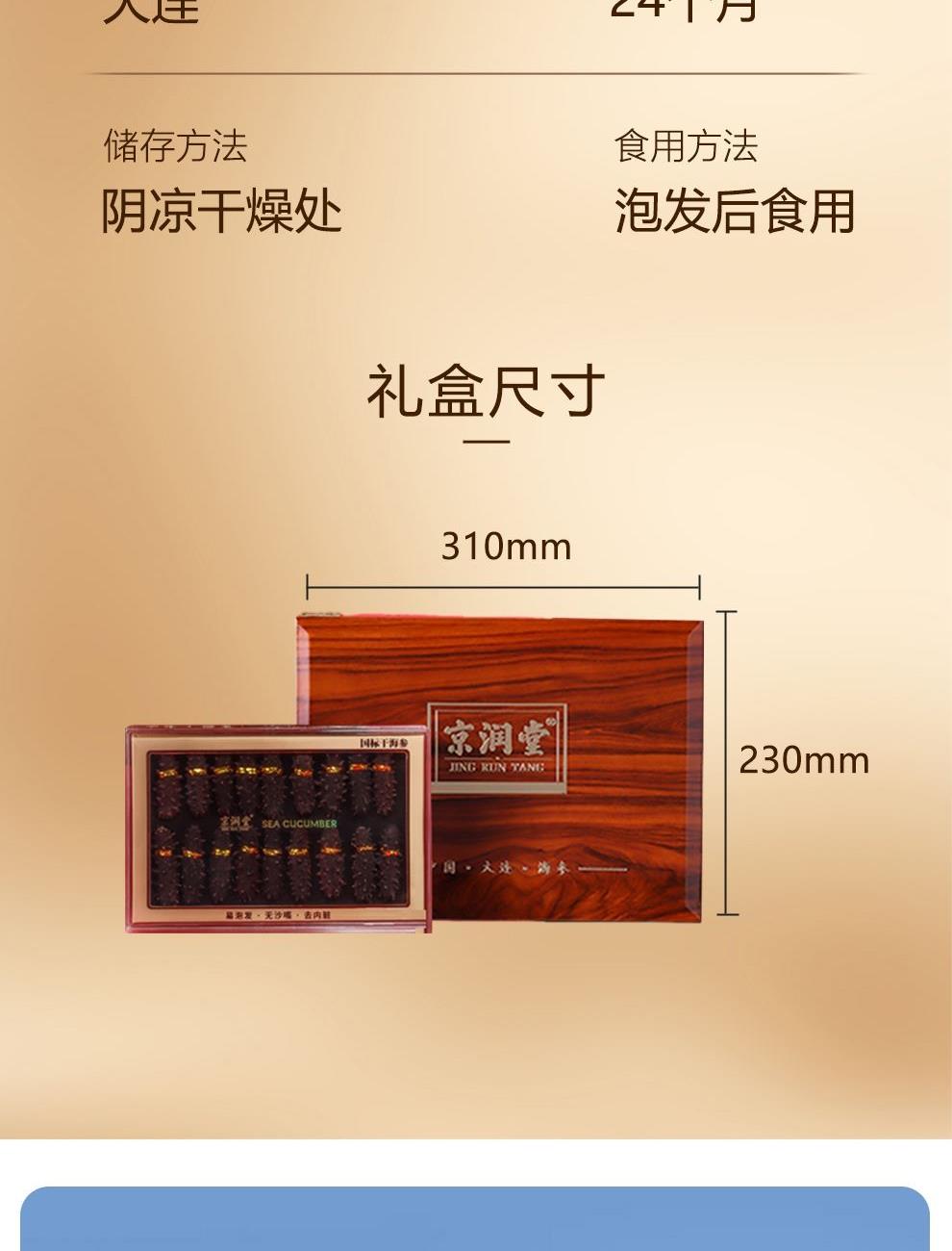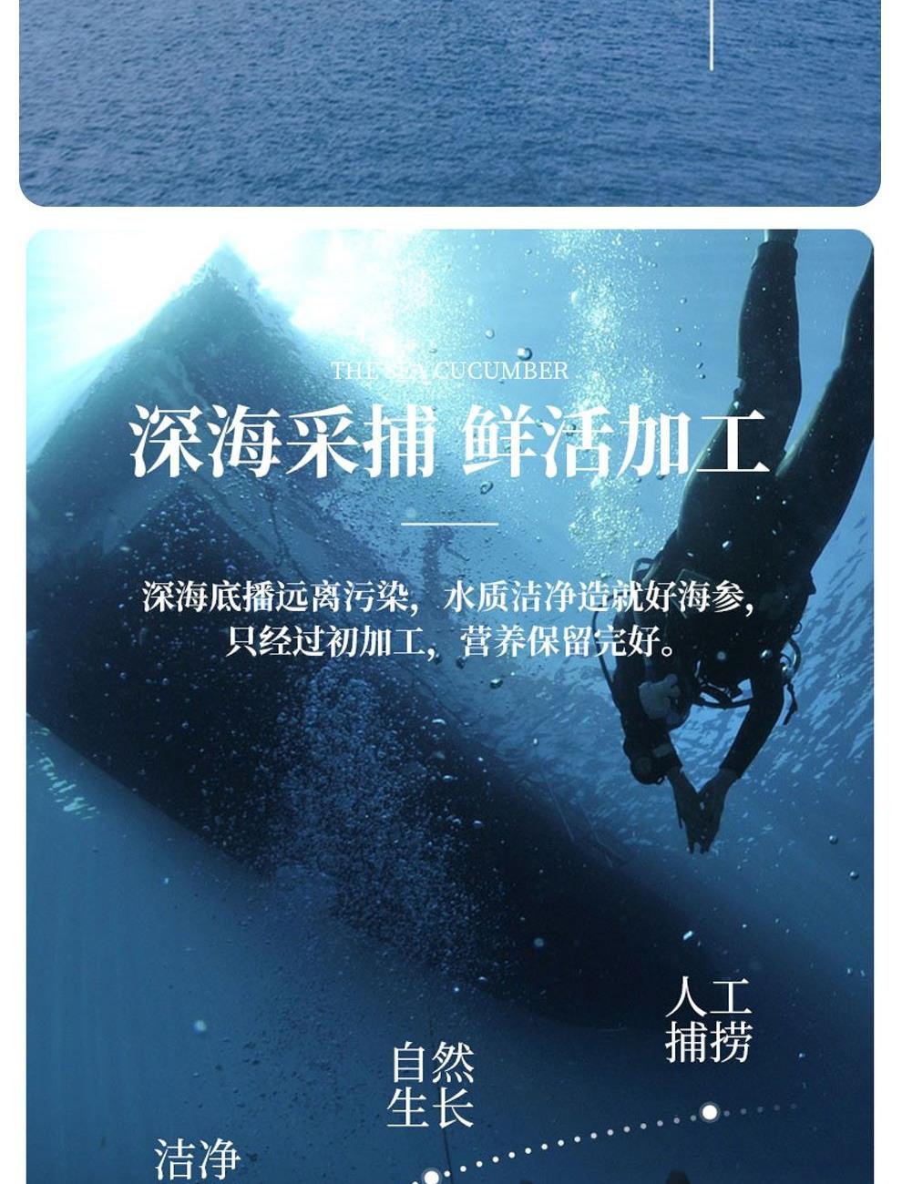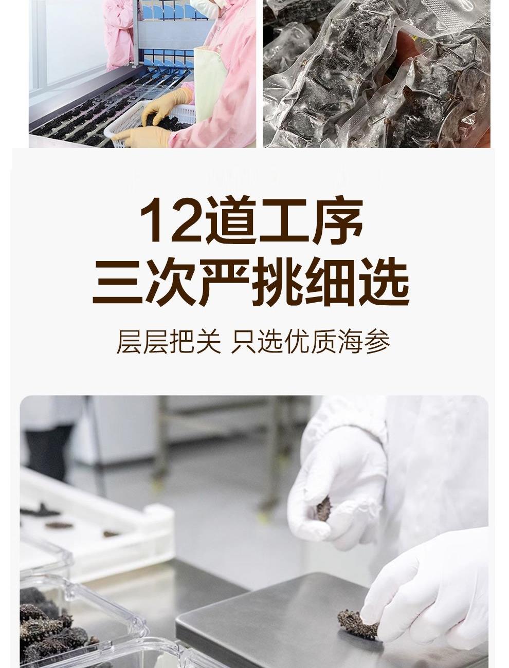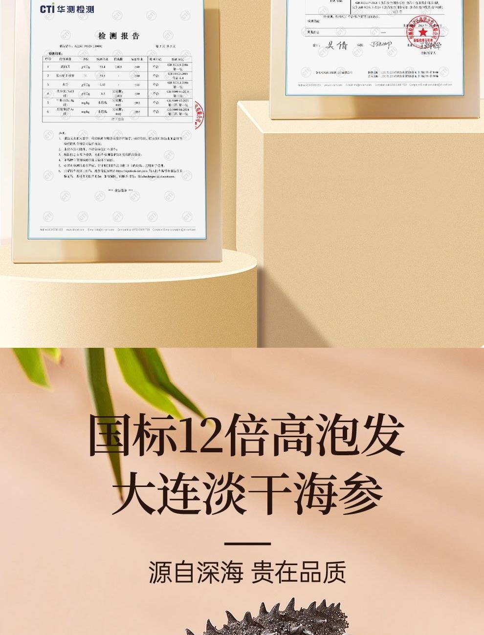 规格:150g/盒(18-24头) 卖点: 1. 产地优势 - 大连北纬39°海域水质清澈、冰冷且富含营养物质,得天独厚的条件,产出的海参品质优良。 - 大连是我国海参的重要产地之一,严格的海洋生态管控和养殖标准也保证了海参的稳定质量。 2. 加工工艺优势 - 淡干工艺保留了海参的营养成分。通过自然晾晒或者低温烘干,减少了海参营养在加工过程中的流失。 - 淡干海参含水量低,使它能够长时间保存,而且重量轻,便于运输和储存。 3. 营养丰富 - 含有丰富的优质蛋白质,其含量高达70%左右,容易被人体吸收,是人体补充蛋白质的良好来源。 - 富含多种人体必需的微量元素,如钙、铁、锌等。