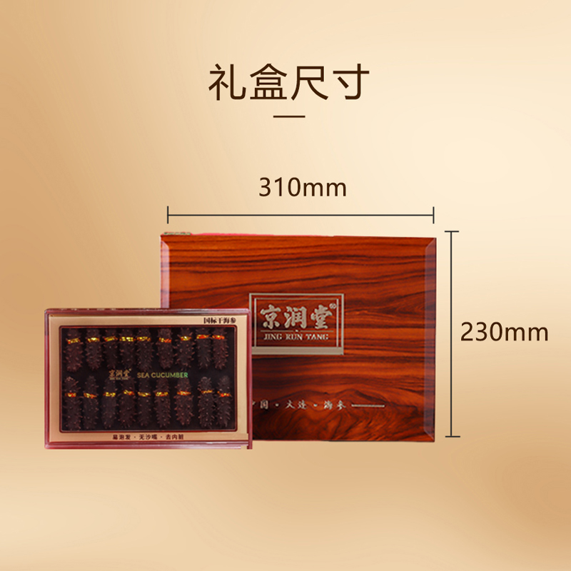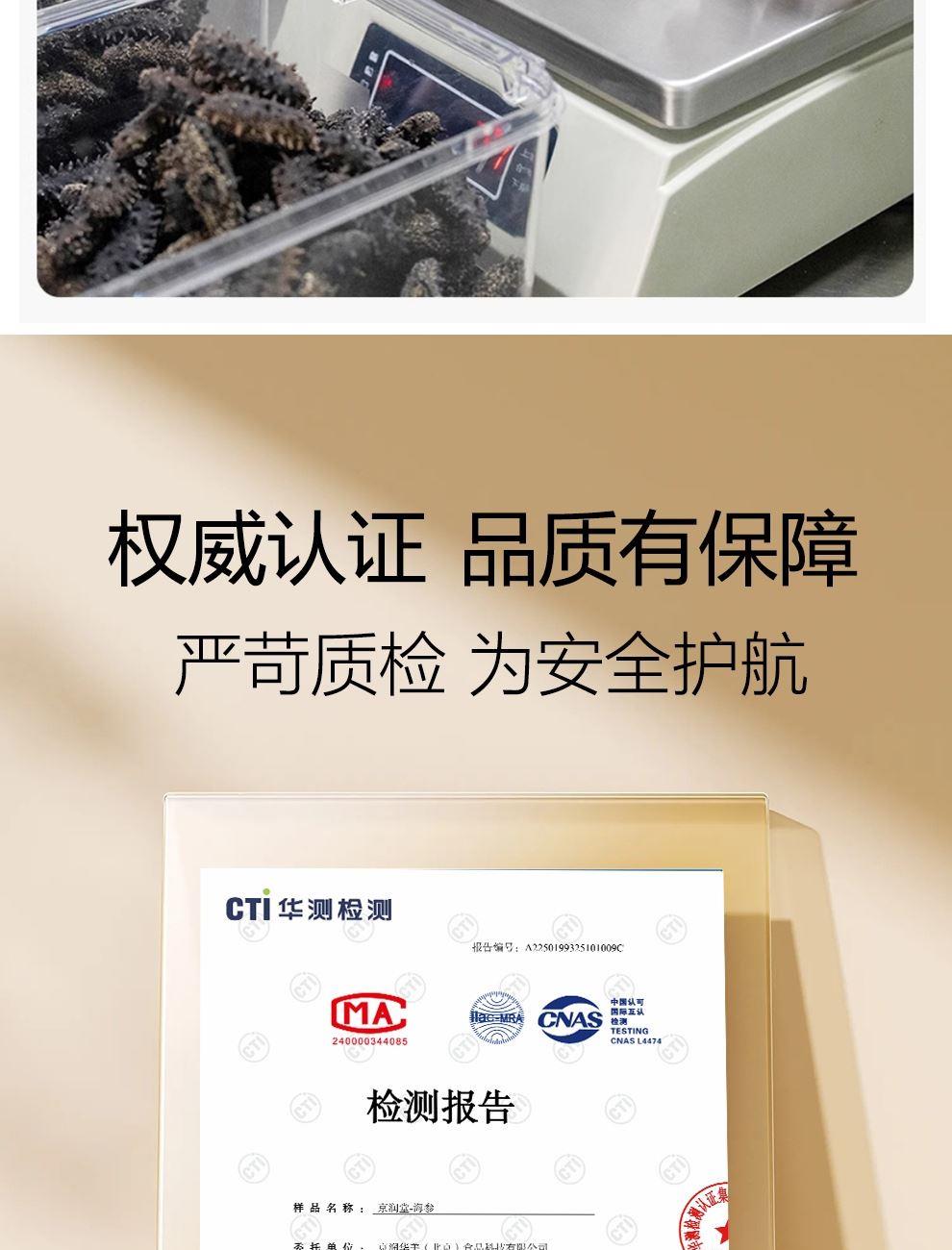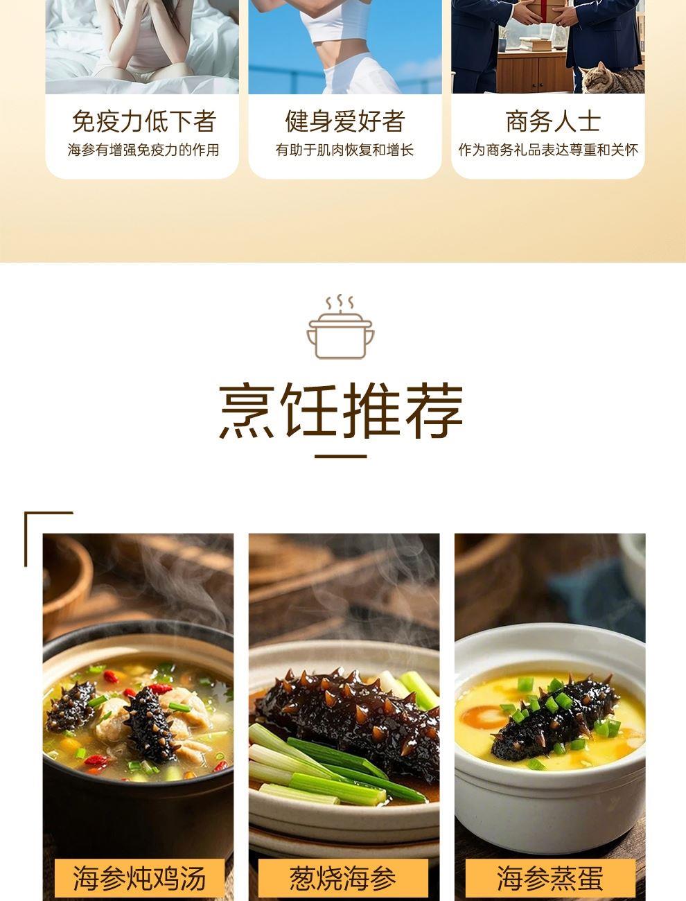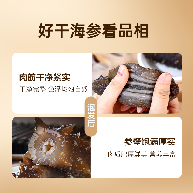 规格:150g/盒(18-24头) 卖点: 1. 产地优势 - 大连北纬39°海域水质清澈、冰冷且富含营养物质,得天独厚的条件,产出的海参品质优良。 - 大连是我国海参的重要产地之一,严格的海洋生态管控和养殖标准也保证了海参的稳定质量。 2. 加工工艺优势 - 淡干工艺保留了海参的营养成分。通过自然晾晒或者低温烘干,减少了海参营养在加工过程中的流失。 - 淡干海参含水量低,使它能够长时间保存,而且重量轻,便于运输和储存。 3. 营养丰富 - 含有丰富的优质蛋白质,其含量高达70%左右,容易被人体吸收,是人体补充蛋白质的良好来源。 - 富含多种人体必需的微量元素,如钙、铁、锌等。