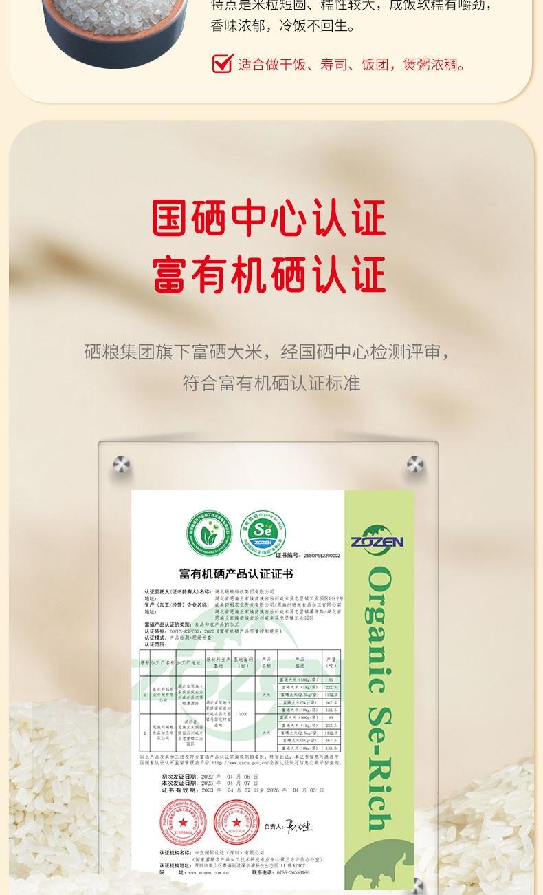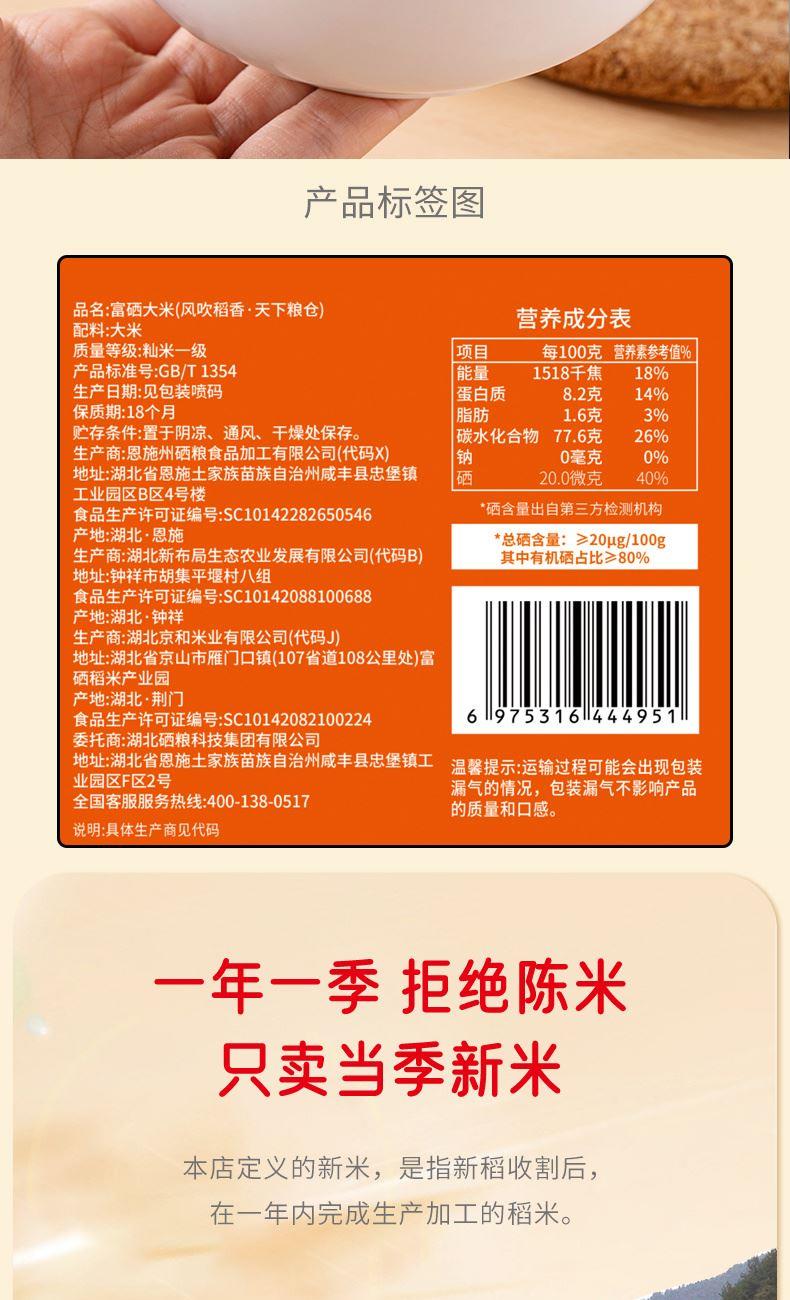 产品信息 品 名:富硒大米(风吹稻香·天下粮仓) 规 格:2.5kg 箱 规 8袋/箱 包 装:单层真空包装 产品特色 1、源自世界硒都·湖北恩施,南方籼米; 2、鲜稻现碾,纤细苗条,晶莹洁白,软硬适中,饭粒松软; 3、富有机硒认证,每100g平均硒含量≥20ug;