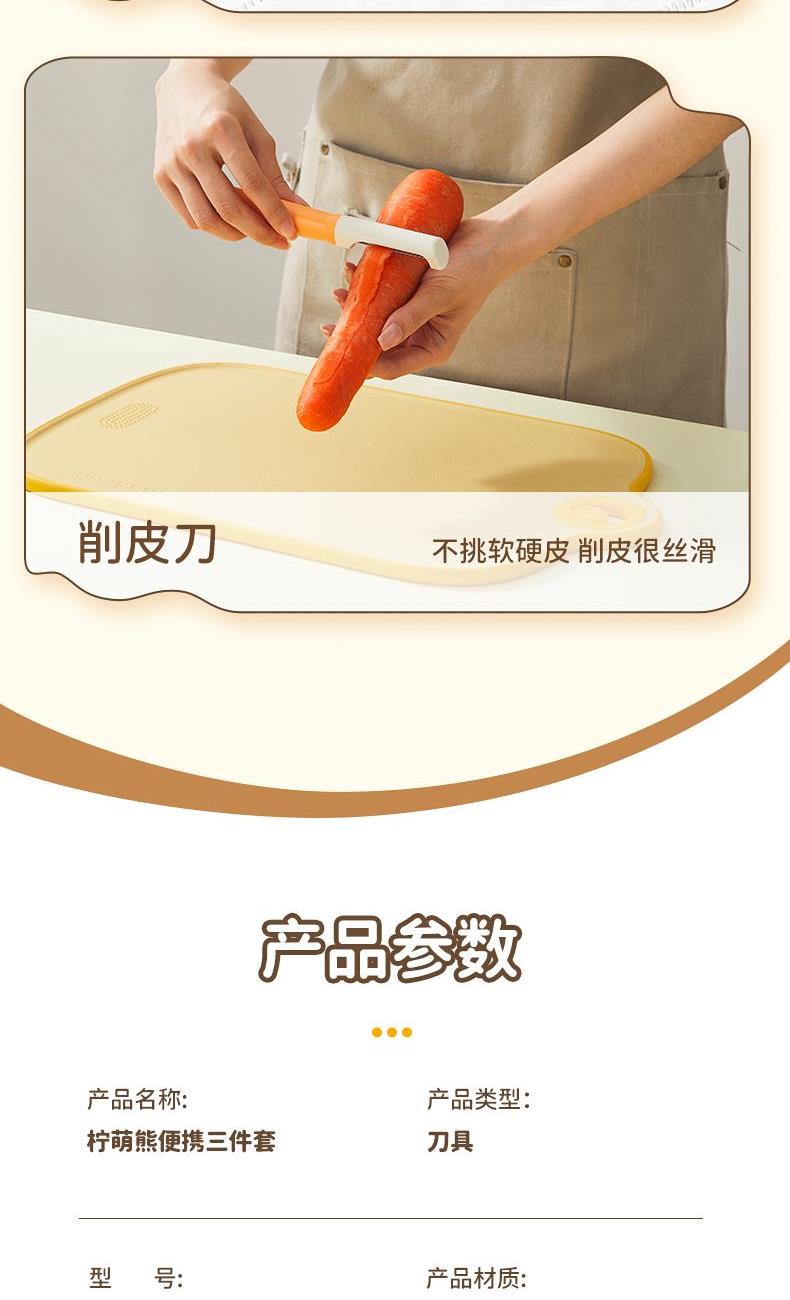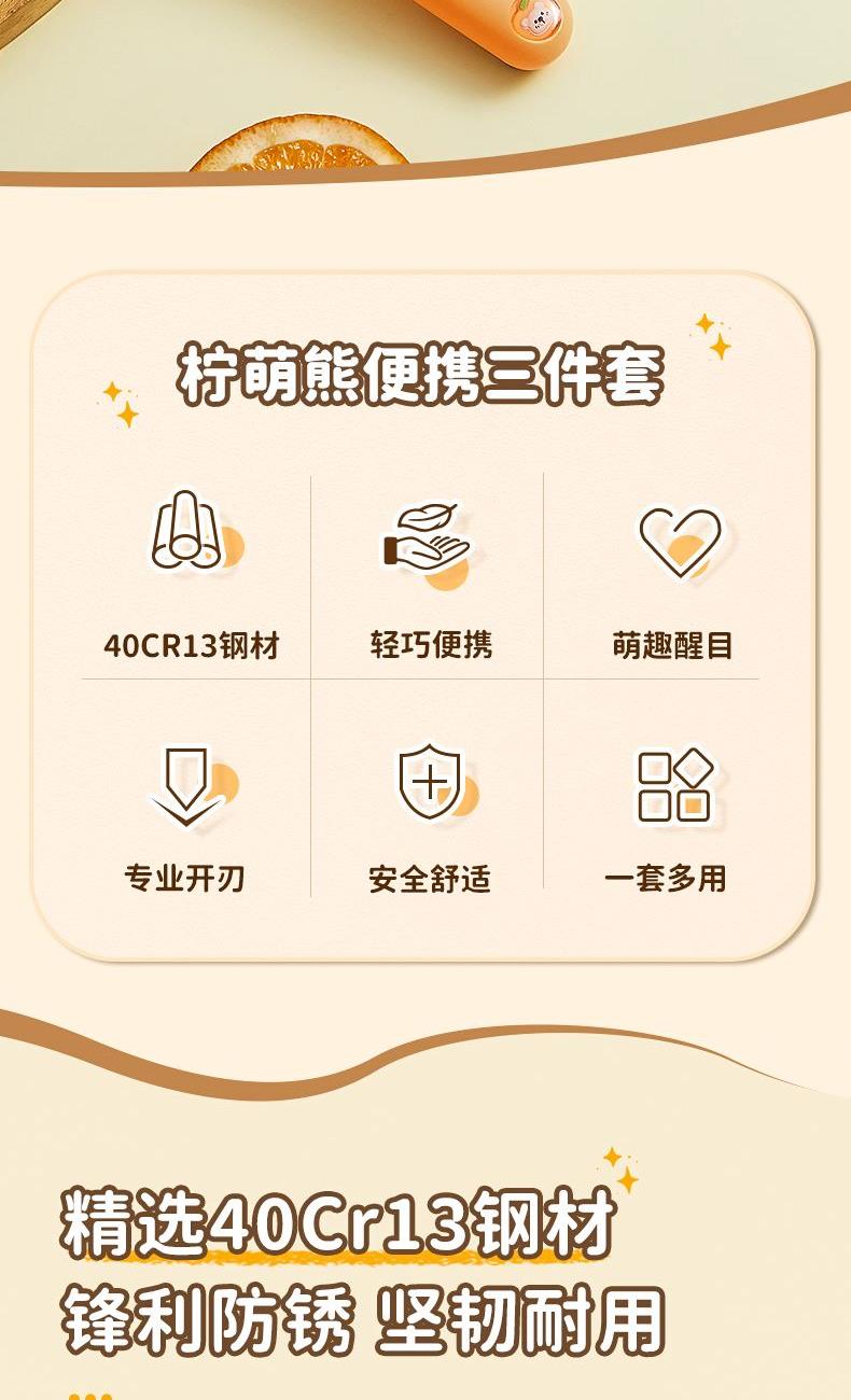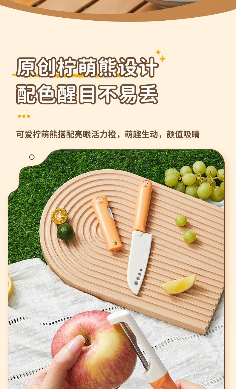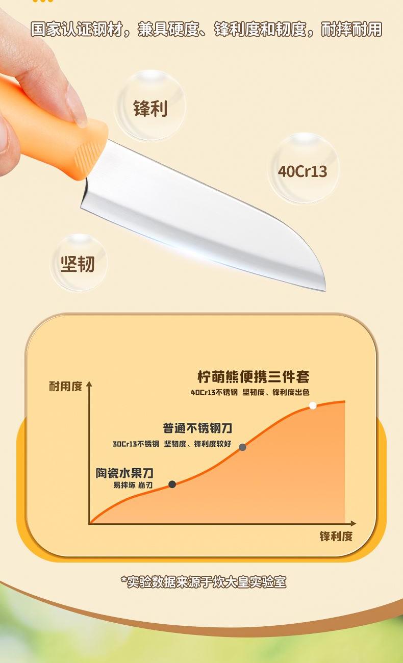 规格:削皮刀:16.7*3.8CM、 折叠水果刀:18.5CM、水果刀:20.5CM 材质:不锈钢40Cr13、PP 特点:1、精选40Cr13钢材、锋利防锈 坚韧耐用; 2、轻巧小体积、装进口袋 果香随行、轻盈手感,小巧便携,随处可装,不占多余空间; 3、配色醒目不易丢、可爱柠萌熊搭配亮眼活力橙,萌趣生动,颜值吸睛; 4、黄金15°V型二次开刃,切削阻力更小、软硬皆可切,不易卷边; 5、折叠收纳、带上刀套、易误开,携带安全、隐藏刀锋,使用安全