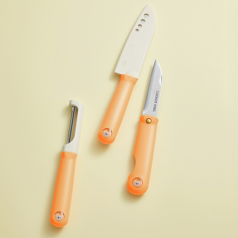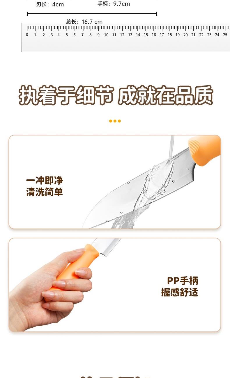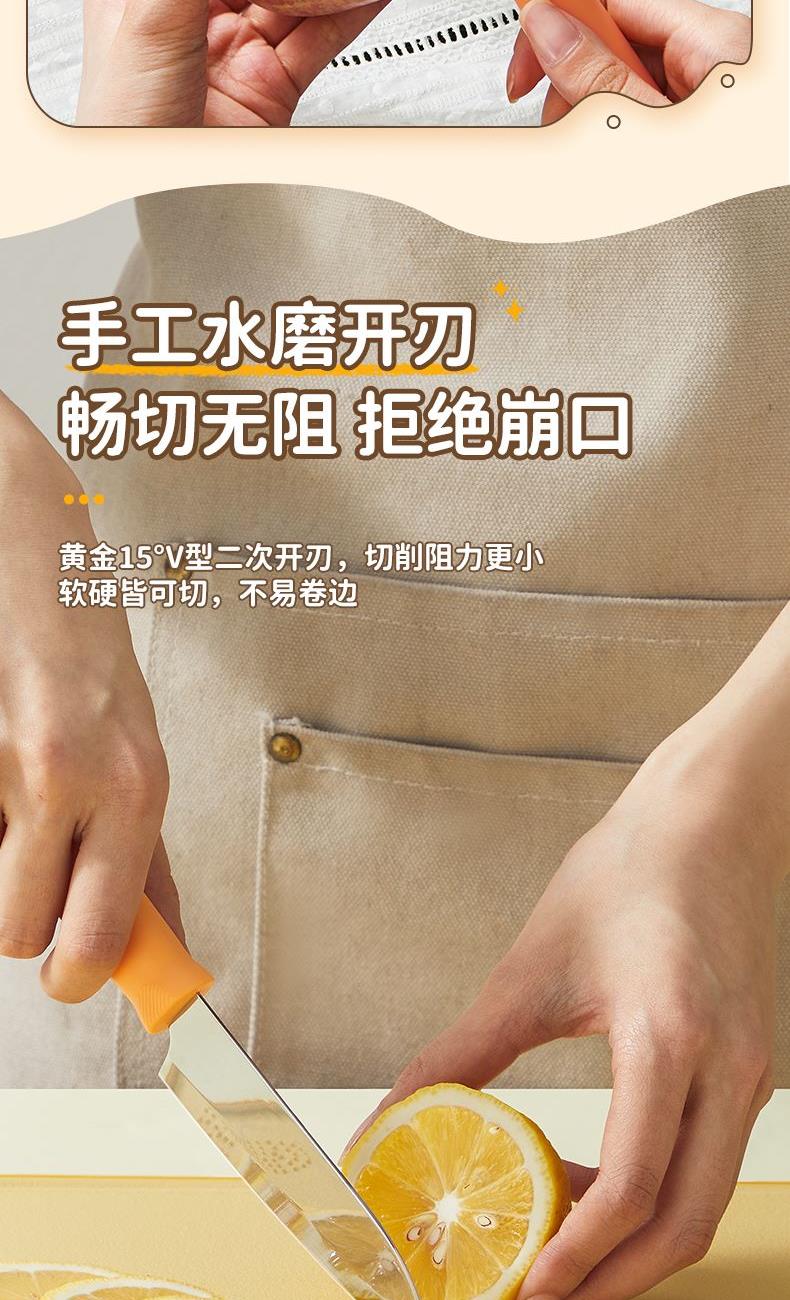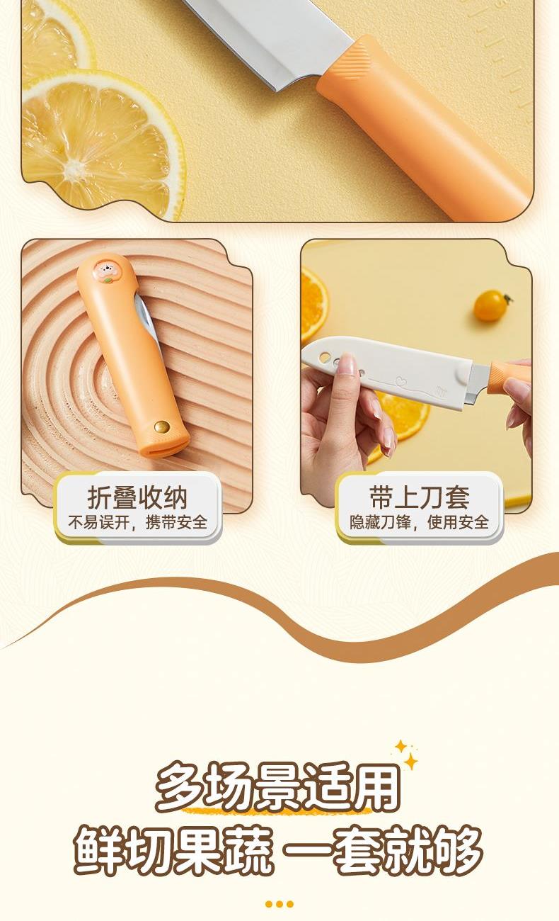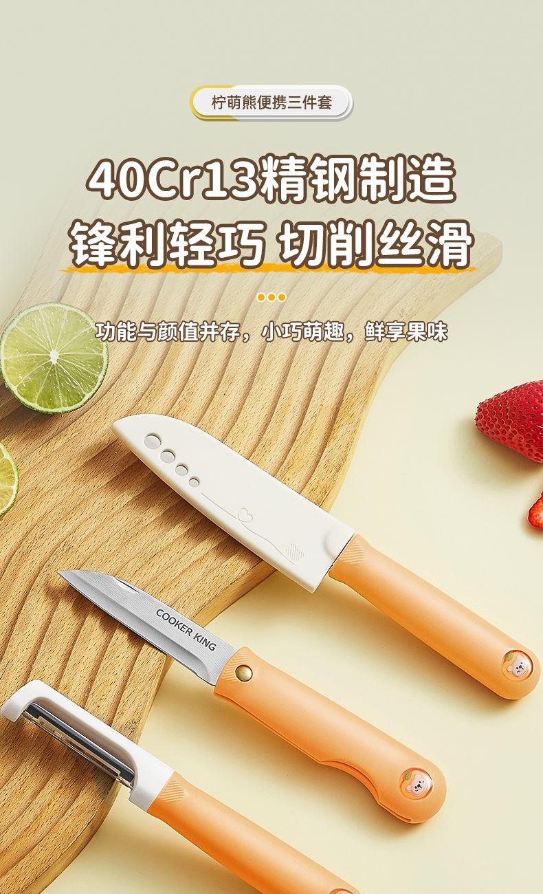 规格:削皮刀:16.7*3.8CM、 折叠水果刀:18.5CM、水果刀:20.5CM 材质:不锈钢40Cr13、PP 特点:1、精选40Cr13钢材、锋利防锈 坚韧耐用; 2、轻巧小体积、装进口袋 果香随行、轻盈手感,小巧便携,随处可装,不占多余空间; 3、配色醒目不易丢、可爱柠萌熊搭配亮眼活力橙,萌趣生动,颜值吸睛; 4、黄金15°V型二次开刃,切削阻力更小、软硬皆可切,不易卷边; 5、折叠收纳、带上刀套、易误开,携带安全、隐藏刀锋,使用安全