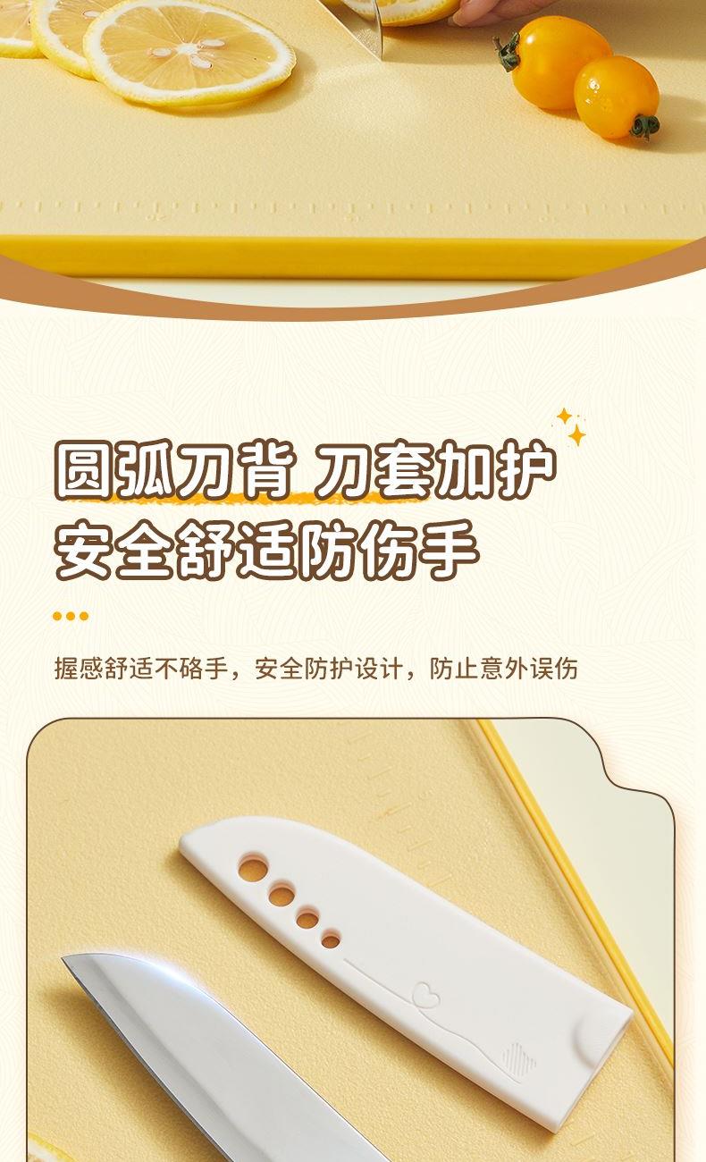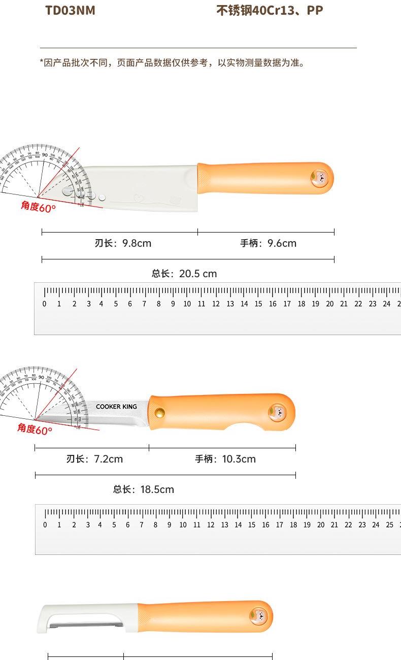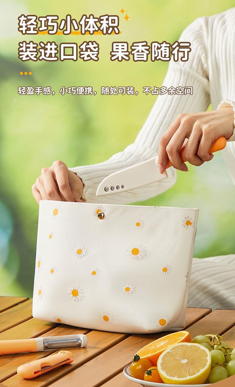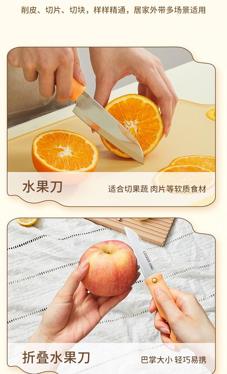 规格:削皮刀:16.7*3.8CM、 折叠水果刀:18.5CM、水果刀:20.5CM 材质:不锈钢40Cr13、PP 特点:1、精选40Cr13钢材、锋利防锈 坚韧耐用; 2、轻巧小体积、装进口袋 果香随行、轻盈手感,小巧便携,随处可装,不占多余空间; 3、配色醒目不易丢、可爱柠萌熊搭配亮眼活力橙,萌趣生动,颜值吸睛; 4、黄金15°V型二次开刃,切削阻力更小、软硬皆可切,不易卷边; 5、折叠收纳、带上刀套、易误开,携带安全、隐藏刀锋,使用安全