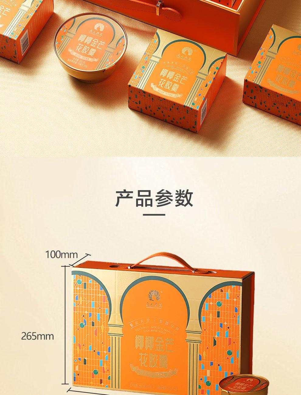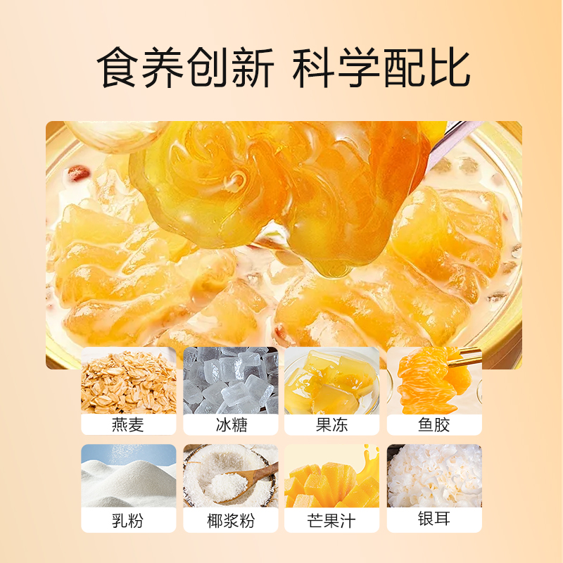 规格:1512克(252克*6碗)、固形物含量≥35% 卖点:我们坚持严选全球优质原料,只为打造这份美味。花胶,取自深海大鱼,肉质厚实,富含满满胶原蛋白,每一口都是对肌肤的温柔呵护,是天然的美容圣品。搭配来自热带果园的新鲜芒果,金黄果肉散发着浓郁果香,甜润多汁,为花胶羹注入自然的甜蜜。再融入醇厚椰浆,精选自阳光椰林的椰子,椰香馥郁,口感丝滑,将热带风情浓缩其中,让您足不出户,就能领略一场舌尖上的海岛之旅。