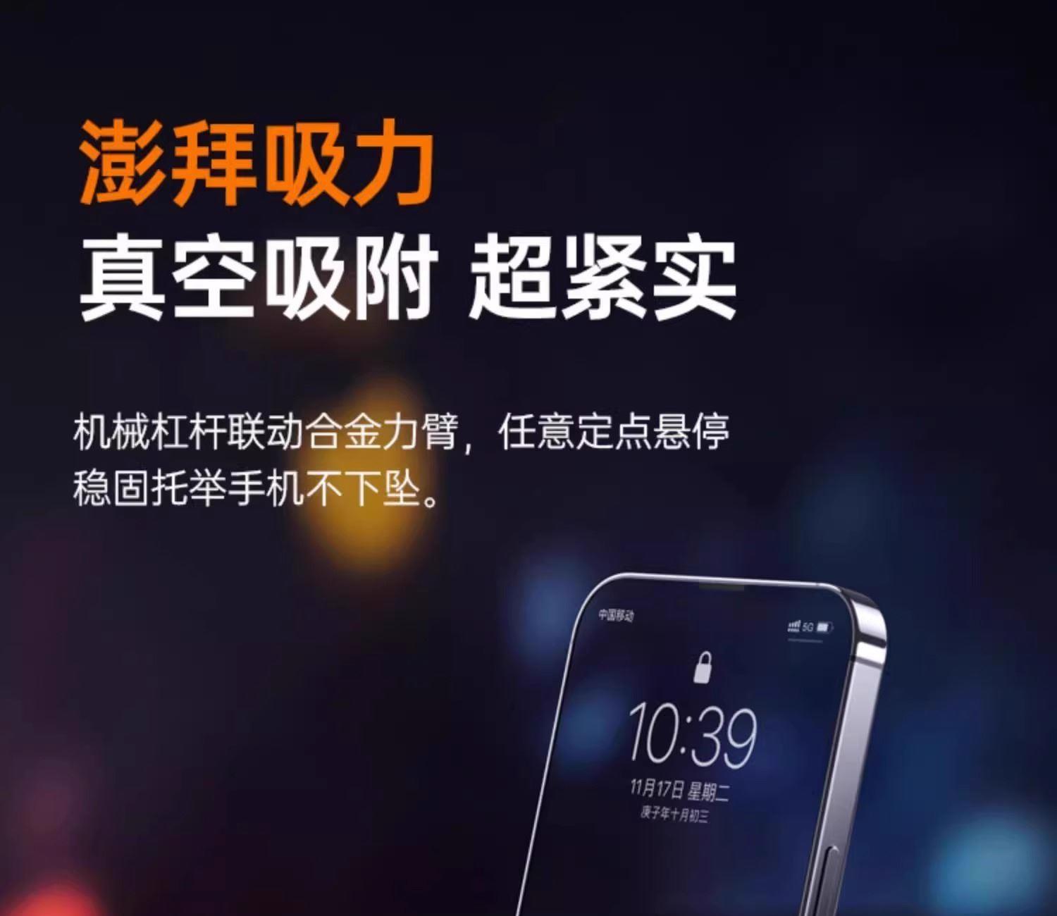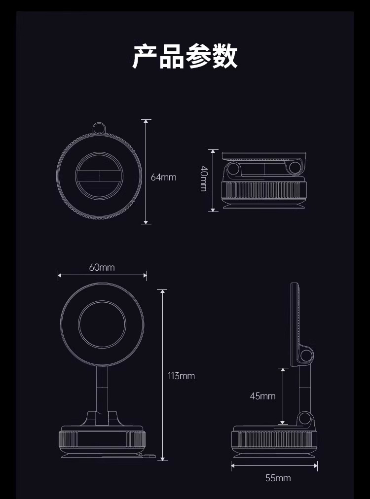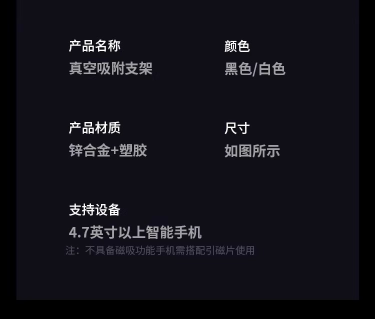 产品材质:锌合金++塑胶 颜色:黑色/白色支持设备:4.7英寸以上智能手机适用:汽车中控台,玻璃面,金属面,光滑的瓷砖和不锈钢面、桌面 折叠尺寸:64*64*40mm 包装尺寸:79x38x90mm 整箱数量:100/箱 产品重量:100g