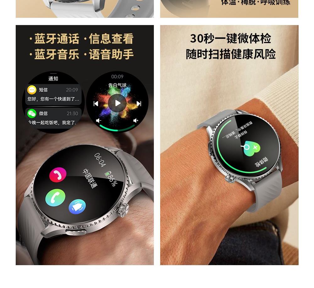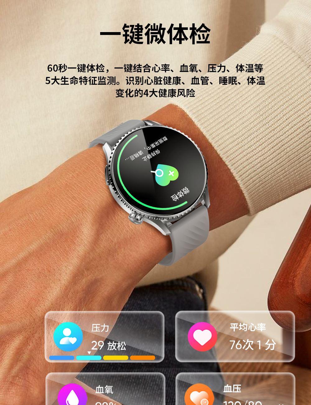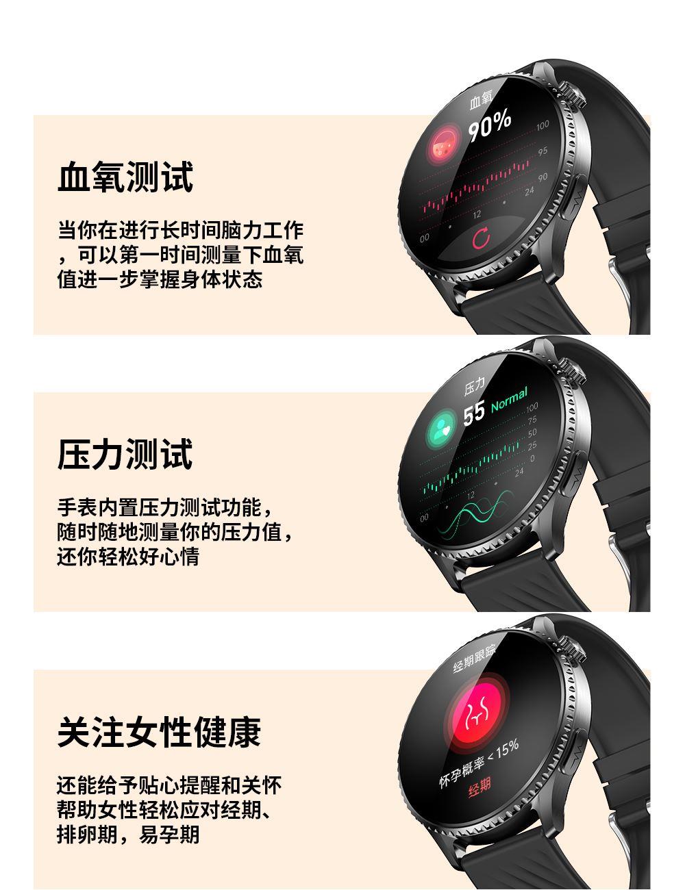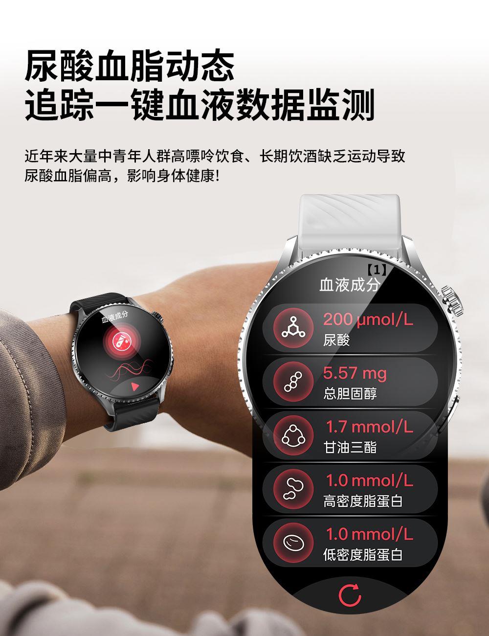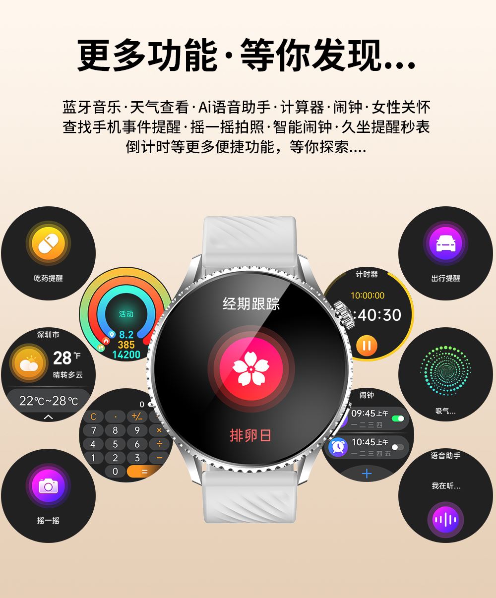 Ai辅诊报告、PPG血压监测、心率监测/超速预警、尿酸测量、血脂监测、血液成分测量、身体成分测量、血氧监测、24小时科学睡眠监测、体温监测、梅脱测量、呼吸训练、压力检测、女性健康(经期跟踪)、久坐提醒等健康功能。1、离线支付、NFC门禁、SOS紧急呼叫、50+运动模式、秒表、手电、计步、卡路里、距离、来电提醒、闹钟提醒、抬手亮屏、社交分享(微信、QQ、Facebook、Twitter)等、摇摇拍照、遥控音乐、蓝牙接听/拨打电话、消息推送、Siri拨号、查找手机、查找手环、表盘切换、IP68级防水