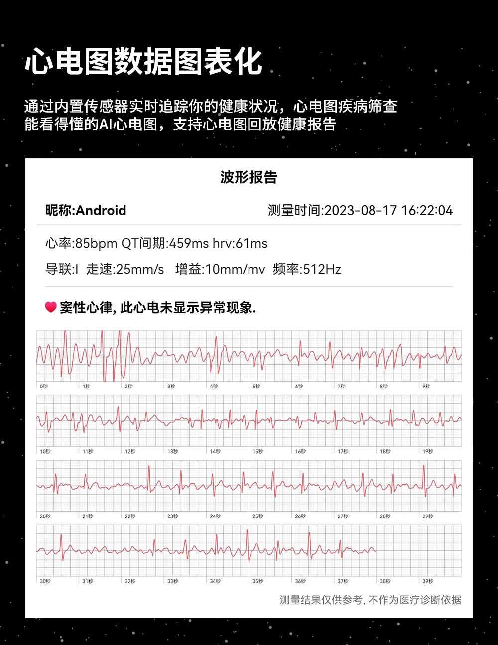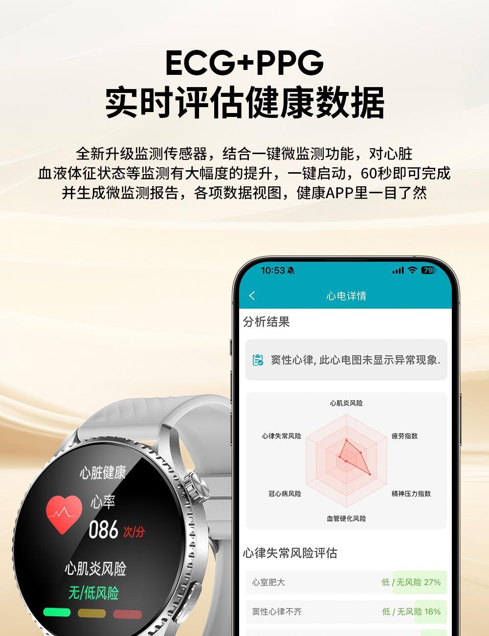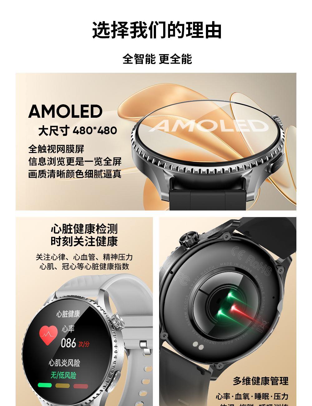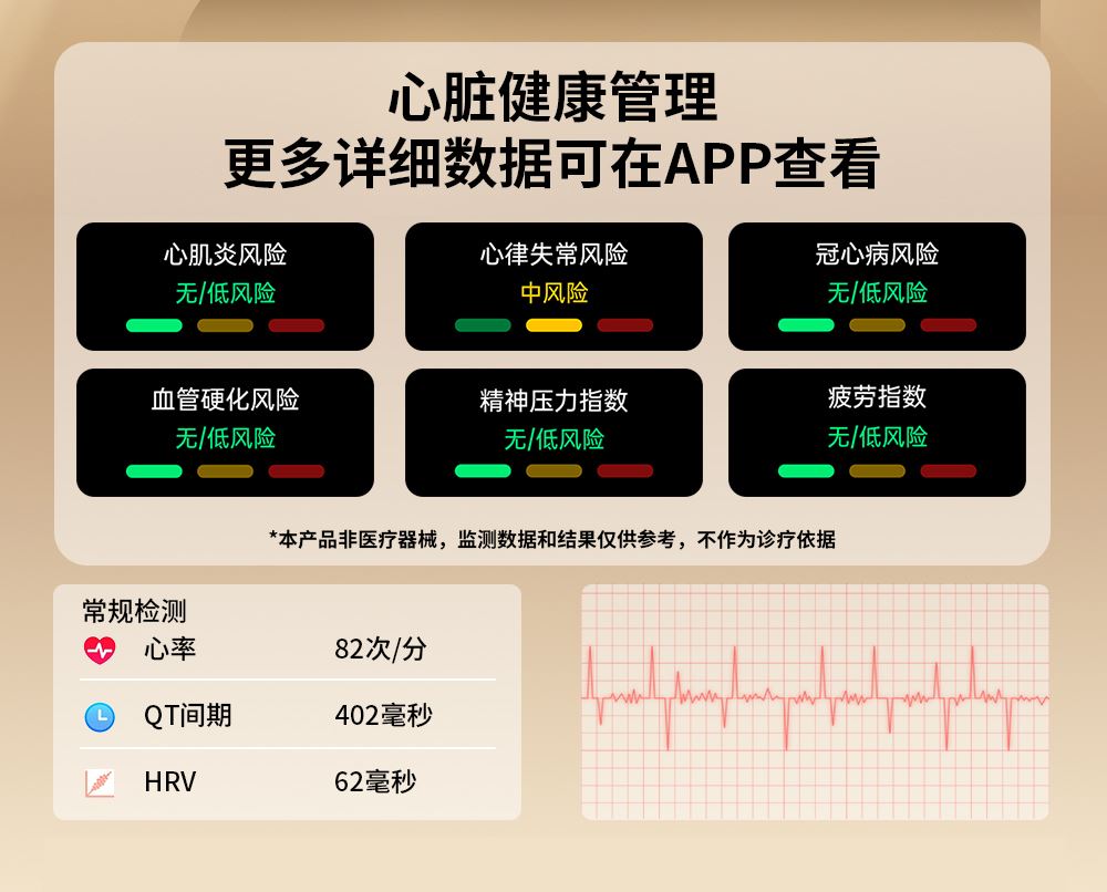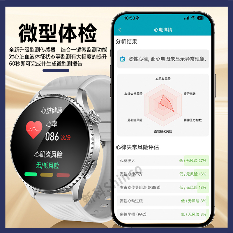 Ai辅诊报告、PPG血压监测、心率监测/超速预警、尿酸测量、血脂监测、血液成分测量、身体成分测量、血氧监测、24小时科学睡眠监测、体温监测、梅脱测量、呼吸训练、压力检测、女性健康(经期跟踪)、久坐提醒等健康功能。1、离线支付、NFC门禁、SOS紧急呼叫、50+运动模式、秒表、手电、计步、卡路里、距离、来电提醒、闹钟提醒、抬手亮屏、社交分享(微信、QQ、Facebook、Twitter)等、摇摇拍照、遥控音乐、蓝牙接听/拨打电话、消息推送、Siri拨号、查找手机、查找手环、表盘切换、IP68级防水