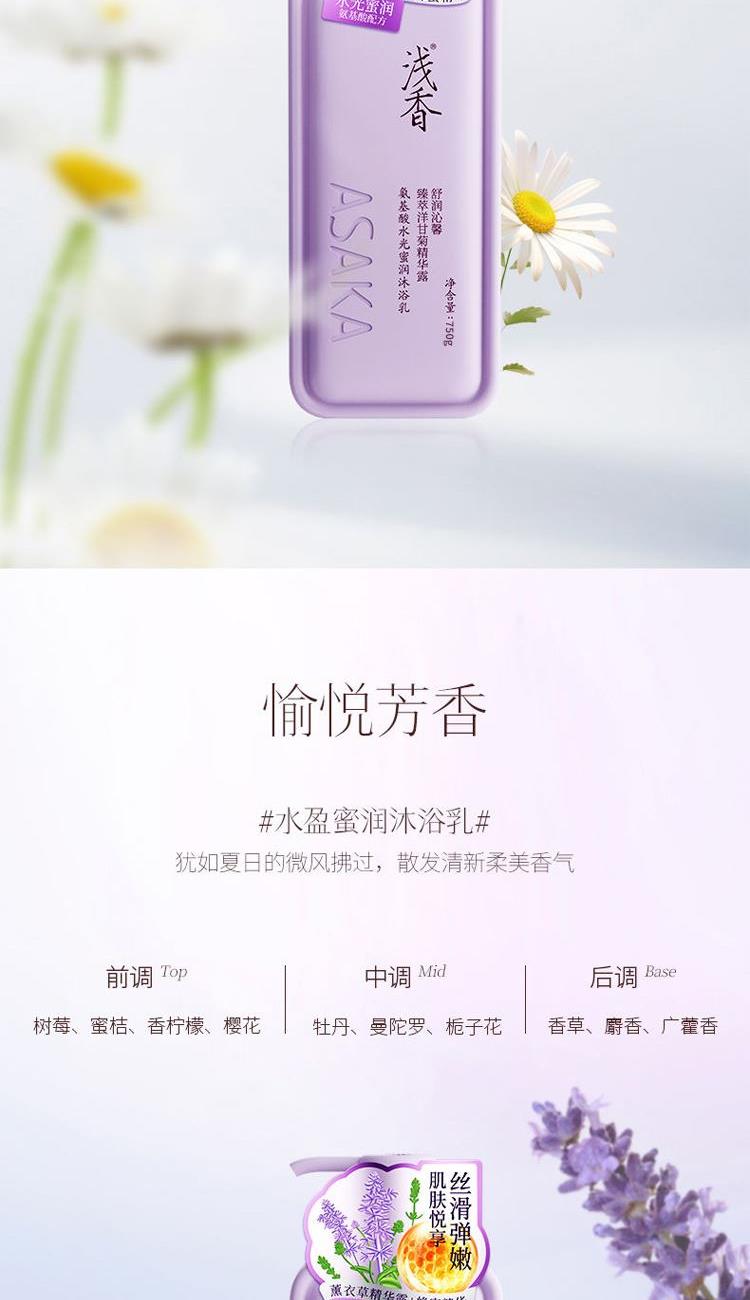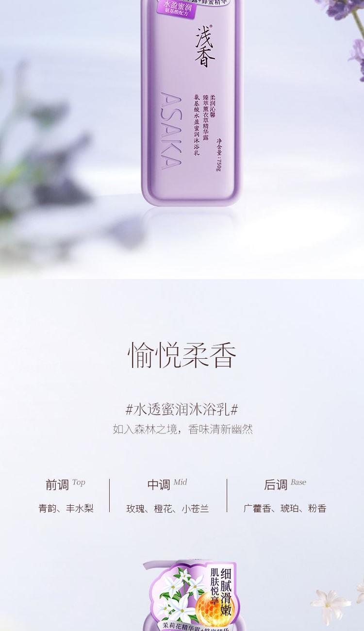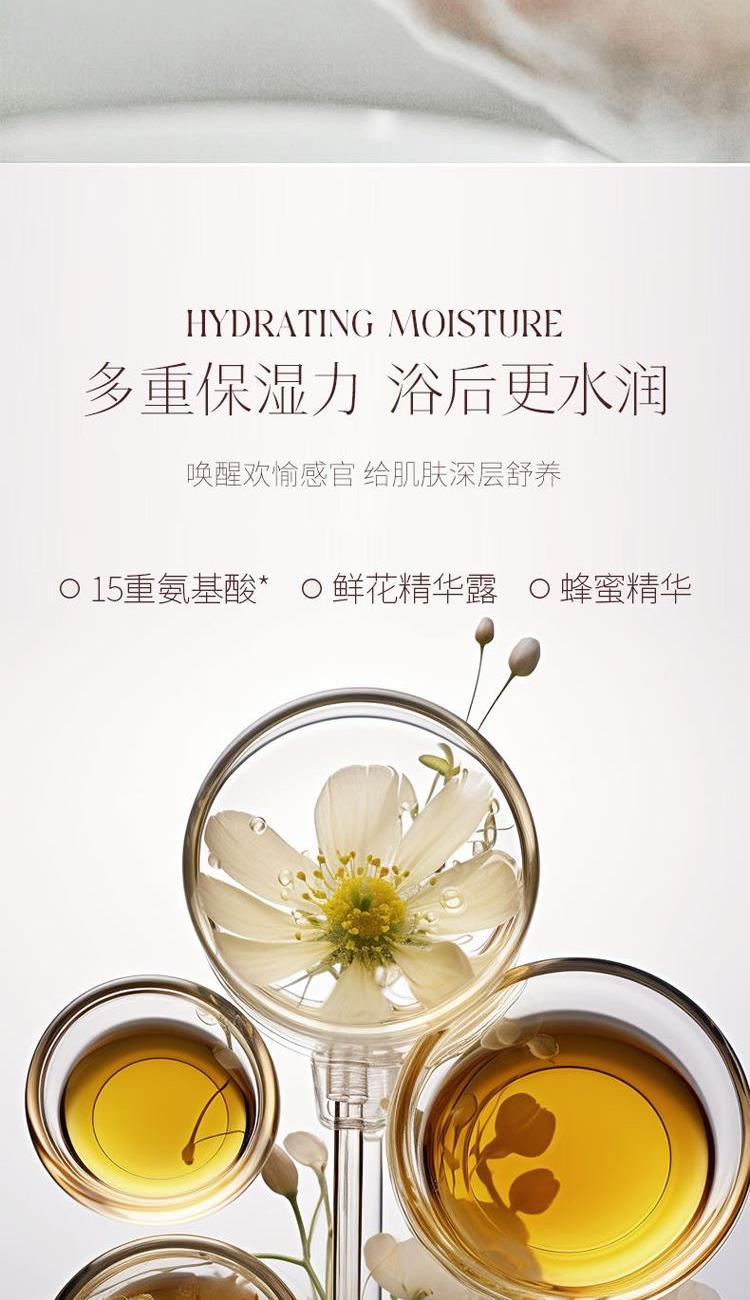 1、水润沁肤,浴享花香。摸得到的香·嫩·滑。多重润养高能保湿,浴享柔滑水嫩肌。15种氨基酸*,呵宠肌肤。3种鲜花纯露,洋甘菊:薰衣草、茉莉花:润泽美肌。蜂蜜精华:水润滋养。 2、营养质地更浓厚,弱酸更亲肤。多重精华,质地较为浓稠。弱酸亲肤,更安心。 3、洗走疲倦浅香萦绕,开启愉悦身心之旅。水盈蜜润沐浴乳,犹如夏日的微风拂过,散发清新柔美香气。