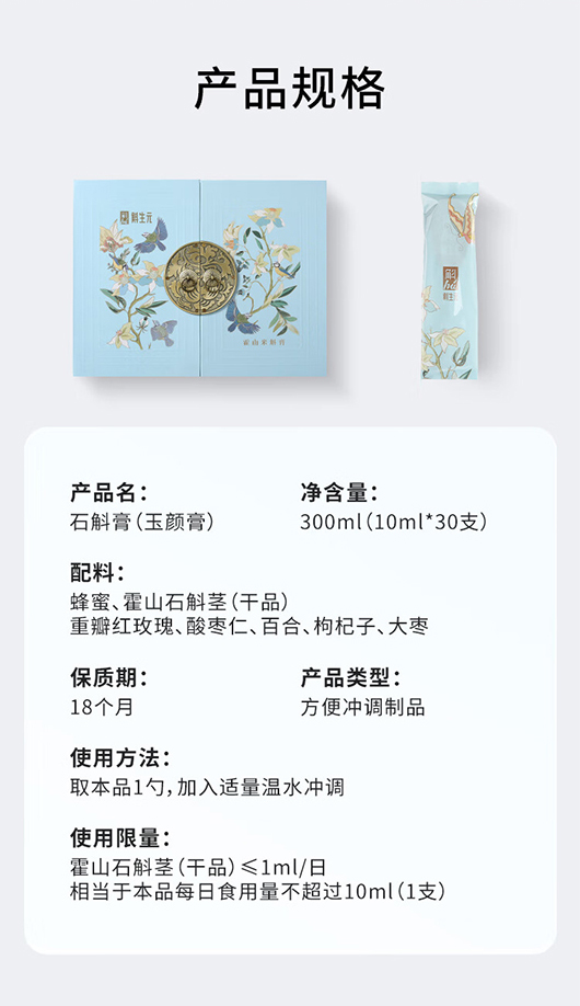产地:安徽 产品规格:300ml(10ml*30支) 礼盒尺寸: 32*24.5*12 (cm) 保质期:18个月 霍山石斛保护区内原种苗野外栽培 国际博士团队潜心研发 千年膏方,科学配伍,功效全 黄金配比,高倍浓缩,深度滋养好吸收 口感浓郁丝滑,甘甜可口 道地高品质食材,0添加