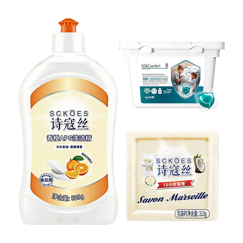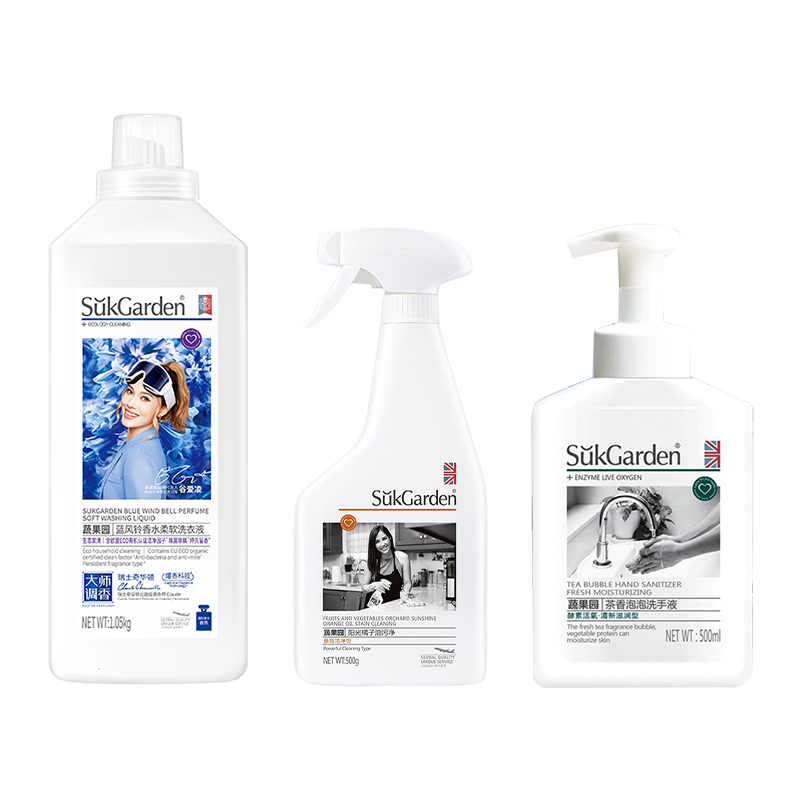 1. SukGarden蔬果园蓝风铃香水柔软洗衣1050g 2. SukGarden蔬果园蓝盾 香水洗衣凝珠8g*30颗 3. SukGarden蔬果园阳光橘子油污净500g 4. SukGarden蔬果园茶香泡泡洗手液500ml 5. 小仓熊香氛洁厕液(蜜桃香)450g 6. 小仓熊马桶挂篮-(单个装)50g 7. 小仓熊冰箱除味蛋-柠檬30g 8. Sckoes诗蔻丝APG超浓缩洗洁精505g 9. Sckoes诗蔻丝 皂310g 10. Sckoes诗蔻丝木浆清洗海绵1块 11. 立体玫瑰花贺卡(赠) 12. SukGarden蔬果园精美礼盒-谷爱凌版SGY3