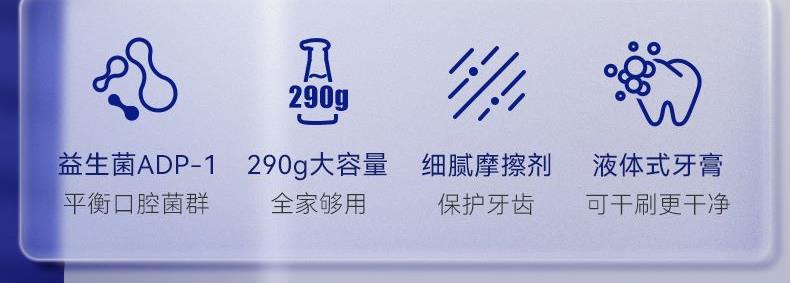 容量:290g 型号:YG-AY290-1 1. 超大容量,全家共享 2. 按压式设计,使用方便 3. 富含口腔益生菌ADP-1#通过共凝集作用,物理性移除有害菌,清洁牙齿,保护口腔,清新口气 4. 柠檬酸锌 护齿成分,预防牙垢,温和护齿