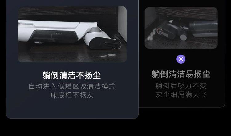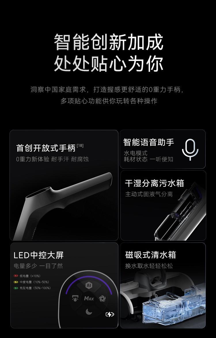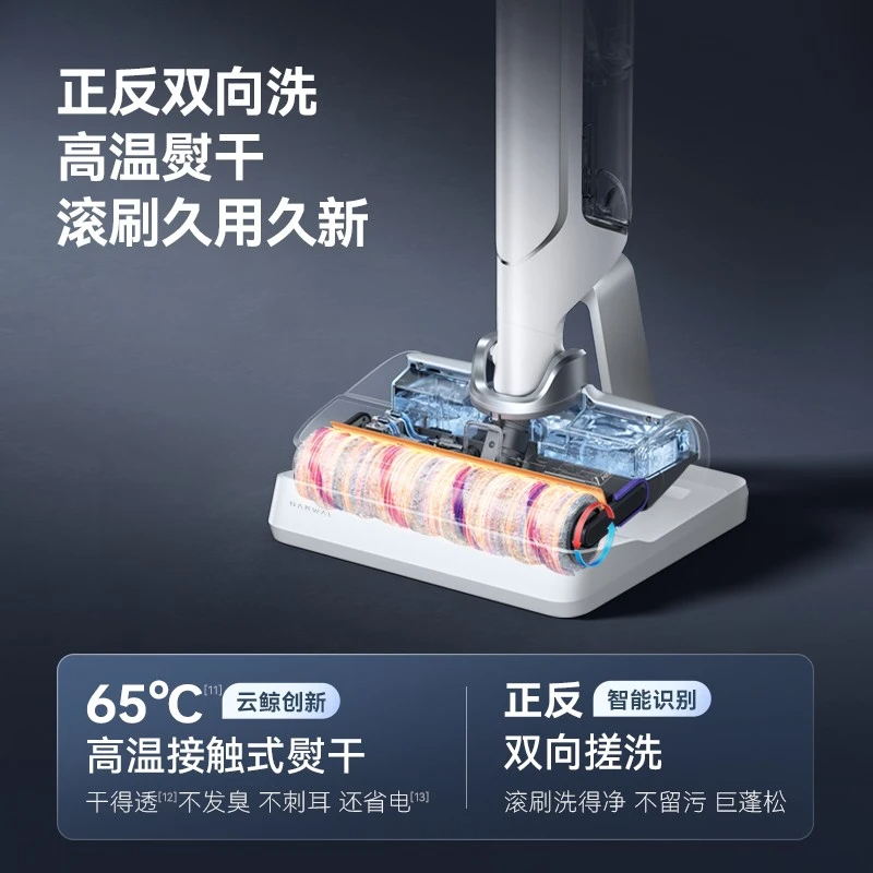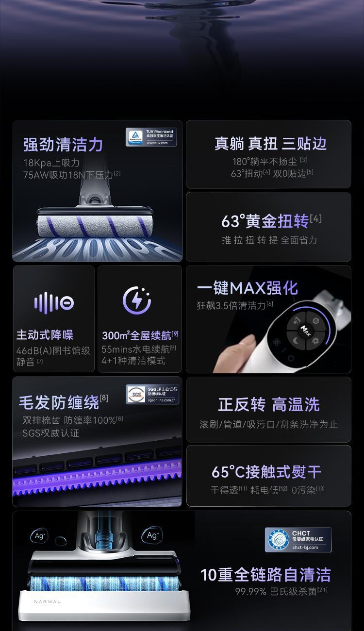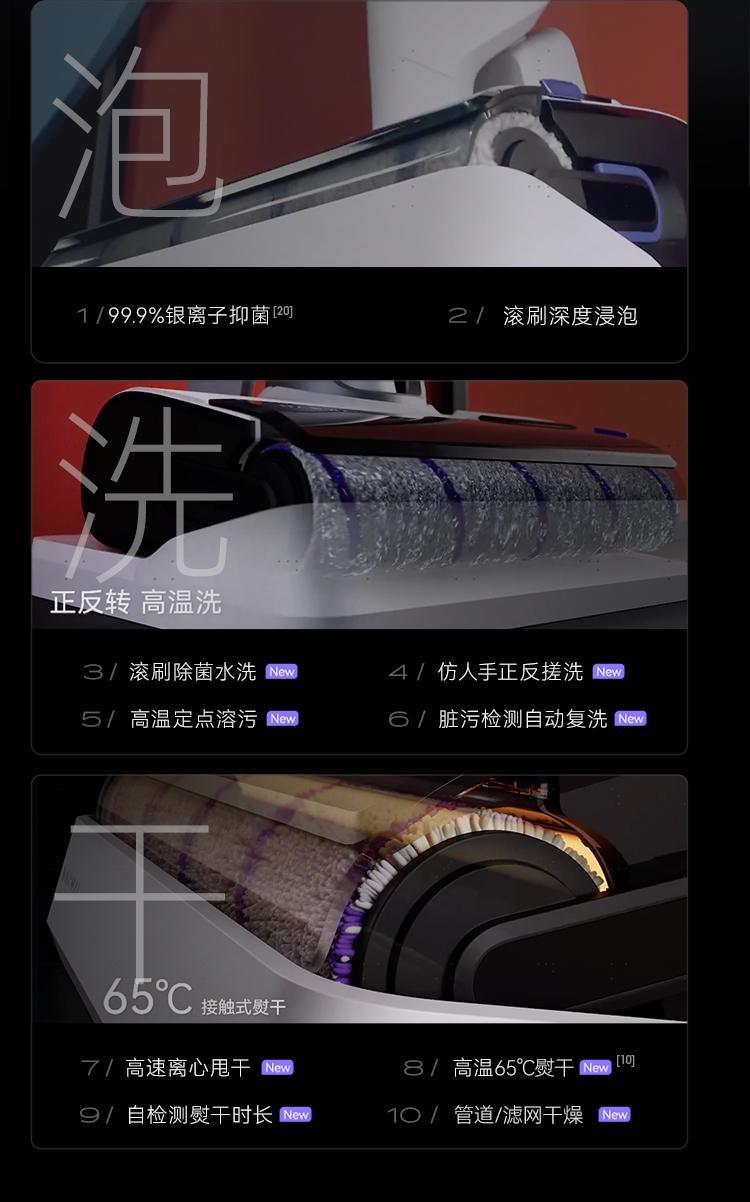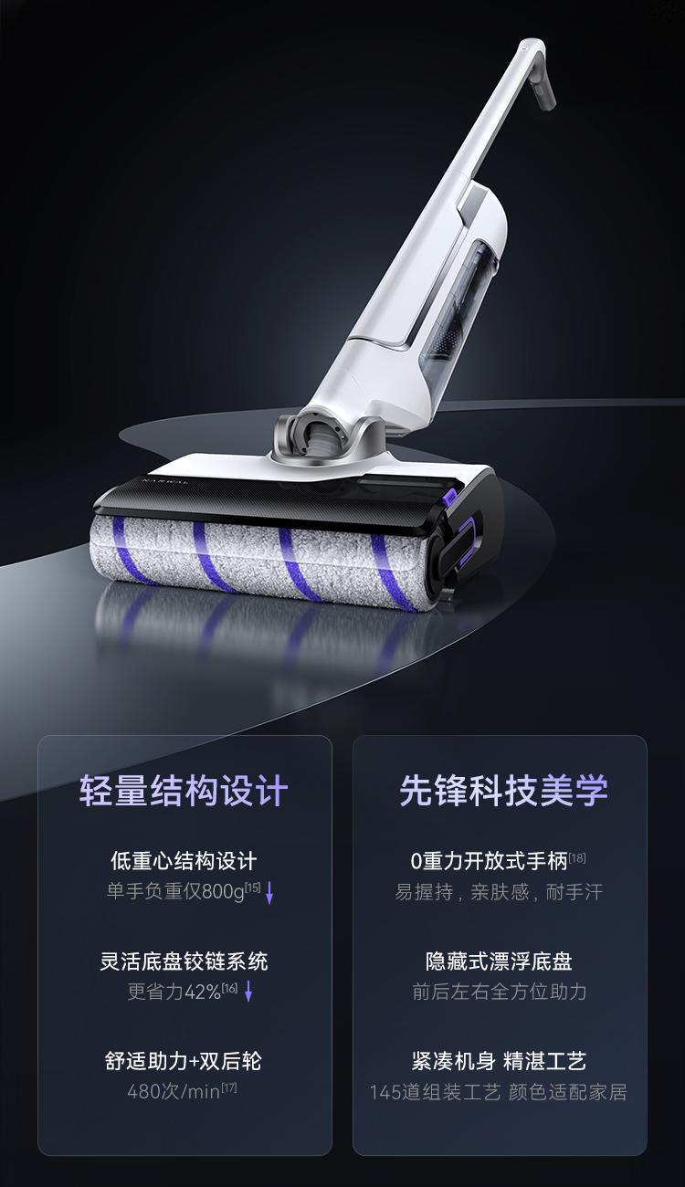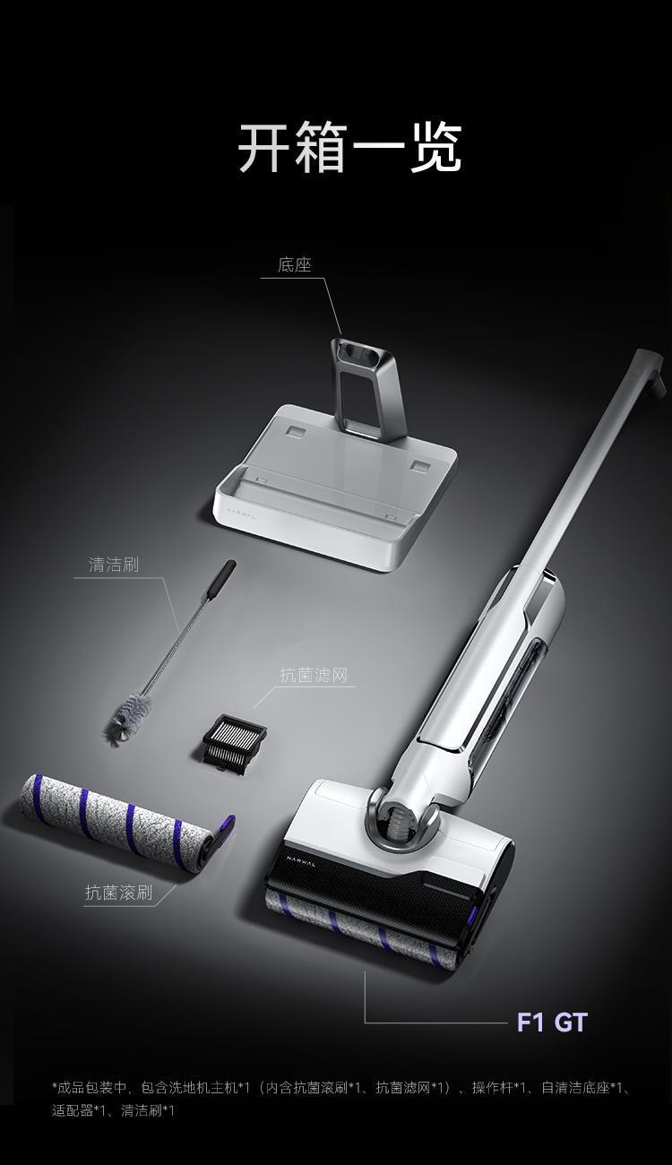 净重 4.7kg 颜色:白色 产品尺寸:洗地机(273*251*1163 mm) 自清洁底座(300*271*225 mm) 包装尺寸:738x332x282mm 吸力18000Pa 180°躺平不扬尘 3 侧贴边 55mins 续航 65℃ 正反熨干低至 40mins 99.9% 银离子 噪音46dB(A)