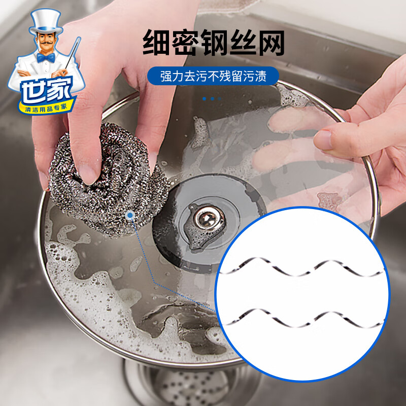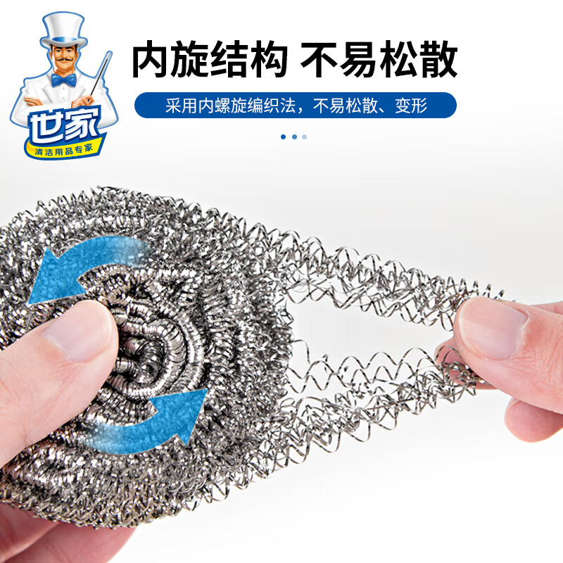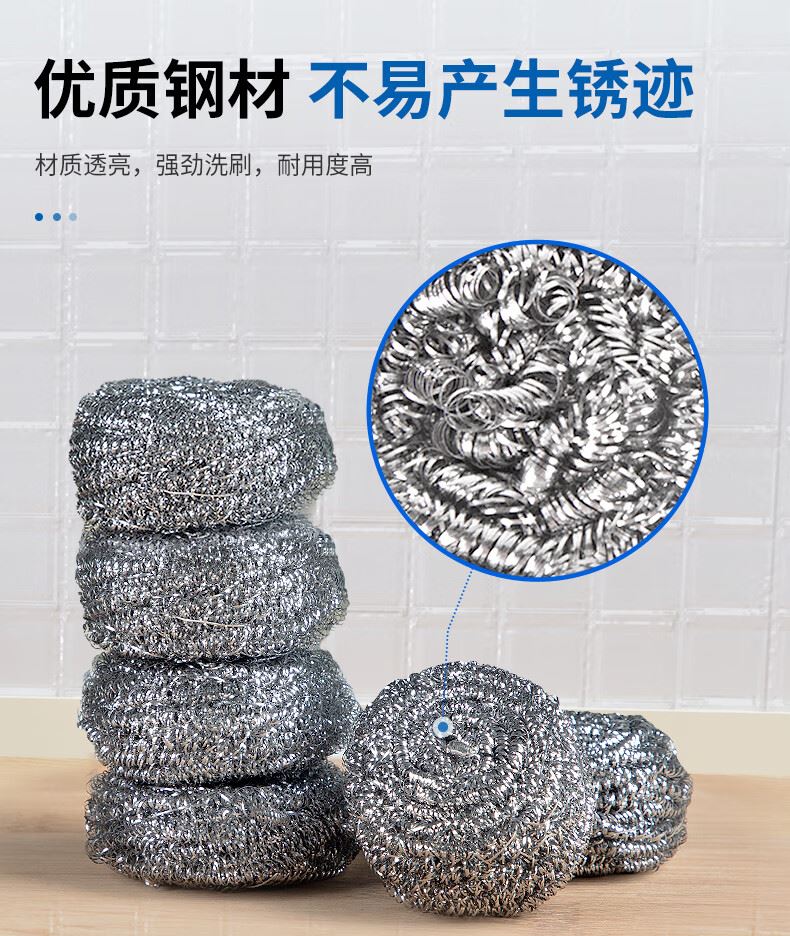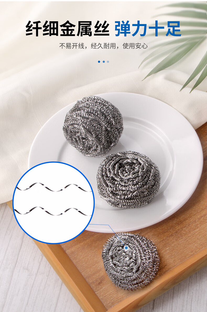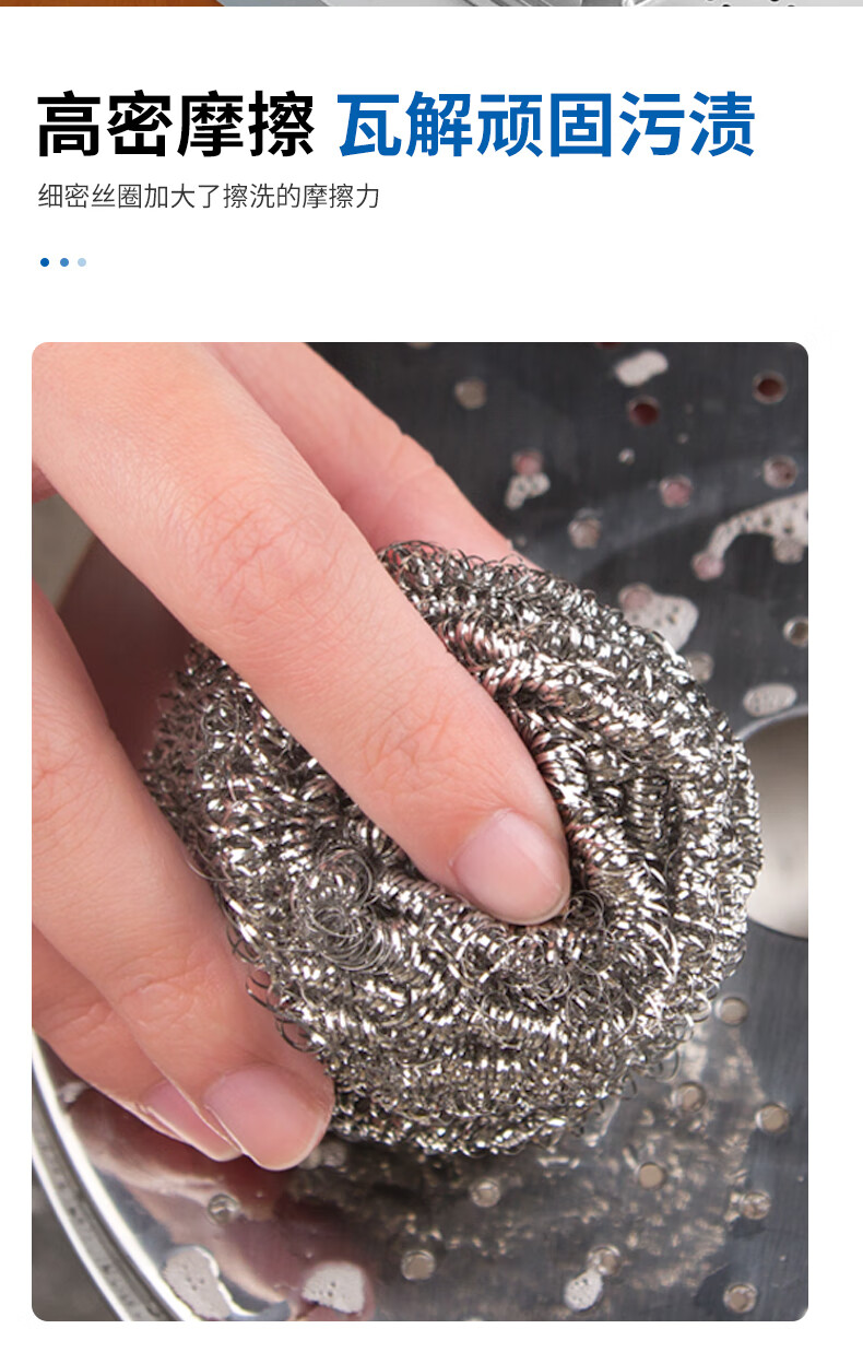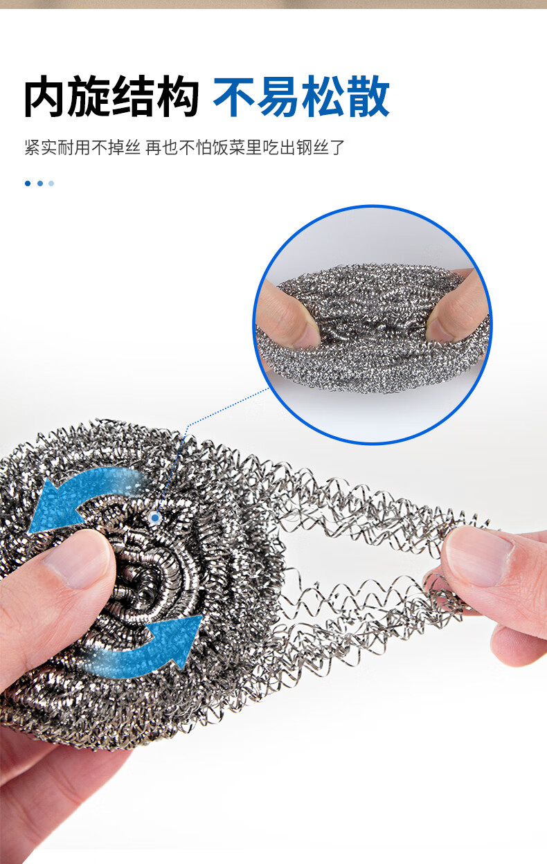 钢丝清洁球,去污实力派 内螺旋设计.擦拭顽固污渍.耐用不易伤手 优质钢材 不易产生锈迹 材质透亮,强劲洗刷,耐用度高 内旋结构不易松散 紧实耐用不掉丝再也不怕饭菜里吃出钢丝了 细密丝网 轻松去污 细密丝圈加大摩擦力,日常清洁省力轻松 高密摩擦 瓦解顽固污渍 细密丝圈加大了擦洗的摩擦力 纤细金属丝 弹力十足 不易开线,经久耐用,使用安心