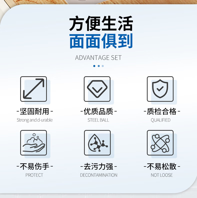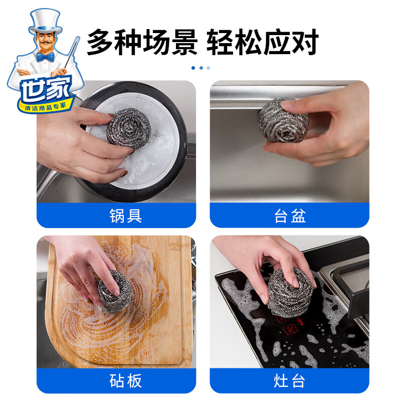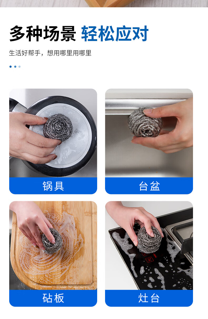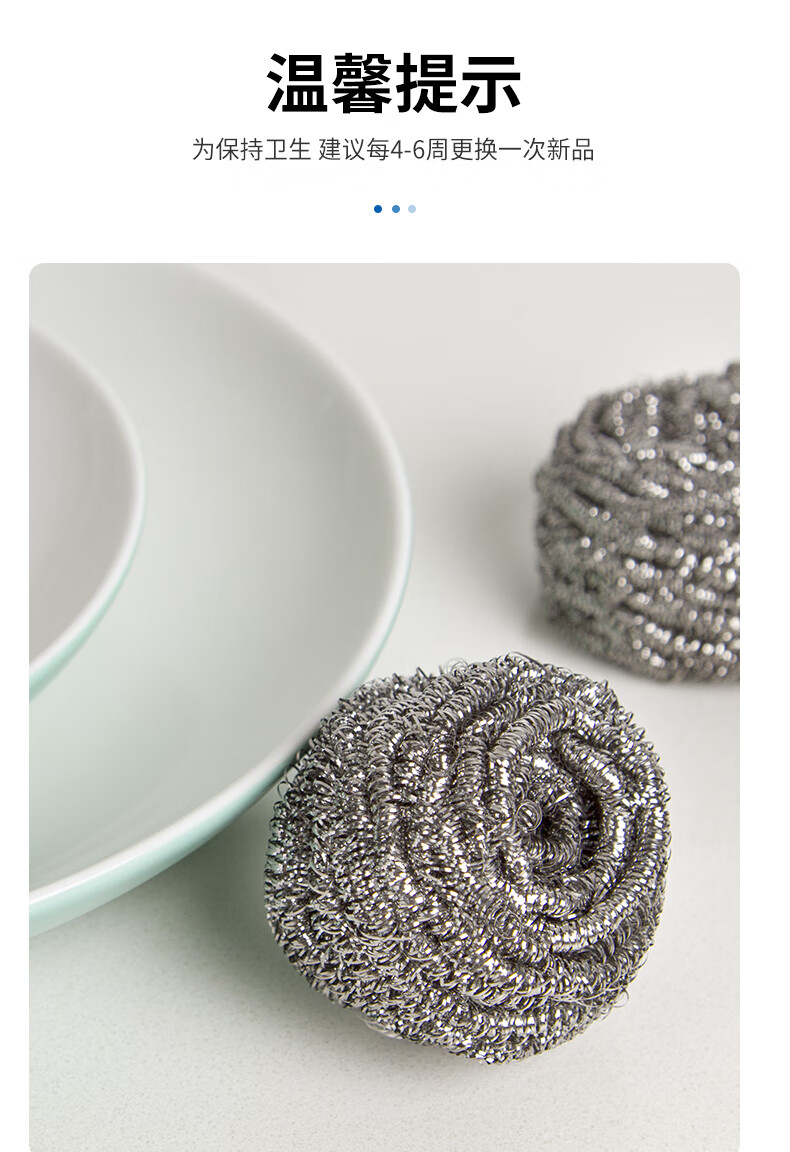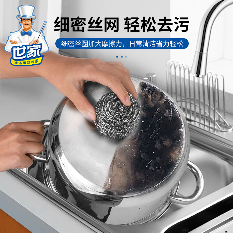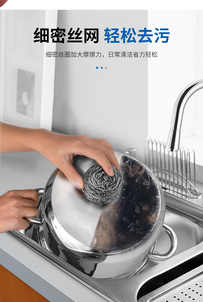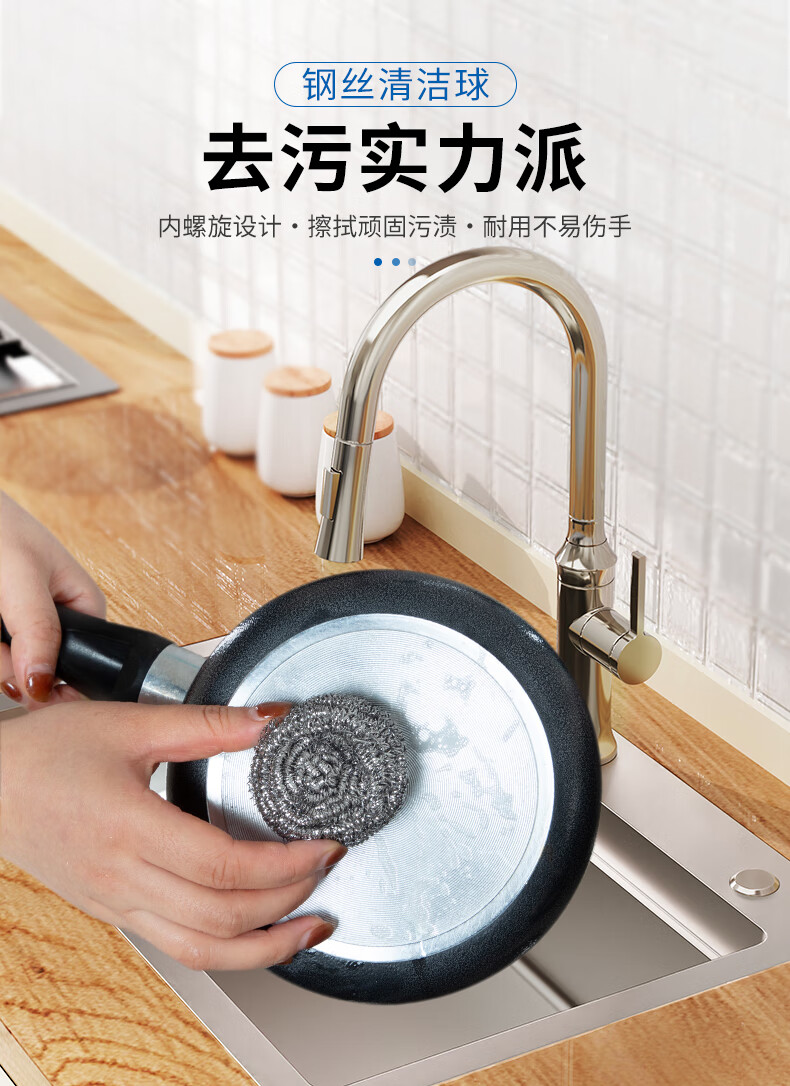 钢丝清洁球,去污实力派 内螺旋设计.擦拭顽固污渍.耐用不易伤手 优质钢材 不易产生锈迹 材质透亮,强劲洗刷,耐用度高 内旋结构不易松散 紧实耐用不掉丝再也不怕饭菜里吃出钢丝了 细密丝网 轻松去污 细密丝圈加大摩擦力,日常清洁省力轻松 高密摩擦 瓦解顽固污渍 细密丝圈加大了擦洗的摩擦力 纤细金属丝 弹力十足 不易开线,经久耐用,使用安心