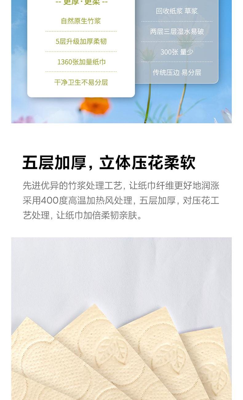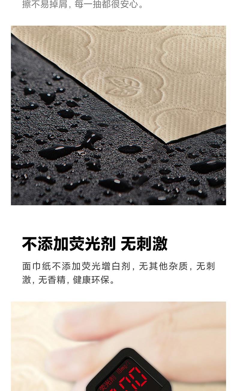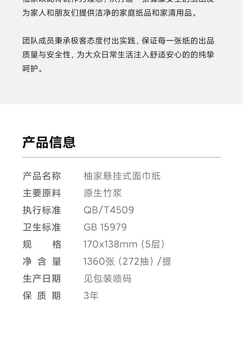 产品规格:170*138mm/张,5层加厚,272抽/提 产品重量:0.4kg左右 主要原料:原生竹浆 产品保质期:3年