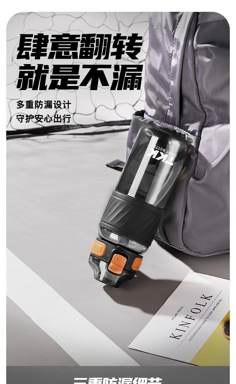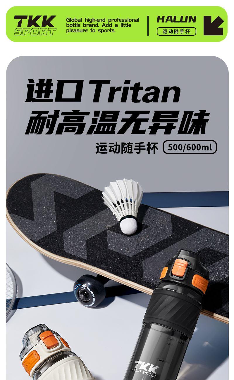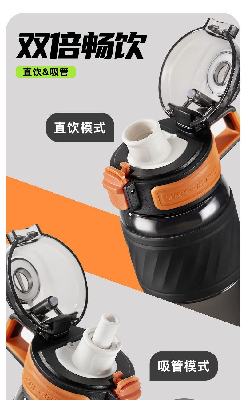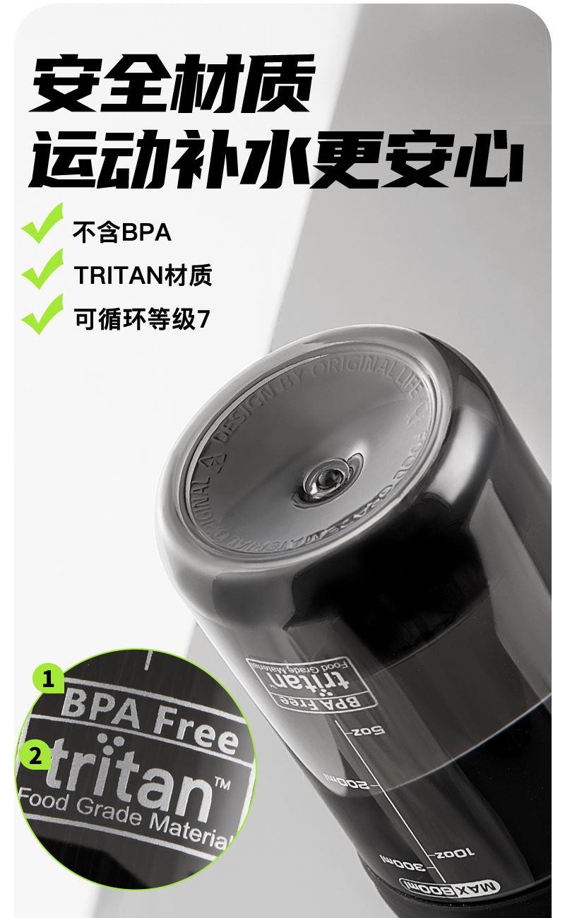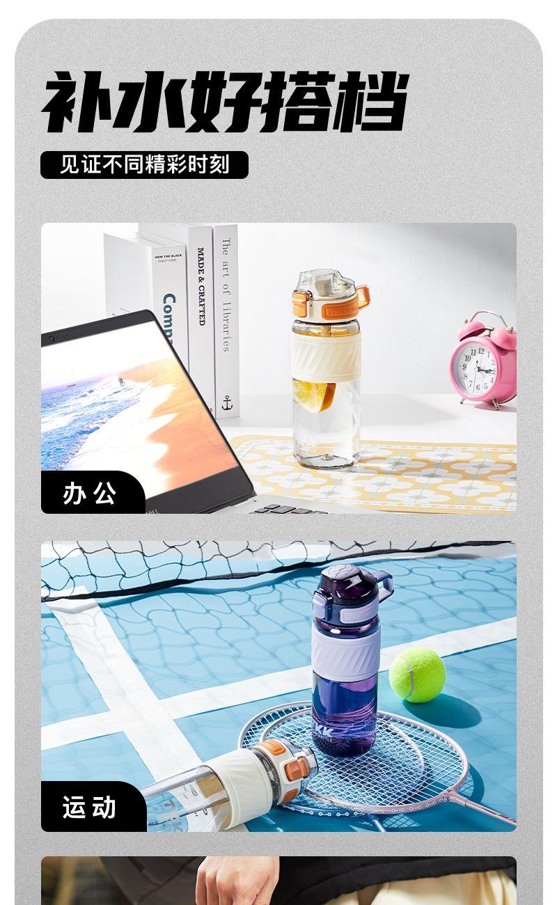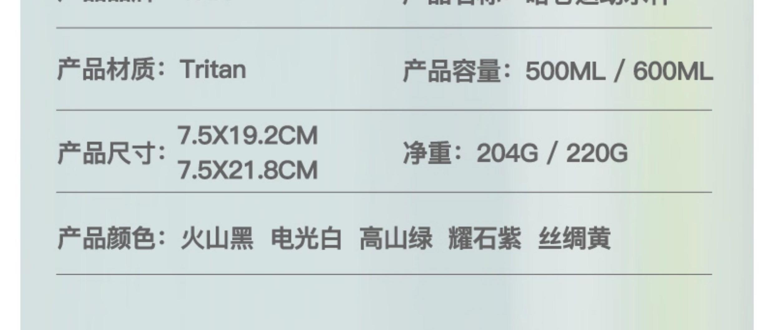商品容量:500ml 杯身材质:tritan 杯盖材质:PP+TPE 商品净重:204g 1.时尚运动感设计直饮杯 ;同时配送一个直饮吸管嘴,2种方式体验不同的喝水感。 2.杯身采用美国伊士曼Tritan进口材料,不含双酚A(BPA),风靡欧美的婴幼儿用品安全材质, 3.按压式一键弹盖, 轻松开合不费力,畅快补水; 4.宽扁的编织带提绳 手感好,外出轻松携带, 即拎即走 5.食品级硅胶防漏圈,密封防漏,安全可靠; 6.可拆卸配件,便于日常清洗,不易藏污纳垢; 7.圆润的饮水口设计,舒适口感,不侧漏不呛喉, 8.安全锁扣 锁紧杯盖,防止杯盖不慎弹开漏水/烫伤,安心无忧; 9.硅胶防滑防烫杯杯套,安心使用;