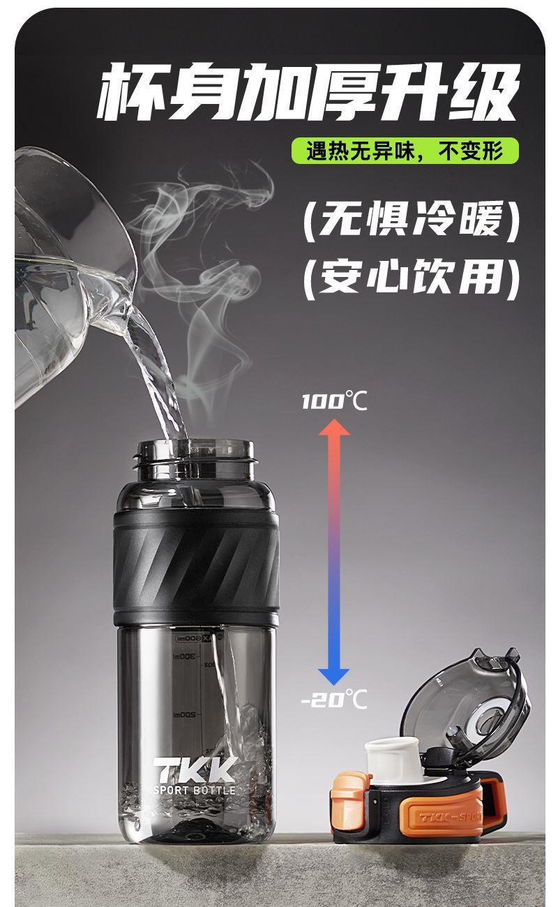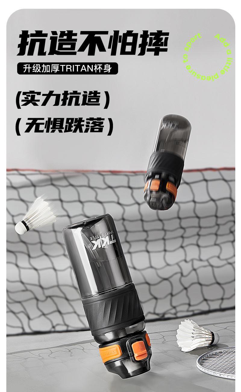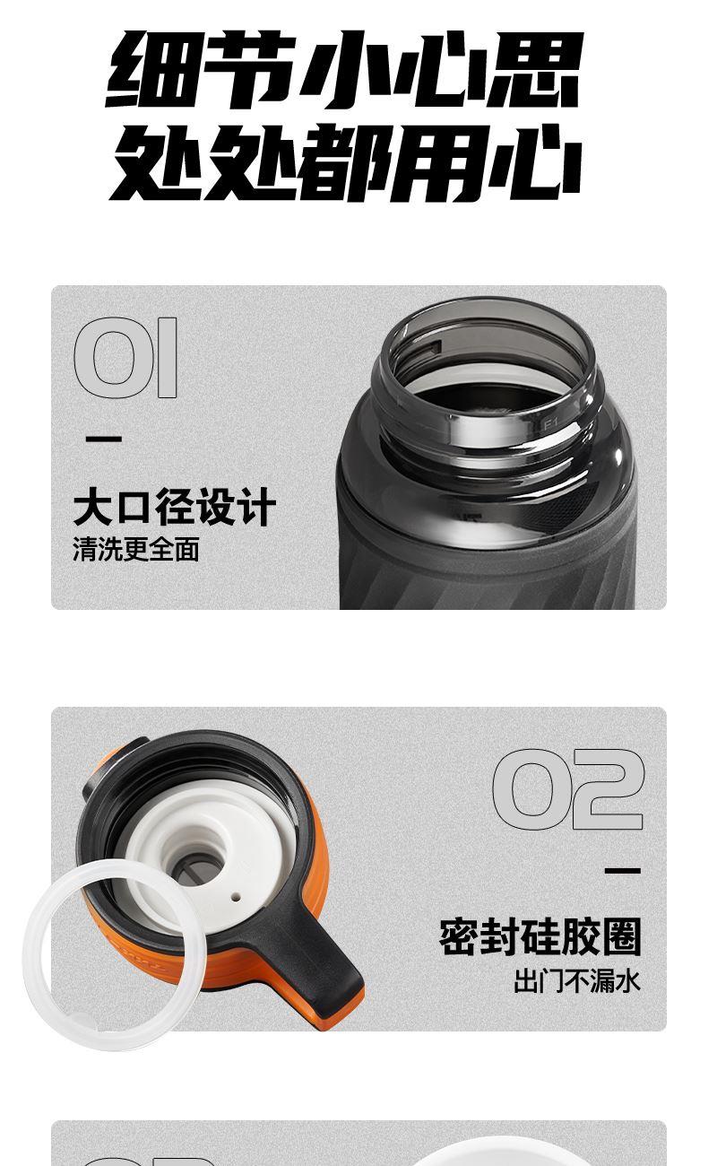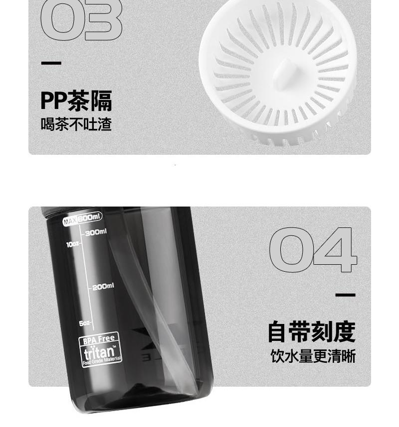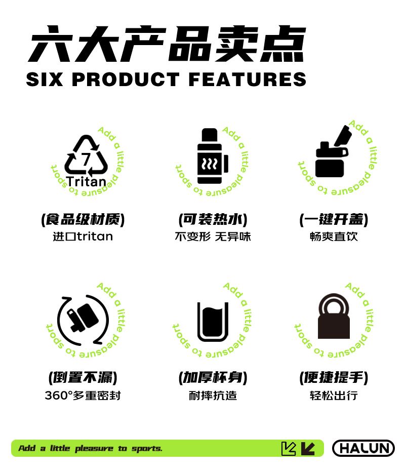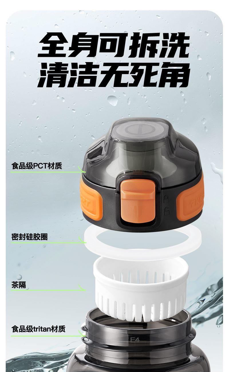 商品容量:500ml 杯身材质:tritan 杯盖材质:PP+TPE 商品净重:204g 1.时尚运动感设计直饮杯 ;同时配送一个直饮吸管嘴,2种方式体验不同的喝水感。 2.杯身采用美国伊士曼Tritan进口材料,不含双酚A(BPA),风靡欧美的婴幼儿用品安全材质, 3.按压式一键弹盖, 轻松开合不费力,畅快补水; 4.宽扁的编织带提绳 手感好,外出轻松携带, 即拎即走 5.食品级硅胶防漏圈,密封防漏,安全可靠; 6.可拆卸配件,便于日常清洗,不易藏污纳垢; 7.圆润的饮水口设计,舒适口感,不侧漏不呛喉, 8.安全锁扣 锁紧杯盖,防止杯盖不慎弹开漏水/烫伤,安心无忧; 9.硅胶防滑防烫杯杯套,安心使用;