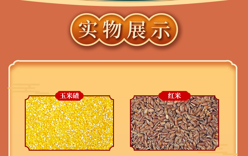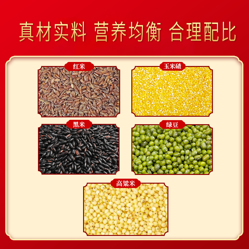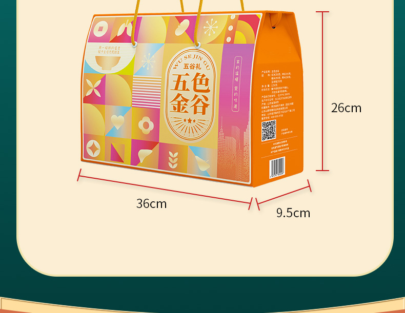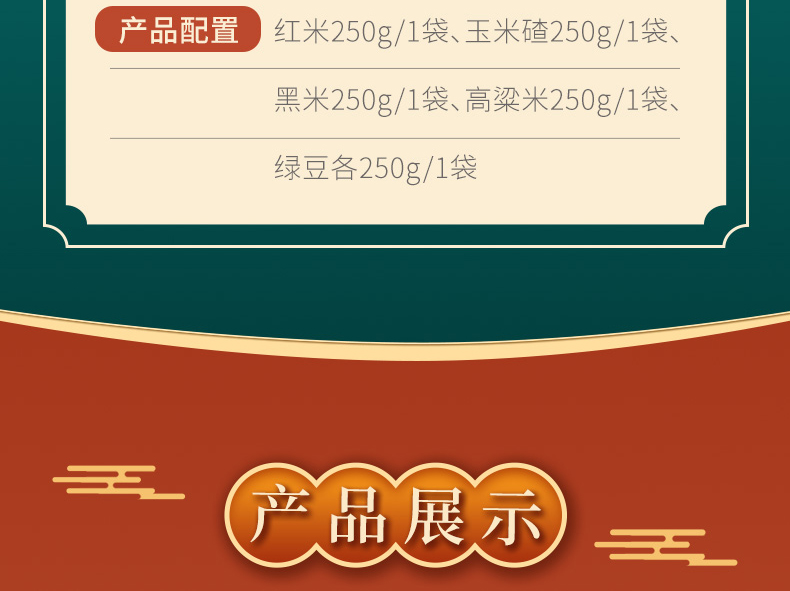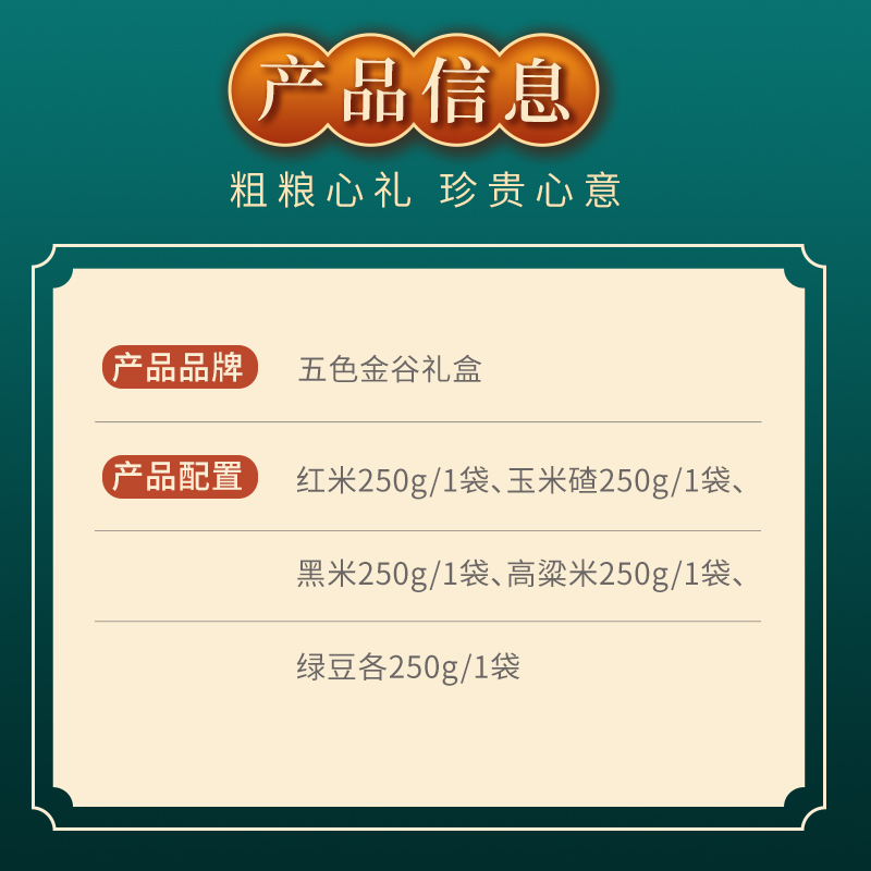 产品规格配置:红米、绿豆、黑米、玉米碴、高粱米(250g*5袋) 盒尺寸:36*9.5*26cm 箱尺寸:60*37.5*54 箱重量:19.2kg 箱体积:0.122方