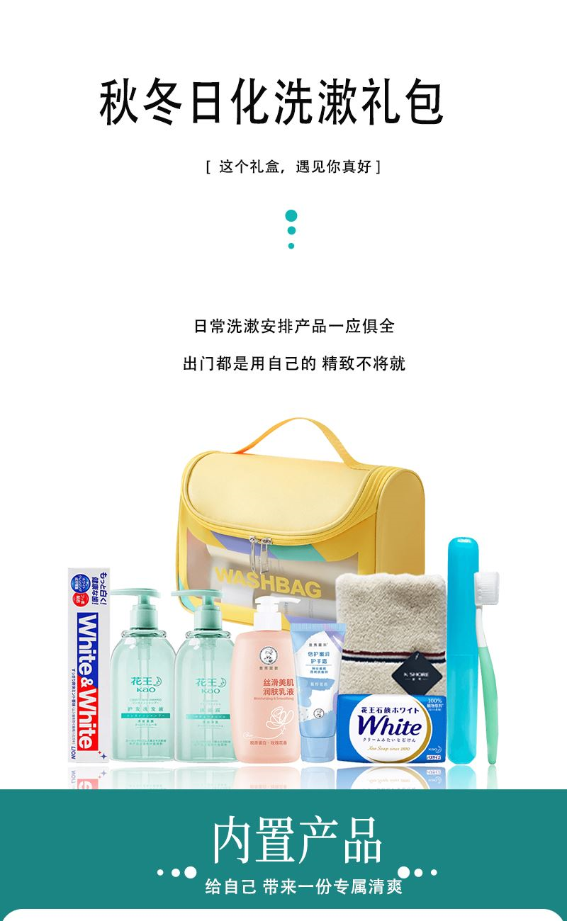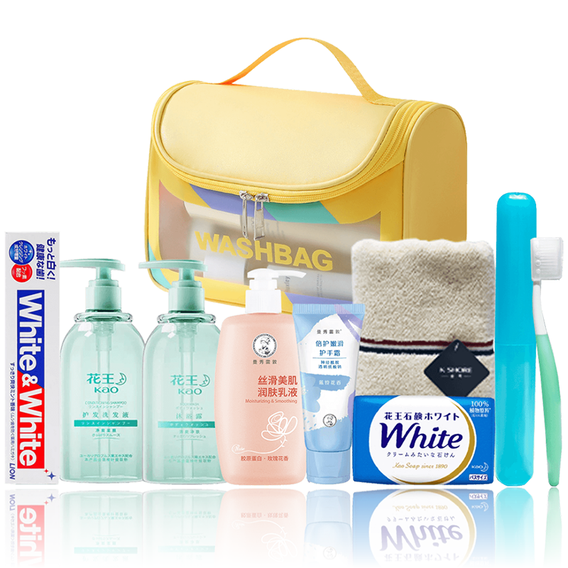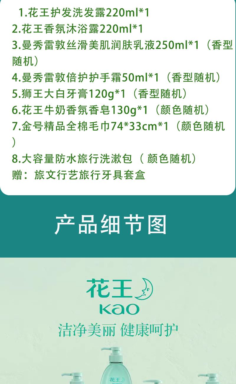 1.花王护发洗发露220ml*1 2.花王香氛沐浴露220ml*1 3.曼秀雷敦丝滑美肌润肤乳液250ml*1(香型随机) 4.曼秀雷敦倍护护手霜50ml*1(香型随机) 5.狮王大白牙膏120g*1(香型随机) 6.花王牛奶香氛香皂130g*1(颜色随机) 7.金号精品全棉毛巾74*33cm*1(颜色随机) 8.大容量防水旅行洗漱包( 颜色随机) 赠:旅文行艺旅行牙具套盒
