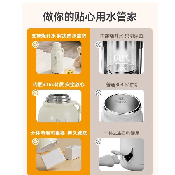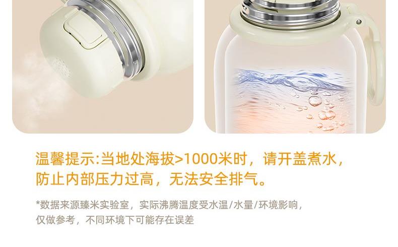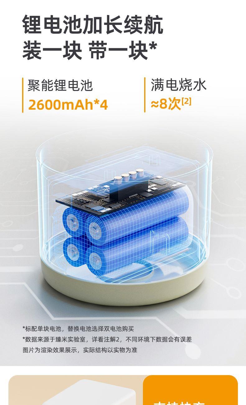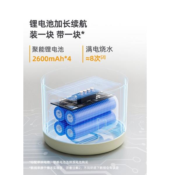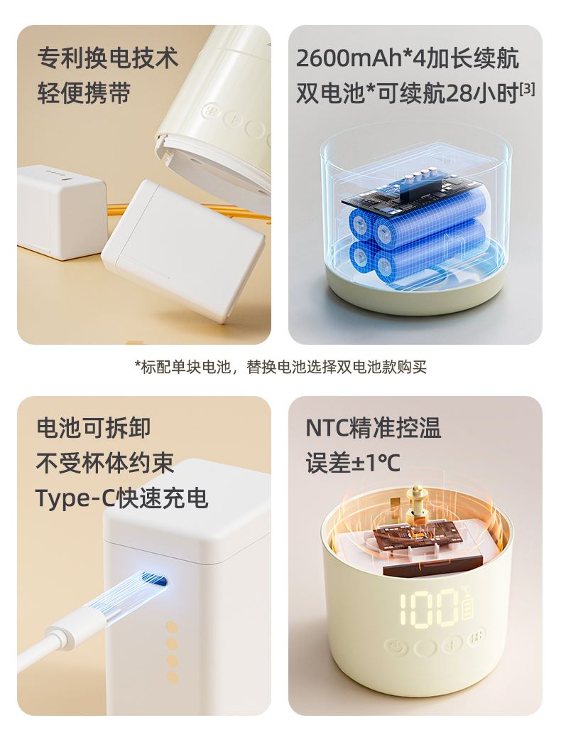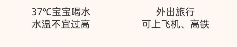37℃、40℃、45℃、50℃、55℃、65℃、100℃ 7档调温; 10400mA超长续航,充一次电可烧15次水; 满电状态下,可烧开一壶水,可以烧开100度; 母婴级316L内胆安全材质; 外置NTC实时控温,误差≤1%; 防水级IPX6,整机可水洗; 外界充电,支持快充; 电池独立芯片含过充、过放保护,超温保护,3C认证安全耐用; 5重测试:耐压、跌落、高低温、温升、非正常测试; 电池组件750°C超高耐温,专用防火材料,使用更安全; 创新换电池技术; 双重防干烧保护;