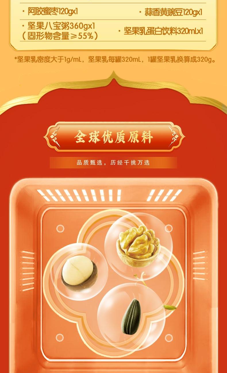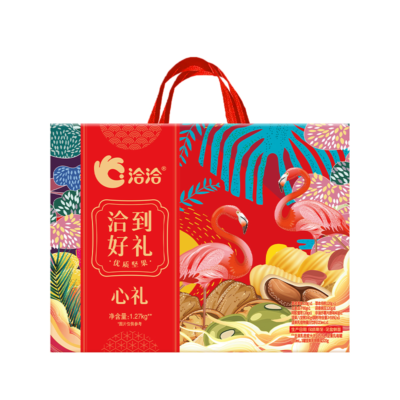 【洽洽】夏威夷果100g 【洽洽】草本核桃120g 【洽洽】五香瓜子90g 【洽洽】蒜香豌豆120g 【洽洽】阿胶蜜枣120g 【洽洽】非油炸薯片原味40g 【洽洽】坚果乳320mL 【洽洽】坚果八宝粥360g 名物礼盒:380*290*120mm