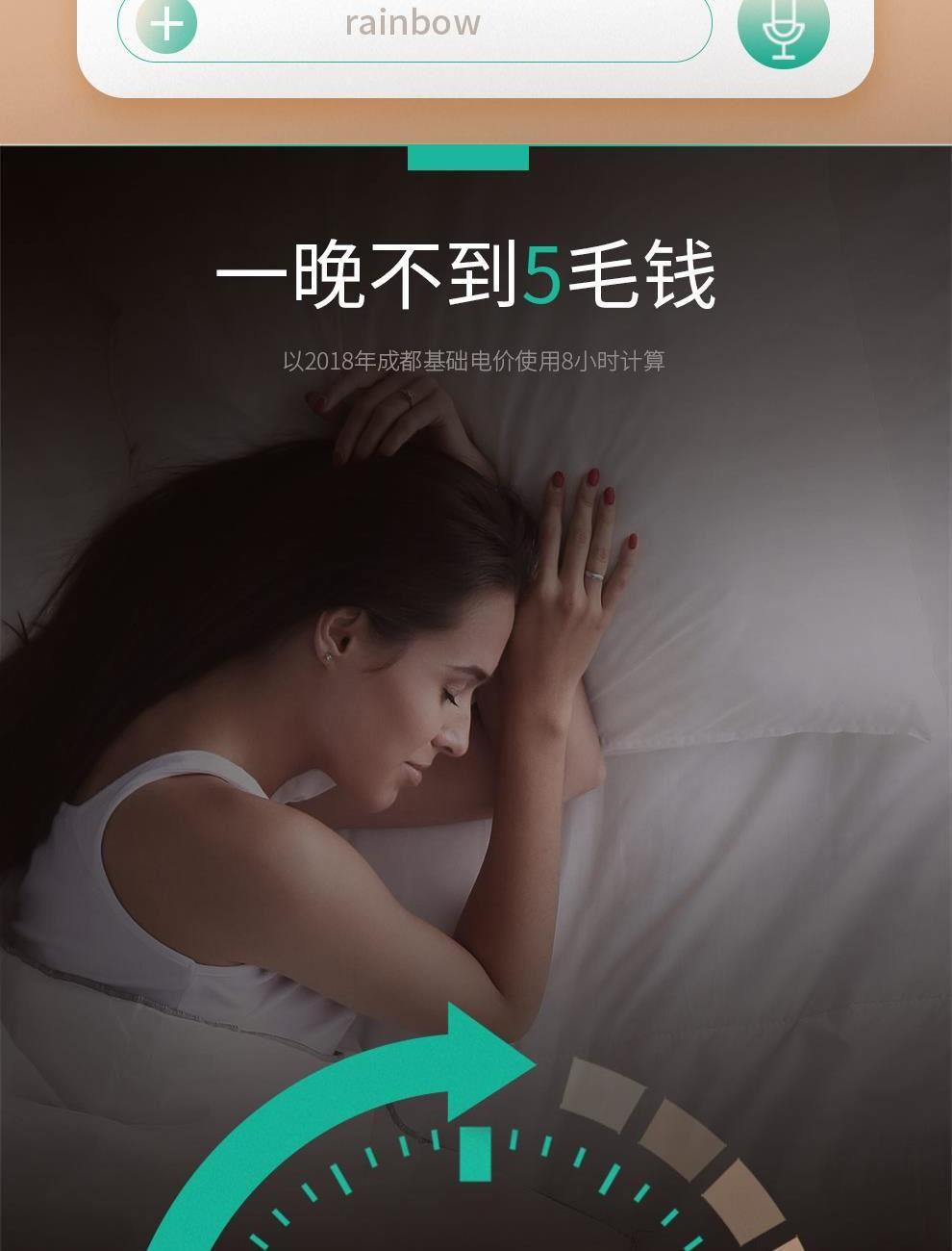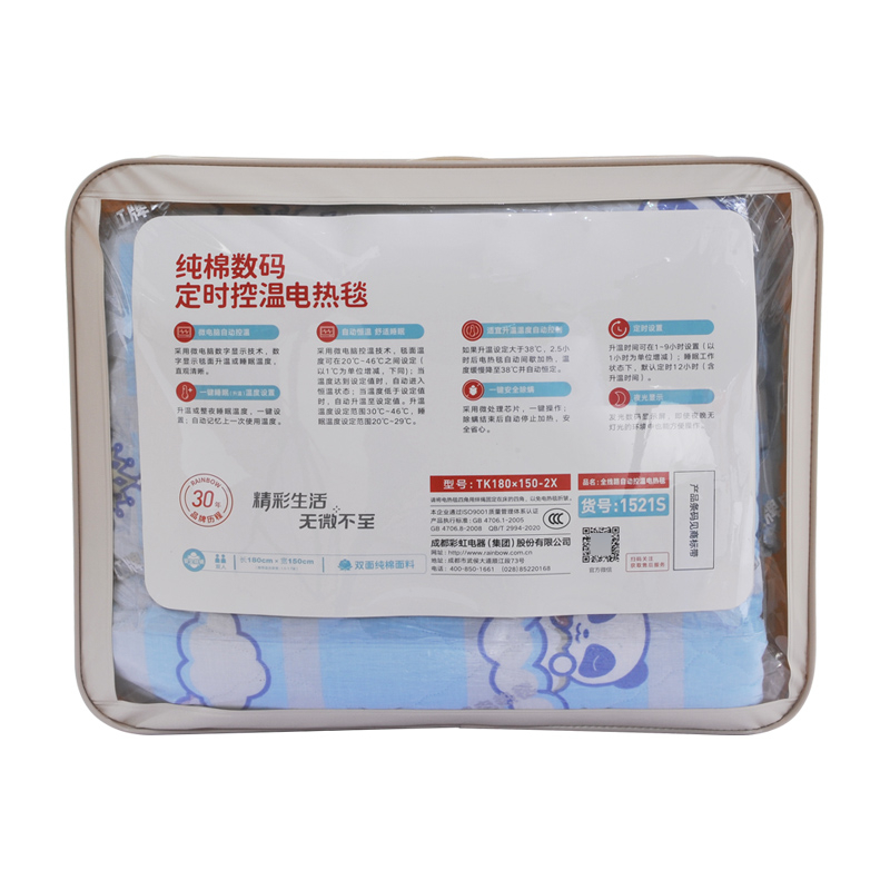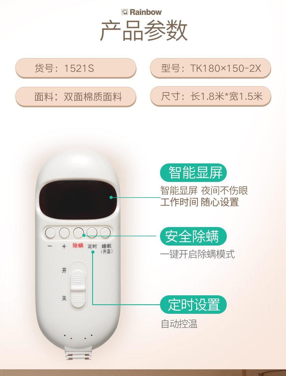 参数 型号:TK180×150-2X 功率:140W 功能:20-46℃广域控温,1度1调;1-9小时定时,12小时自动停止加热、一键舒睡、一键除螨 面料:双面纯棉 包装:箱包 卖点 1、20-46℃数显控温,1度1调 2、智能感温,自动恒温 3、一键舒睡 4、1-9小时定时,12小时自动停止加热 5、一键安全除螨 6、温度记忆 7、每晚不到1度电