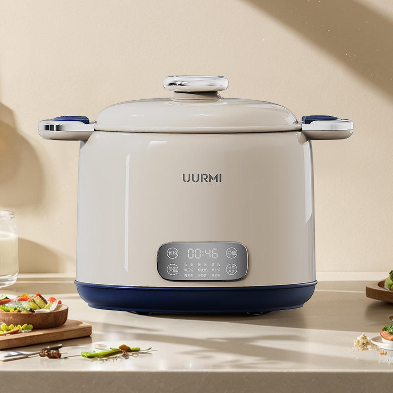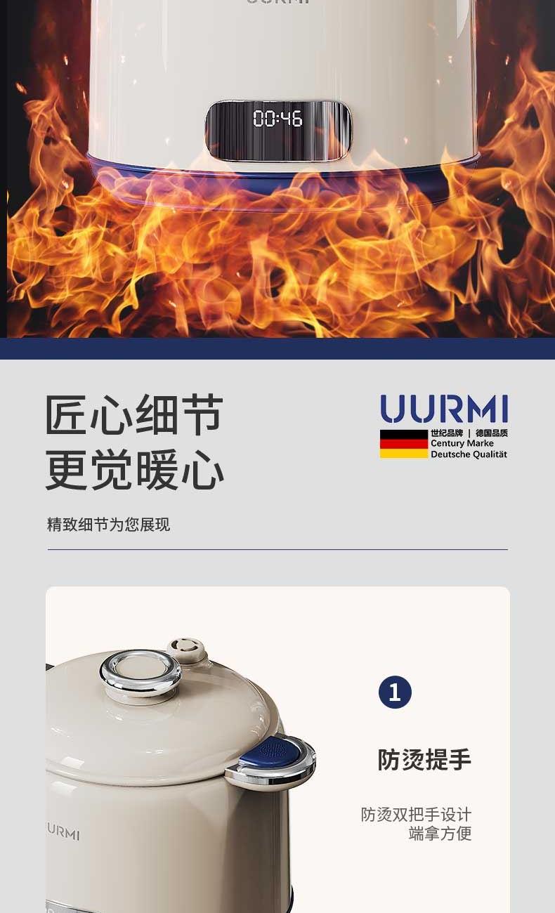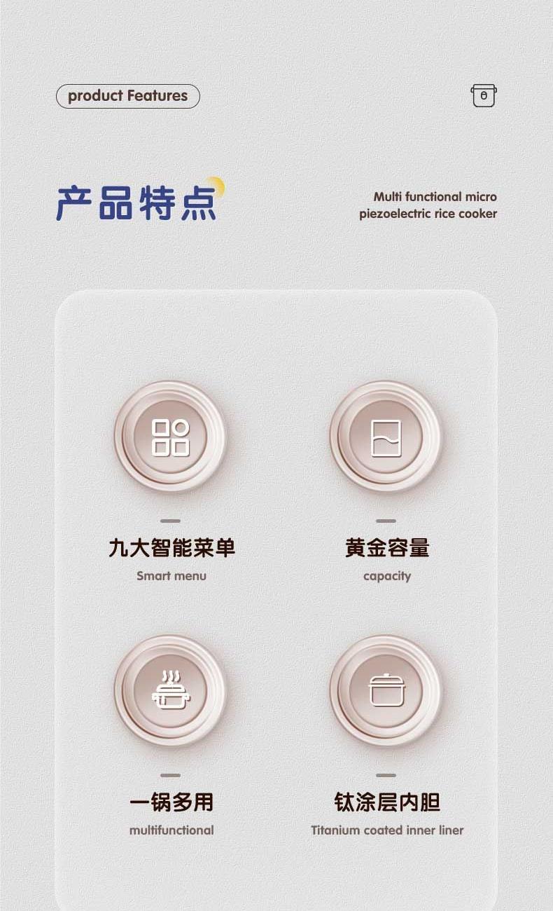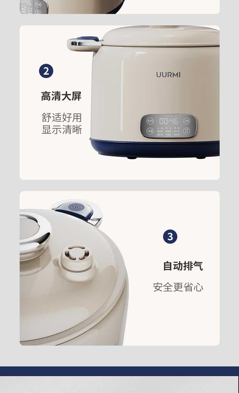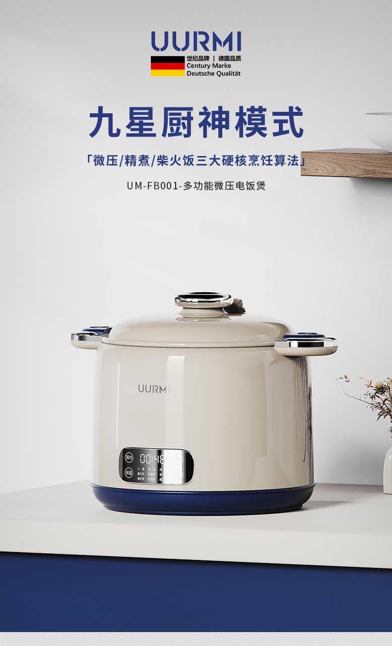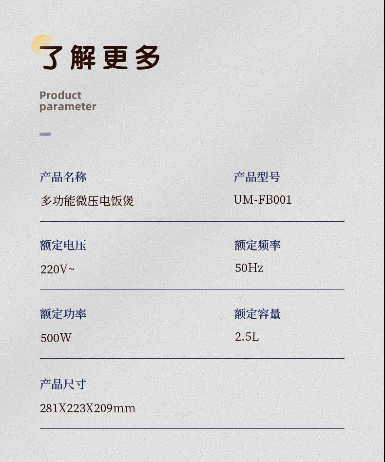 产品型号:UM-FB001 额定功率: 500W 额定电压: 220V 额定频率: 50Hz 容产品量: 2.5L 净重1.1kg 毛重1.49kg 内胆材质:410 能效等级:3级 压力值:1000 电源线长:0.75m 产品材质:PP+430不锈钢喷钛 产品尺寸:281*223*209mm 彩盒尺寸:250*250*208mm 邮购箱尺寸:262*262*223mm 智能六大菜单:微压饭、精煮饭、柴火饭、煲汤、火锅、炖肉; 黄金容量,花式承包一日三餐; 一锅多用,尽享美食; 预约保温来待命,时间轻松掌控; 防烫双把手设计,端拿升级陶瓷油内胆,导热储热快,不粘锅身。