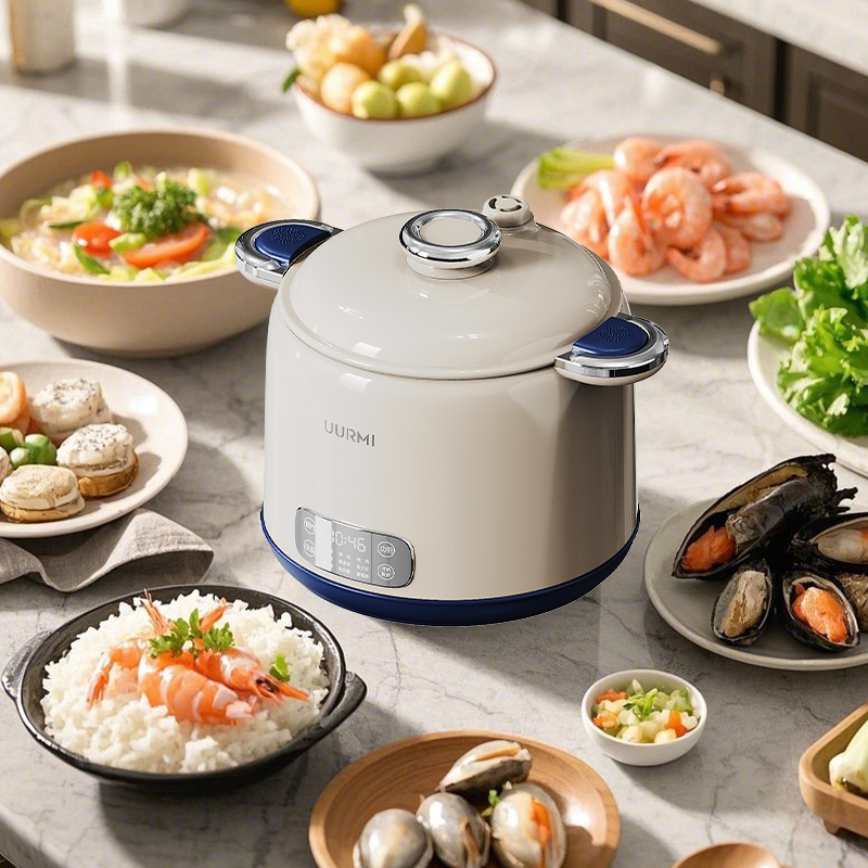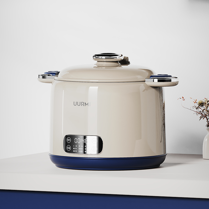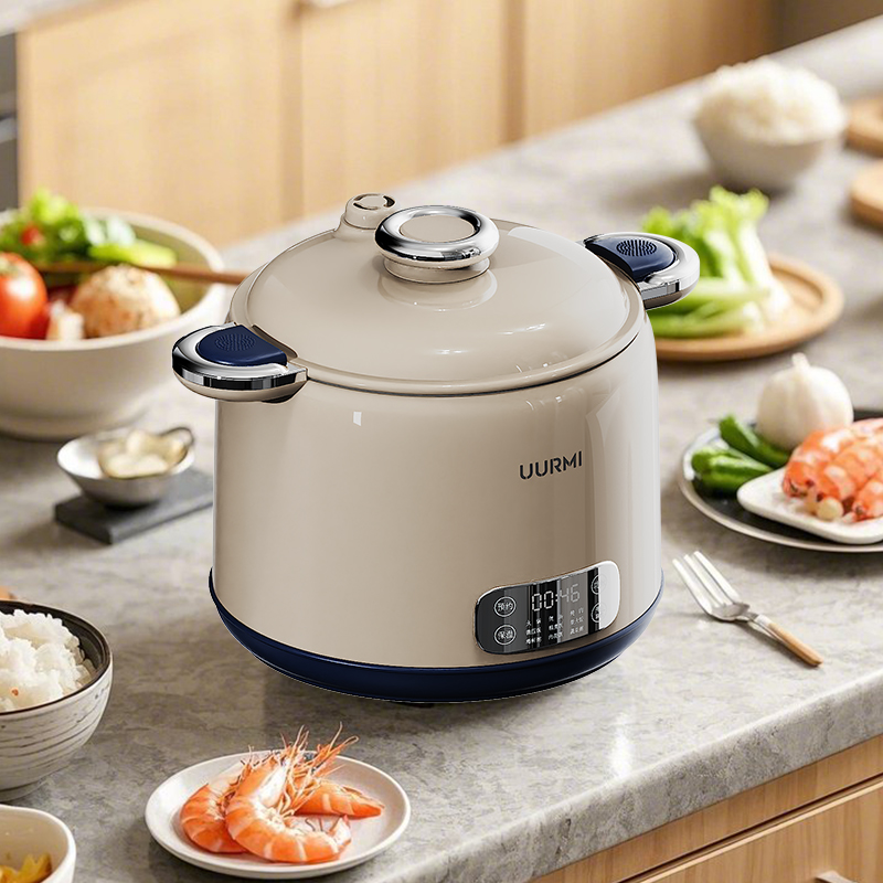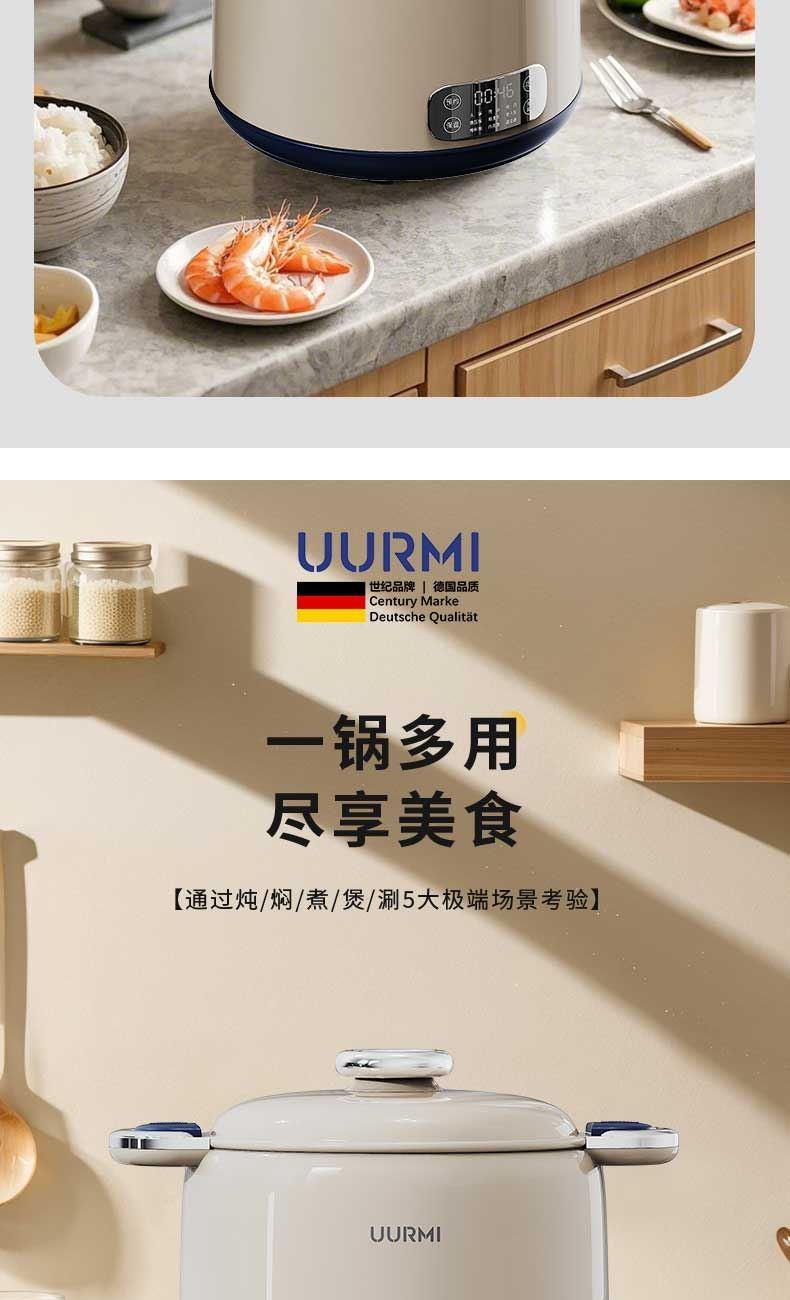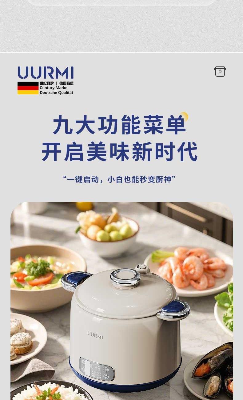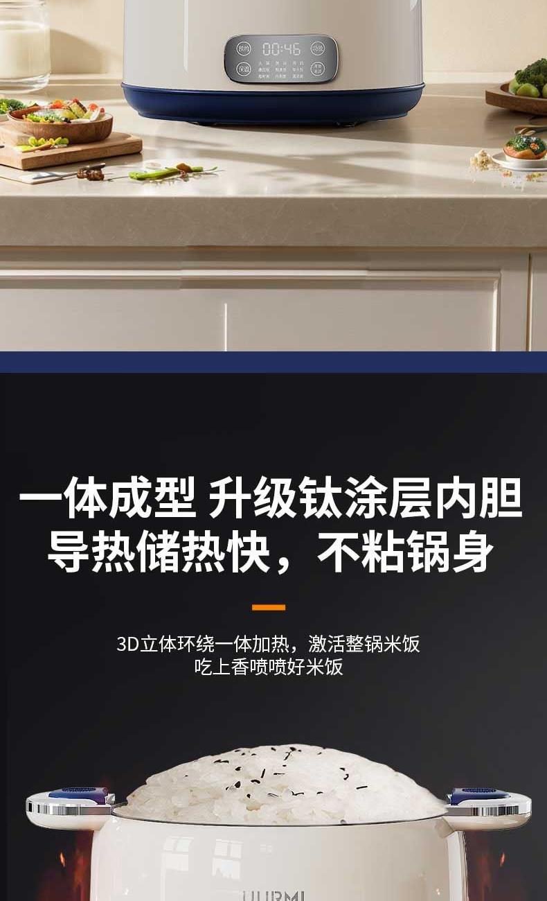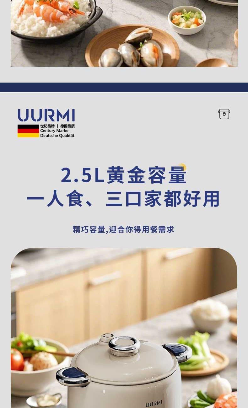 产品型号:UM-FB001 额定功率: 500W 额定电压: 220V 额定频率: 50Hz 容产品量: 2.5L 净重1.1kg 毛重1.49kg 内胆材质:410 能效等级:3级 压力值:1000 电源线长:0.75m 产品材质:PP+430不锈钢喷钛 产品尺寸:281*223*209mm 彩盒尺寸:250*250*208mm 邮购箱尺寸:262*262*223mm 智能六大菜单:微压饭、精煮饭、柴火饭、煲汤、火锅、炖肉; 黄金容量,花式承包一日三餐; 一锅多用,尽享美食; 预约保温来待命,时间轻松掌控; 防烫双把手设计,端拿升级陶瓷油内胆,导热储热快,不粘锅身。