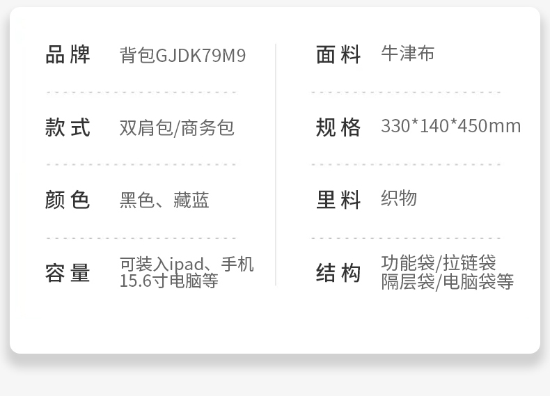 类别:双肩包 颜色:藏蓝色/黑色 面料:织物 里料:织物 闭合方式:拉链 尺寸:330*140*450mm 吊牌价 :530元 包袋大小:中包 适用场景:日常包 适用人群:男女通用
