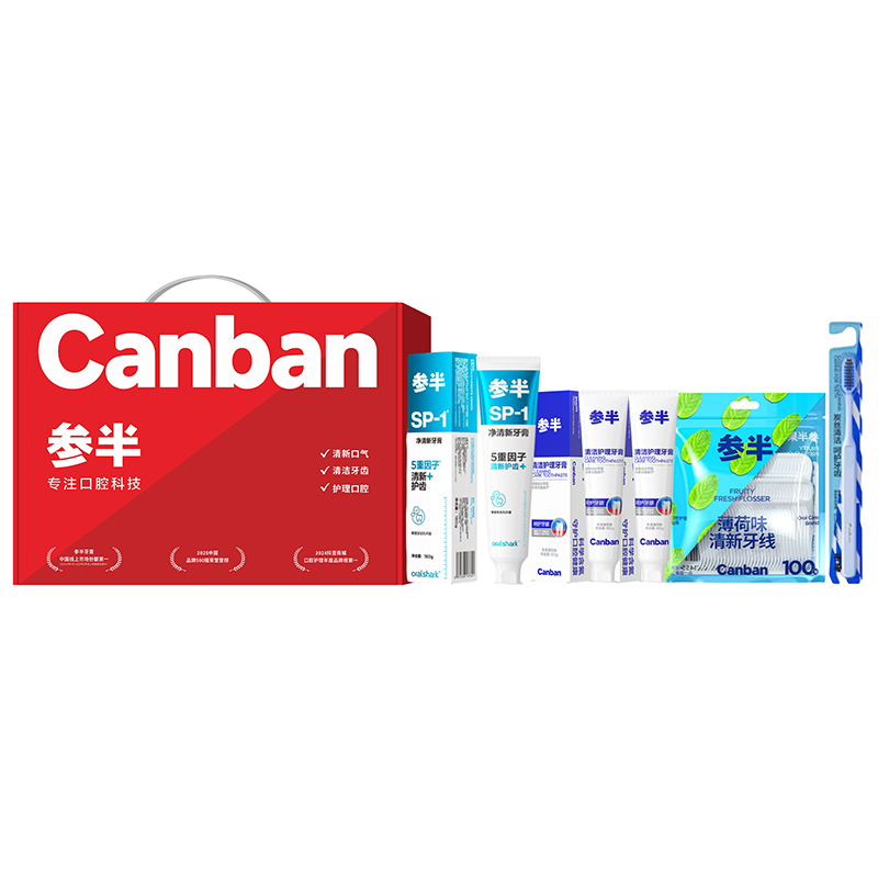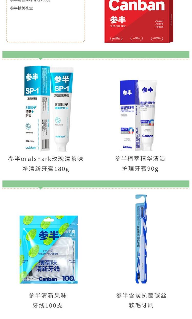 参半oralshark玫瑰清茶味净清新牙膏180g 参半植萃精华清洁护理牙膏90g 参半植萃精华清洁护理牙膏90g 参半含炭碳丝软毛牙刷 参半清新果味牙线100支 思珀莱精美礼盒
