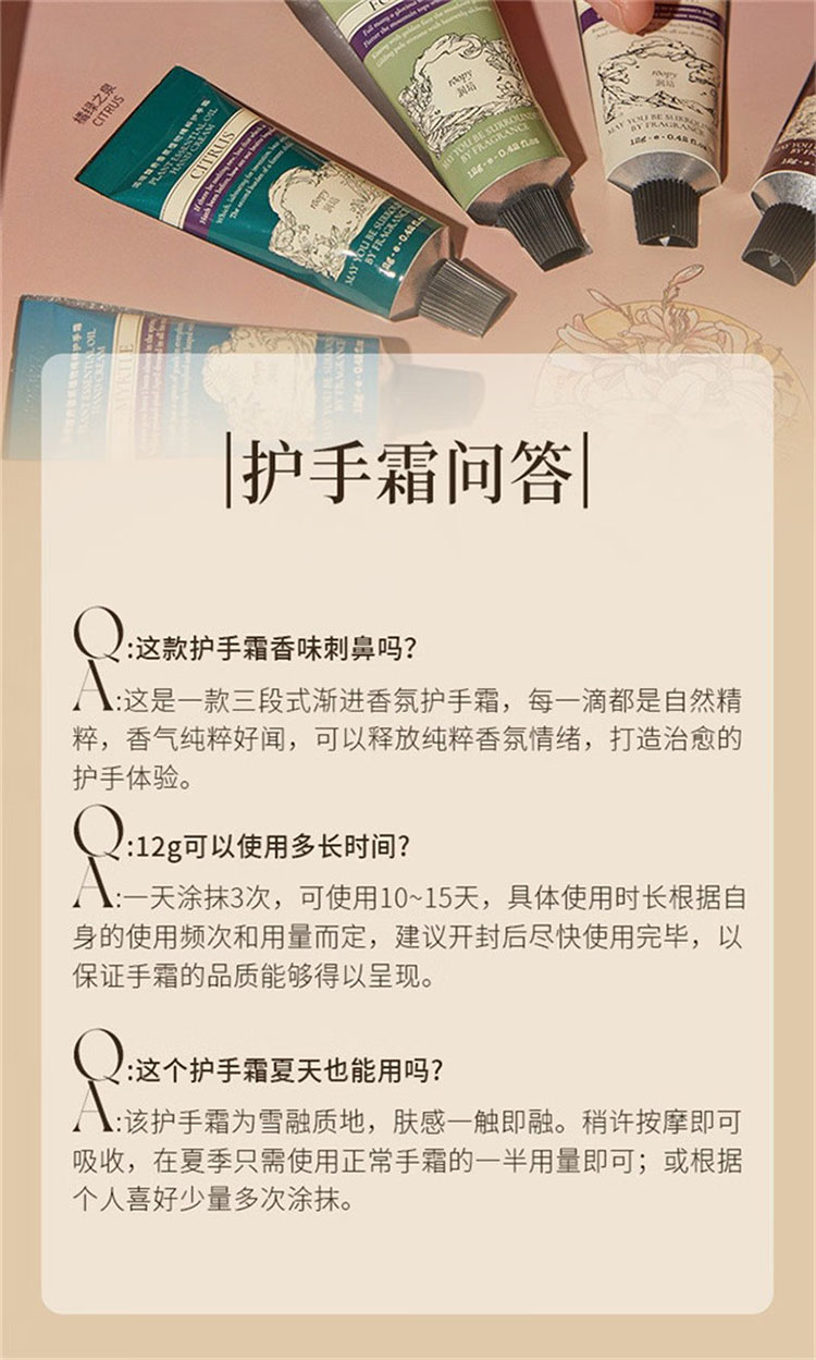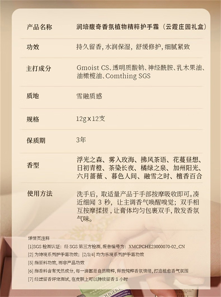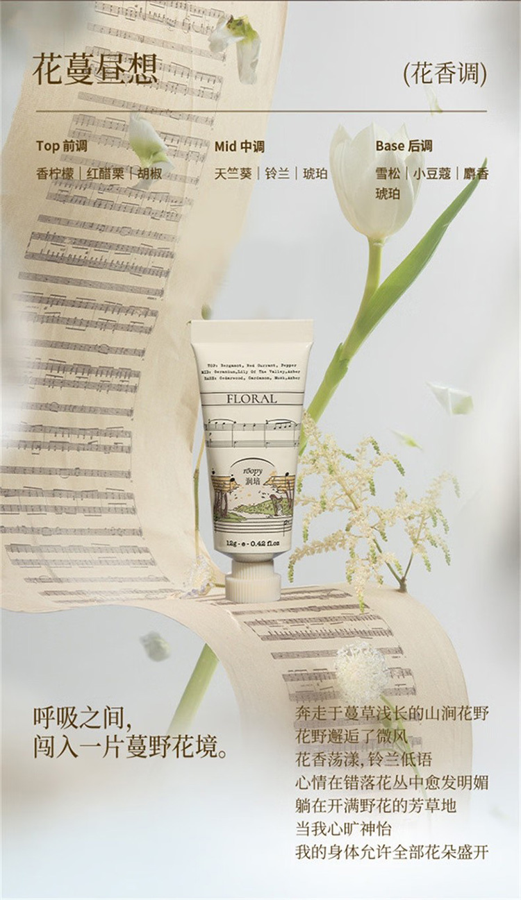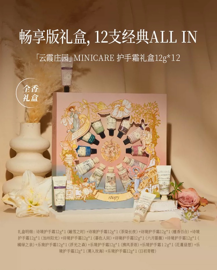 内含: 加州阳光12g*1 橘绿之泉12g*1 茶染长夜12g*1 融雪之时12g*1 檀香百合12g*1 暮色人间12g*1 六月蔷薇12g*1 雾入玫海12g*1 花蔓昼想12g*1 浮光之森12g*1 拂风茶语12g*1 日初青橙12g*1 12支礼盒装,补水护肤 适合自用送礼旅行携带方便