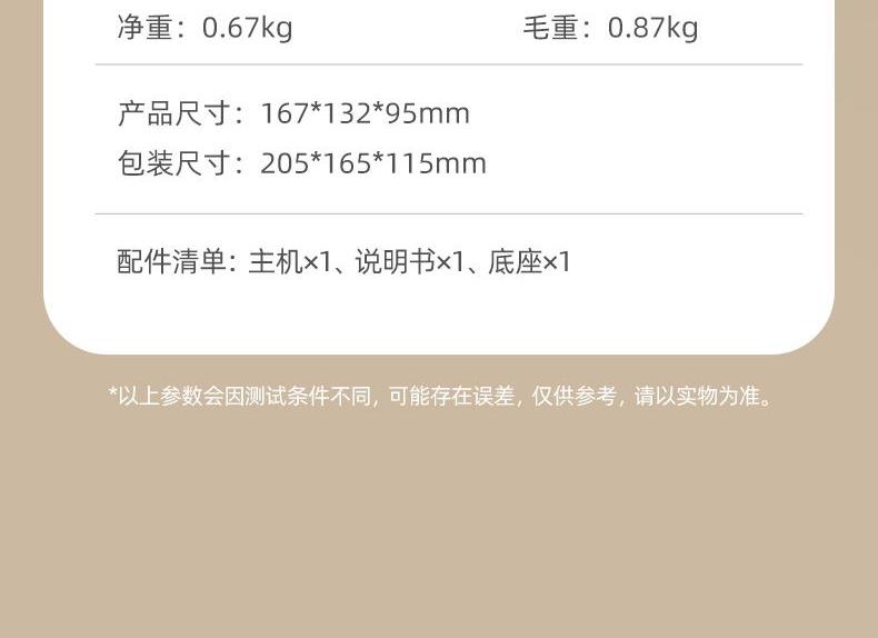 主要材质:合金+PP+铸铝 电压:220V 功率:1000W 容量:70ml 颜色:里米尼白 1、小巧便携,干湿双熨 2、一键开关,高效熨烫 3、mini身材收纳方便不占地 4、微增压蒸汽;快速定型、除皱 5、安全防烫底座;操作简单不繁琐 6、1000W大功率,30秒热快速出汽 7、70ML可拆洗透视水箱,一箱水可熨多件衣服 单台净重:0.6 单台毛重:0.8 裸机:167*132*95