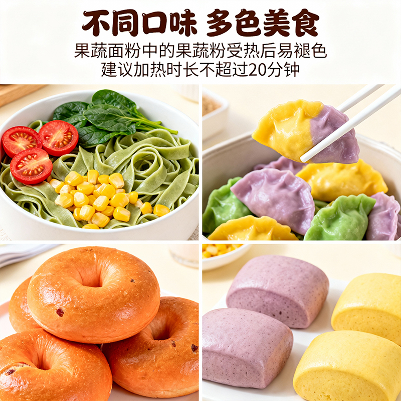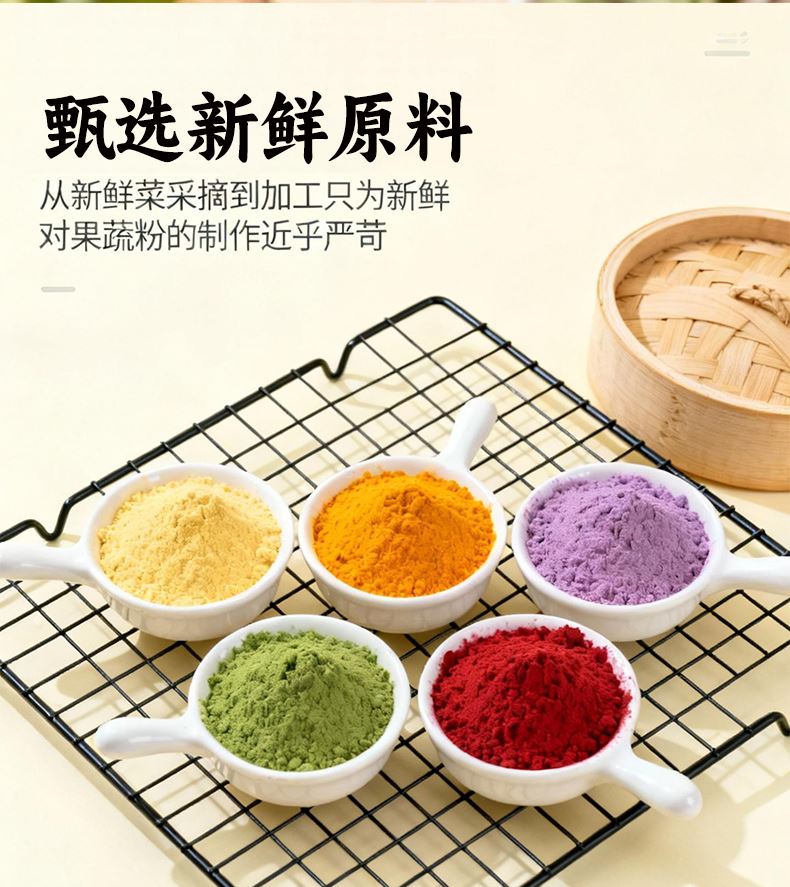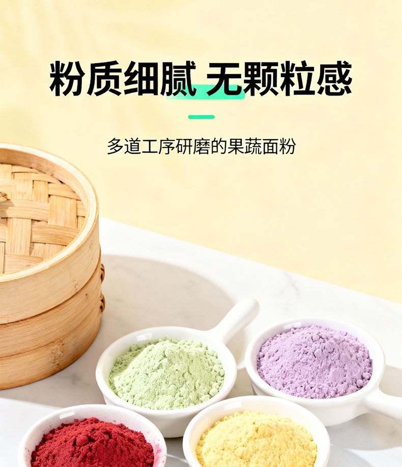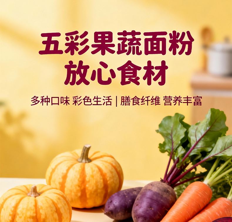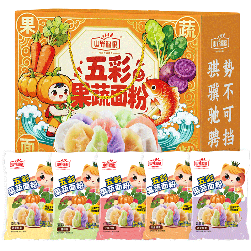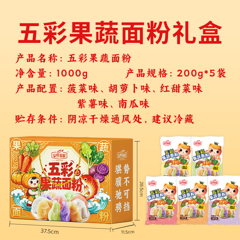 礼盒:五彩果蔬面粉 净含量:1000g 产品规格配置:菠菜味、胡萝卜味、红甜菜味、紫薯味、南瓜味(200g*5袋) 盒尺 寸:37.5*11.5*28.5 箱视箱尺寸:49*40*59 体积:0.12方 箱重量:11.4kg