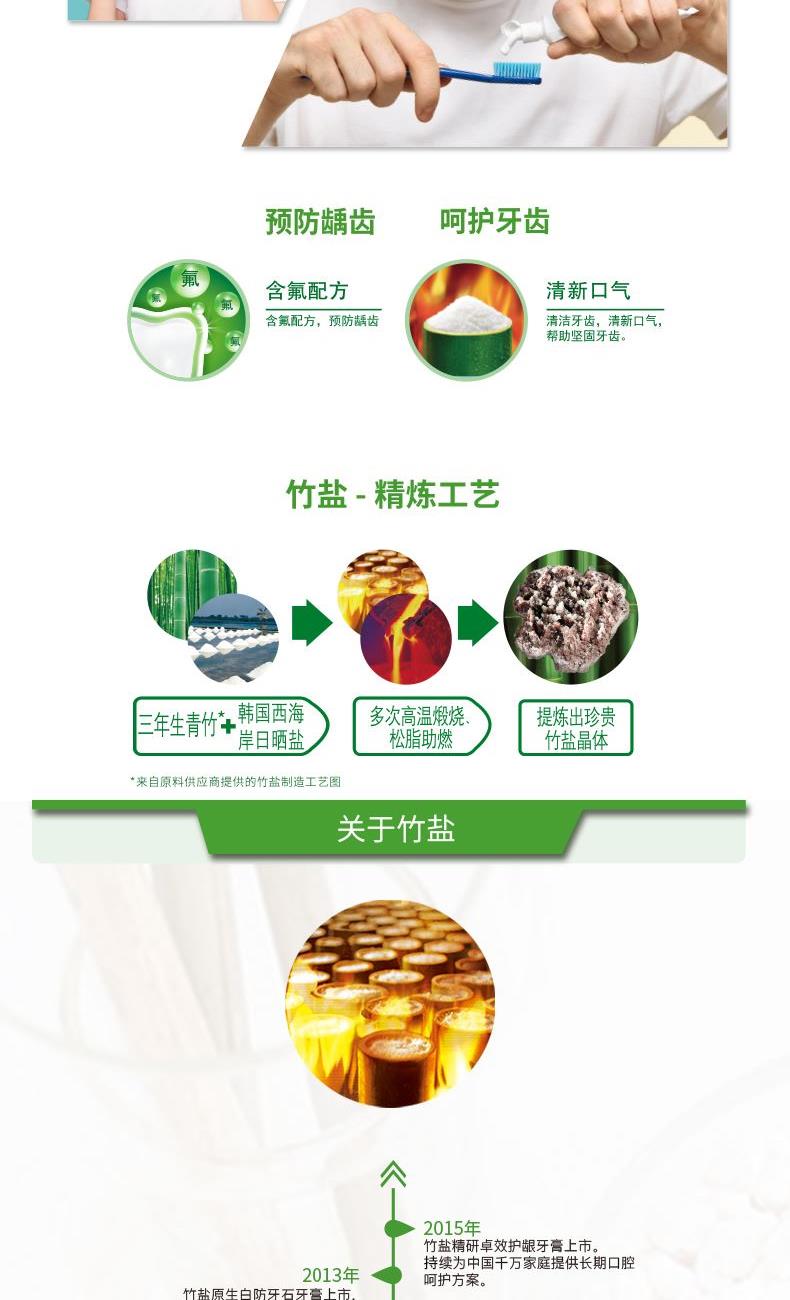 •精炼的护齿精华——竹盐成分,呵护牙龈、洁白牙齿、清洁口腔、清新口气、减轻牙渍; •具有护理牙齿和牙龈的良好作用,给口腔带来多方位的健康呵护; 固齿源牙膏:•特有含氟配方在牙齿表面形成坚固保护膜,预防锯齿; •天然竹盐成分含有丰富的矿物质,有助于温和呵护牙齿和牙龈;