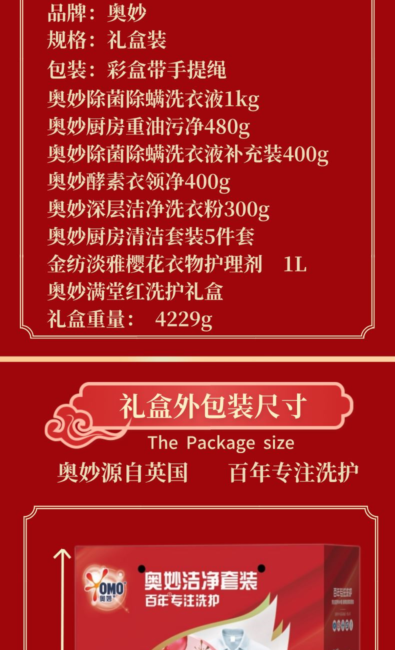 产品配置: 奥妙除螨洗衣液1kg 奥妙厨房重油污净480g 奥妙除螨洗衣液补充装400g 奥妙酵素衣领净400g 奥妙深层洁净洗衣粉300g 奥妙厨房清洁套装5件套 金纺淡雅樱花衣物护理剂1L 奥妙满堂红洗护礼盒 礼盒重量: 4229g 礼盒尺寸:30*13*28cm