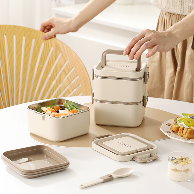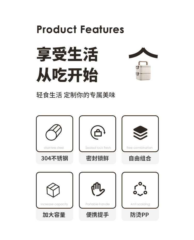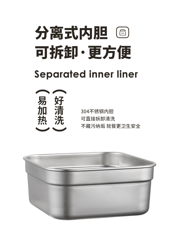 三格2100ML 食品级304不锈钢内格,可直接拆卸清洗,不藏污垢,健康安心每一餐; 一格一味,自由搭配,营养分隔不串味; 层层独立密封盖,有效防止汤水撒漏, U型卡扣提手,外出携带更方便;