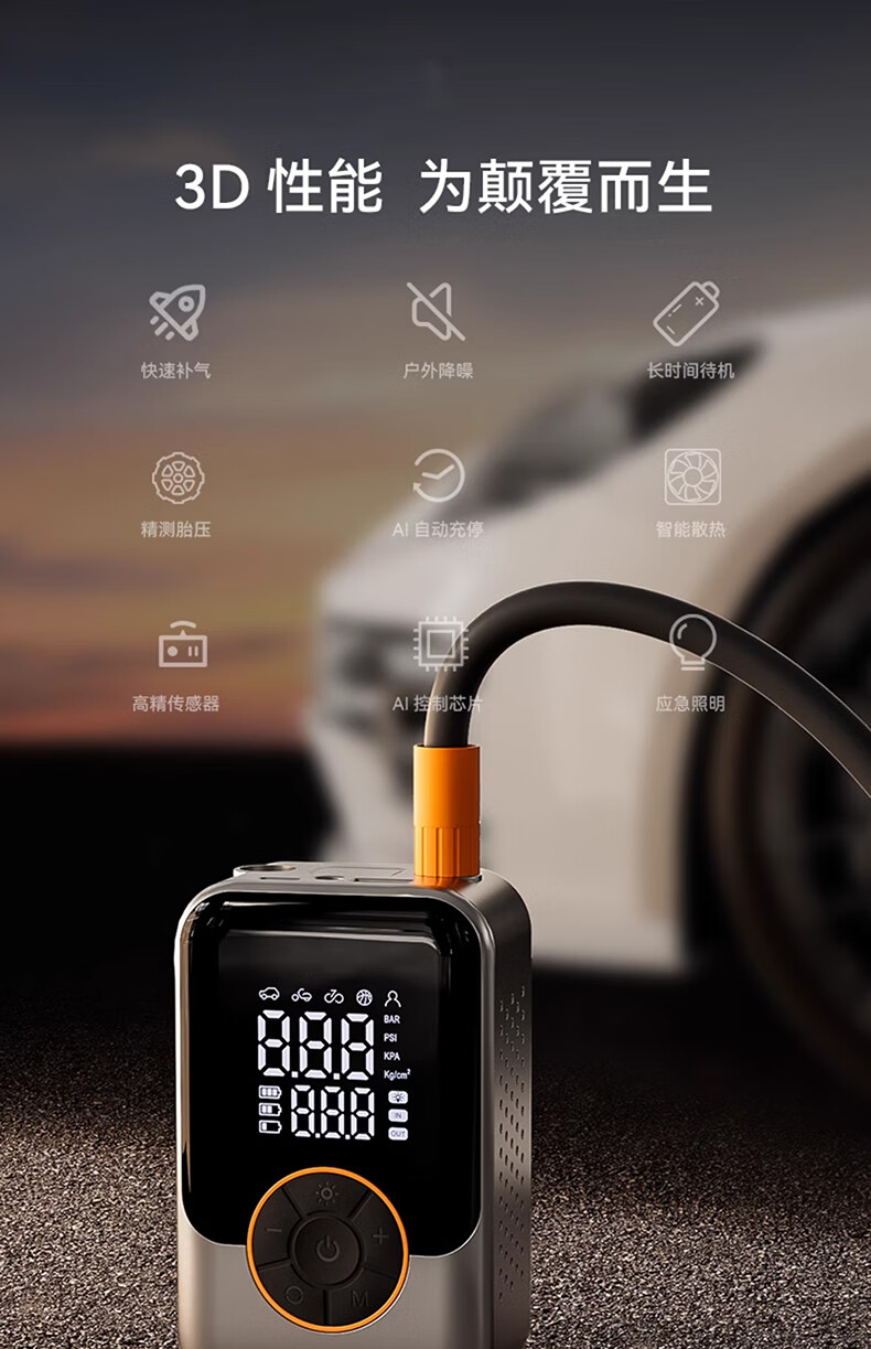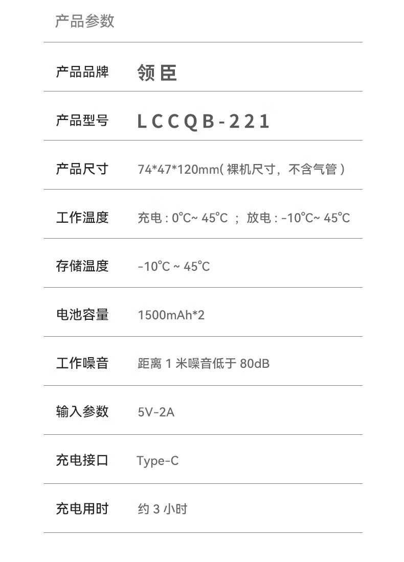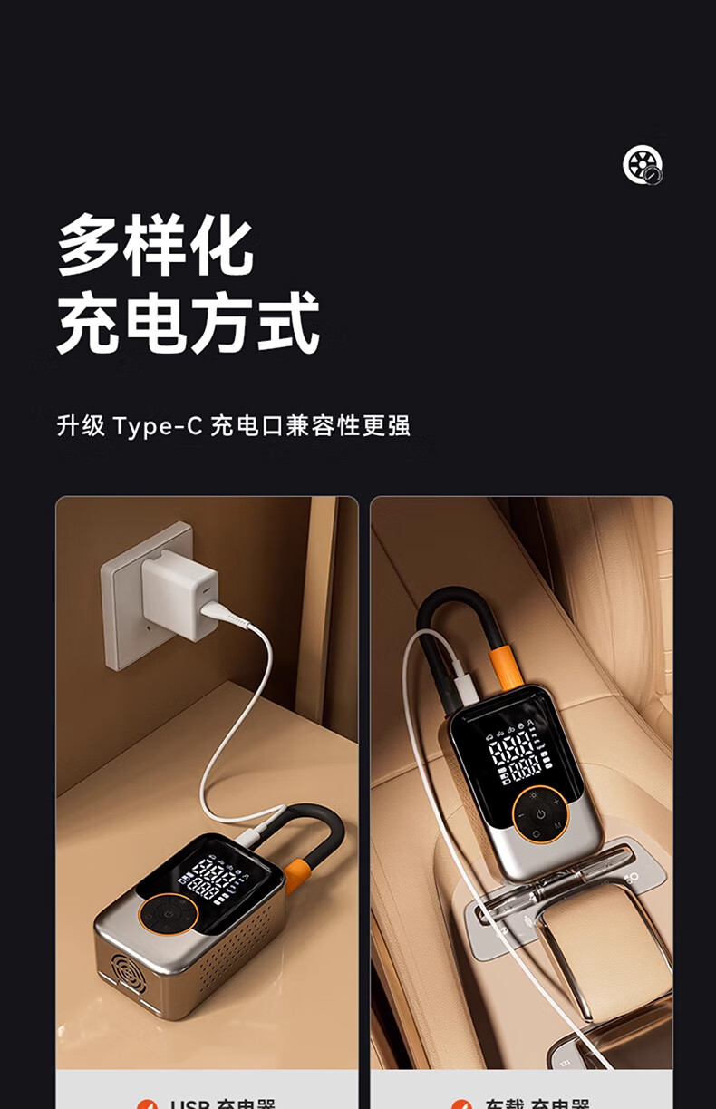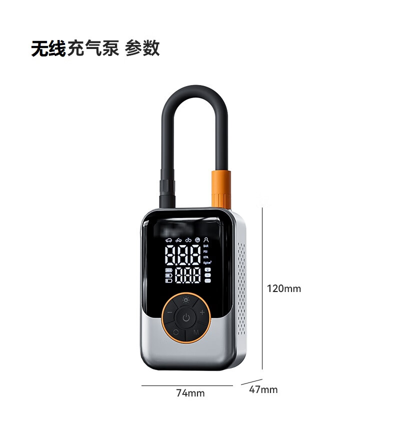 产品颜色:黑色 类型:无线款 材质:ABS 充电时长:3-5小时 电池容量:2000mAh*2 工作时长:15-30分钟 产品配件: 球针*1 充气泵 *2 法嘴*1 type-c充电线*1 充气管*1 适用:汽车/电动车/球类/自行车可用,2.5个压或以下的轮胎车型都适用 产品尺寸:74*47*120mm 包装尺寸:97x84x136mm 整箱数量:20 单品重量:490g