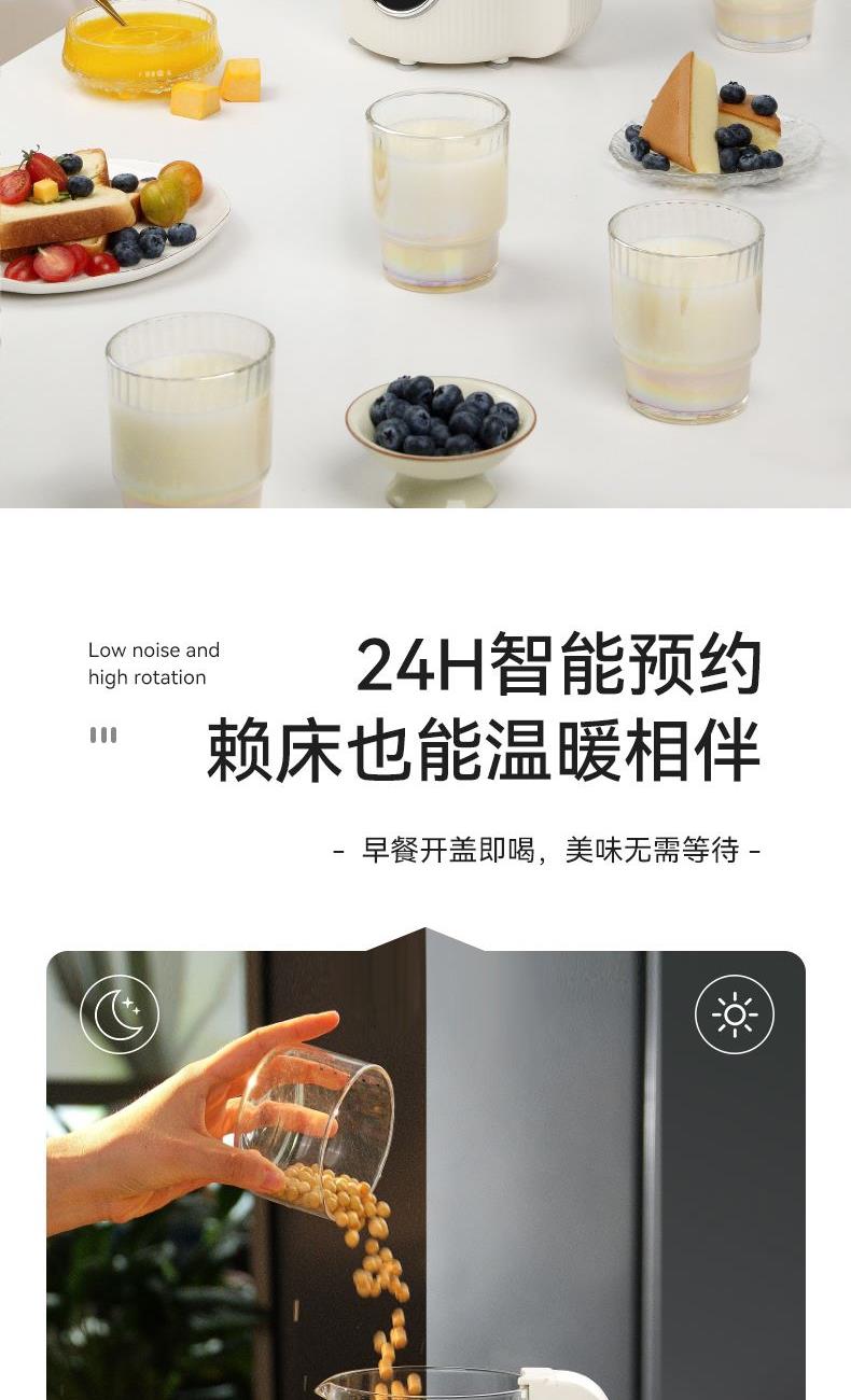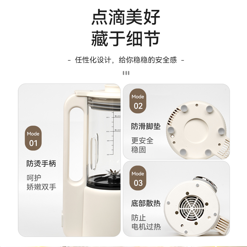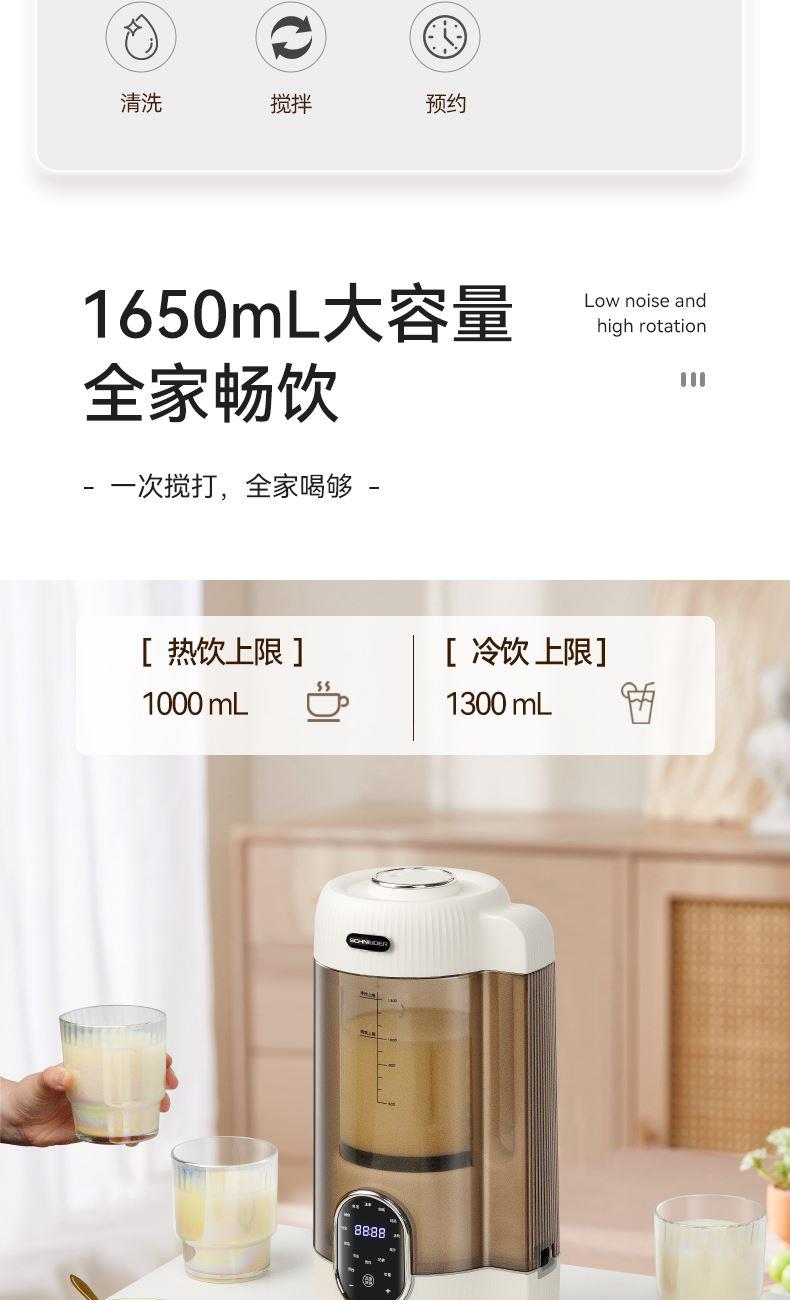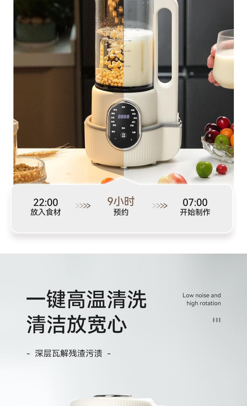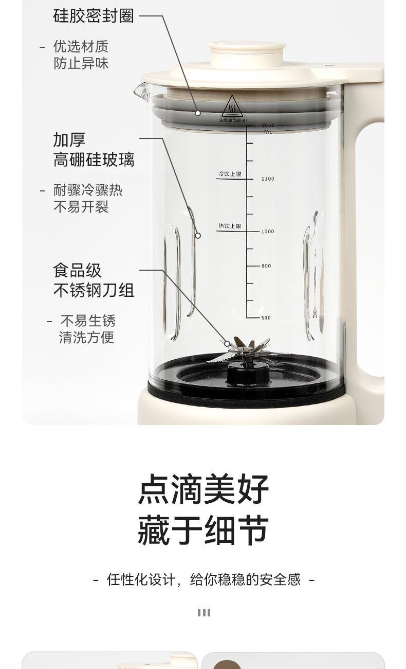 产品颜色:暖白 产品材质:PP+高硼硅玻璃 额定电压:220V~ 额定频率:50Hz 加热功率:600W 搅拌功率:300W 单台净重:2.65kg 单台毛重:3.28kg 产品尺寸:188*160*371mm 内箱尺寸:362*240*417mm 外箱尺寸:744*432*505mm 额定容量:容量1650ml/冷饮1300ml/热饮1000ml 产品清单: 主机*1/电源线*1/说明书*1 低音不扰民 内部采用不粘涂层材质,安全无异味,清洗方便 产品具备控温、超温保护等装置,安全保护 一键触控,带预约功能,具有豆浆,辅食,果汁等多种功能,满足日常需求