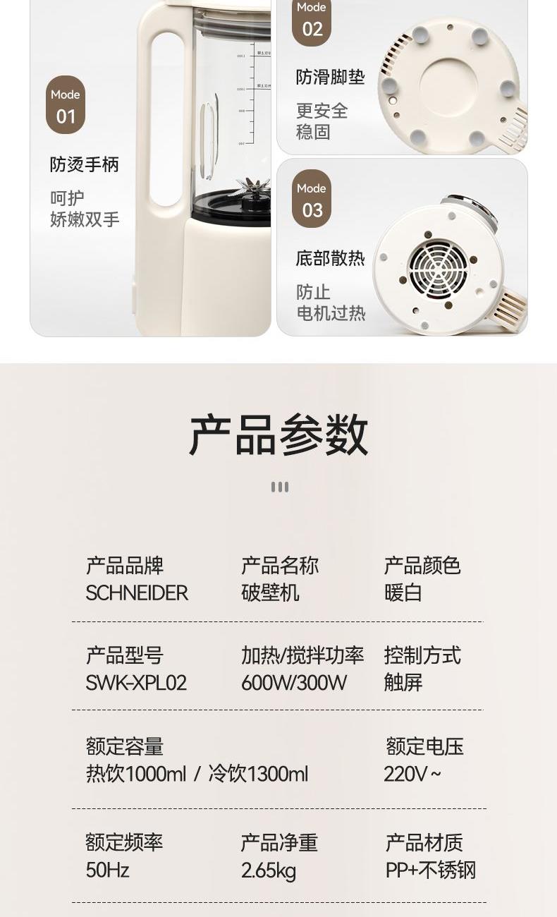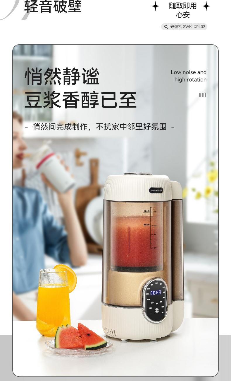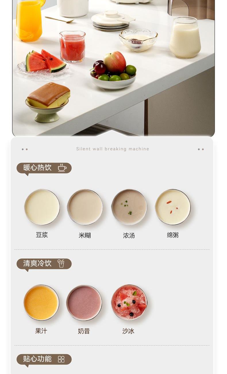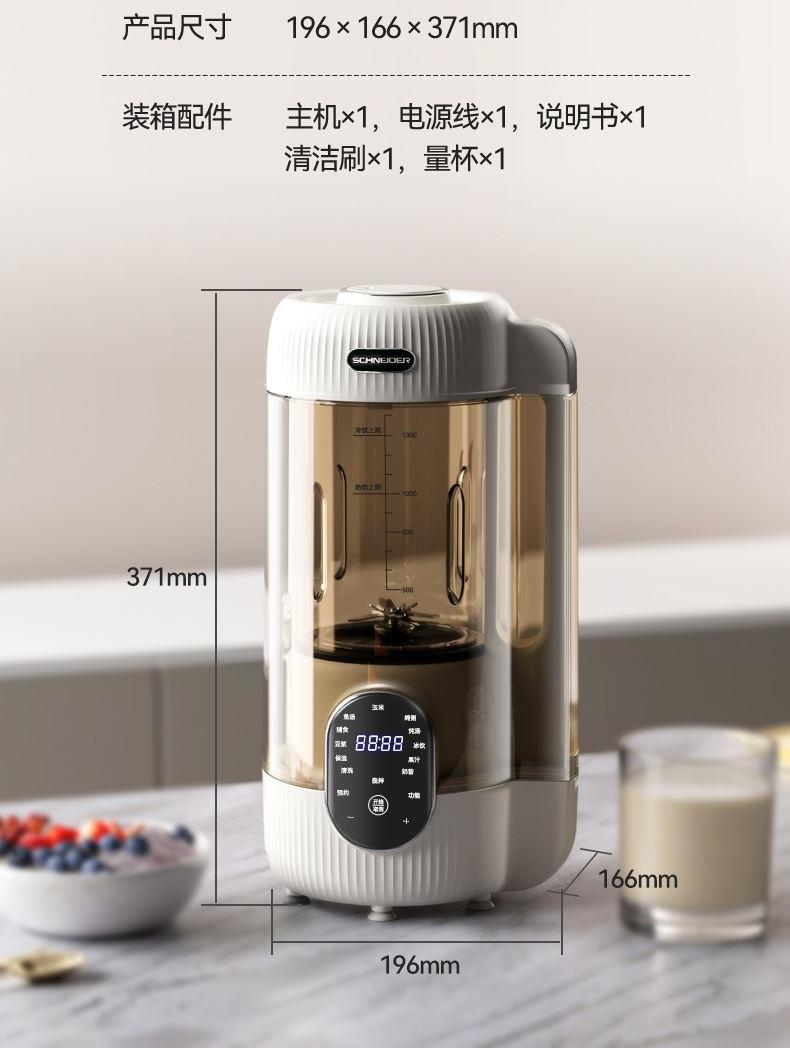 产品颜色:暖白 产品材质:PP+高硼硅玻璃 额定电压:220V~ 额定频率:50Hz 加热功率:600W 搅拌功率:300W 单台净重:2.65kg 单台毛重:3.28kg 产品尺寸:188*160*371mm 内箱尺寸:362*240*417mm 外箱尺寸:744*432*505mm 额定容量:容量1650ml/冷饮1300ml/热饮1000ml 产品清单: 主机*1/电源线*1/说明书*1 低音不扰民 内部采用不粘涂层材质,安全无异味,清洗方便 产品具备控温、超温保护等装置,安全保护 一键触控,带预约功能,具有豆浆,辅食,果汁等多种功能,满足日常需求