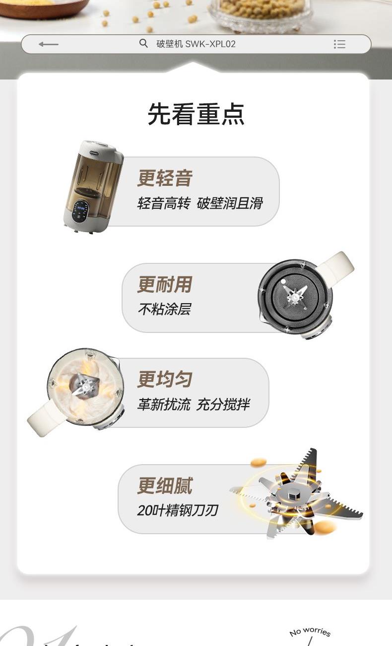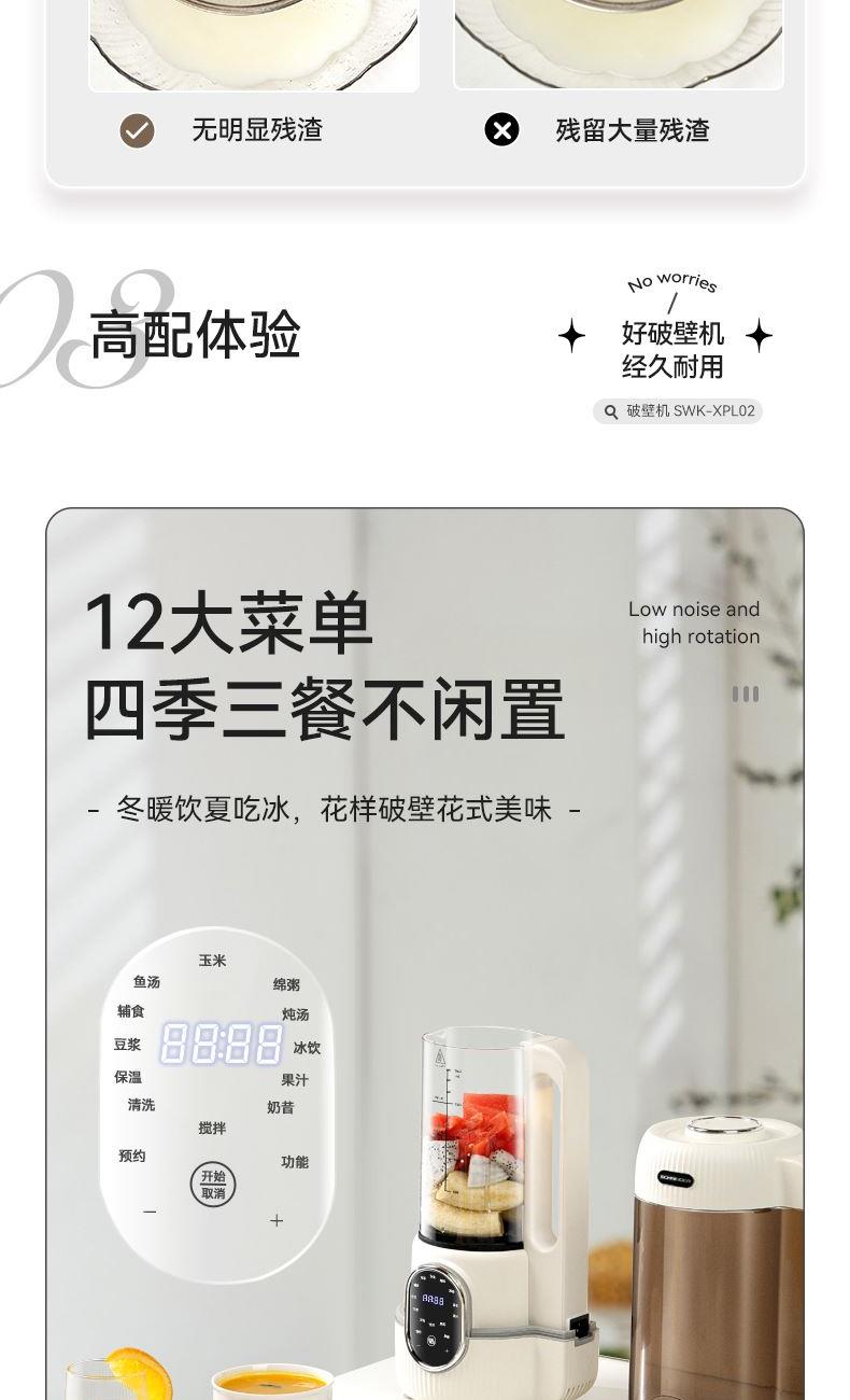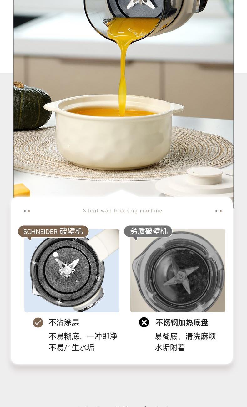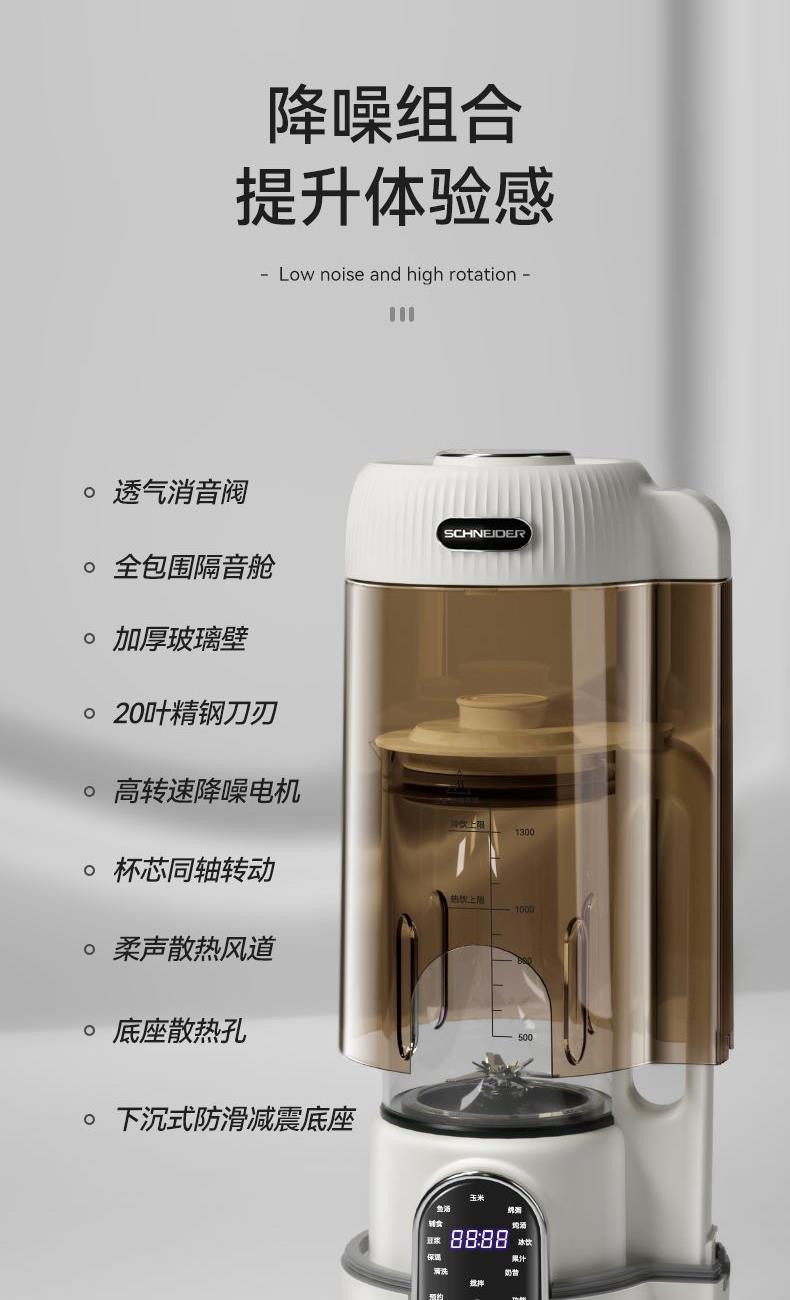 产品颜色:暖白 产品材质:PP+高硼硅玻璃 额定电压:220V~ 额定频率:50Hz 加热功率:600W 搅拌功率:300W 单台净重:2.65kg 单台毛重:3.28kg 产品尺寸:188*160*371mm 内箱尺寸:362*240*417mm 外箱尺寸:744*432*505mm 额定容量:容量1650ml/冷饮1300ml/热饮1000ml 产品清单: 主机*1/电源线*1/说明书*1 低音不扰民 内部采用不粘涂层材质,安全无异味,清洗方便 产品具备控温、超温保护等装置,安全保护 一键触控,带预约功能,具有豆浆,辅食,果汁等多种功能,满足日常需求