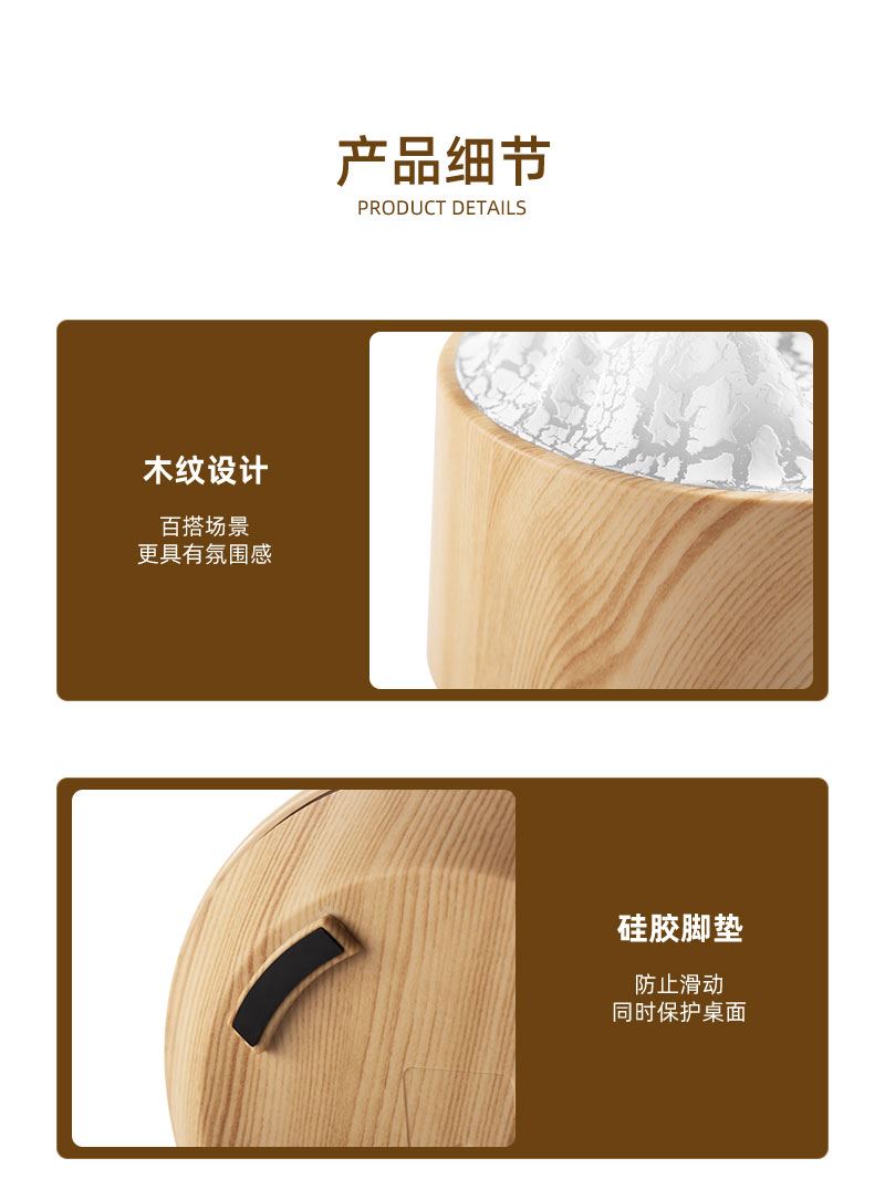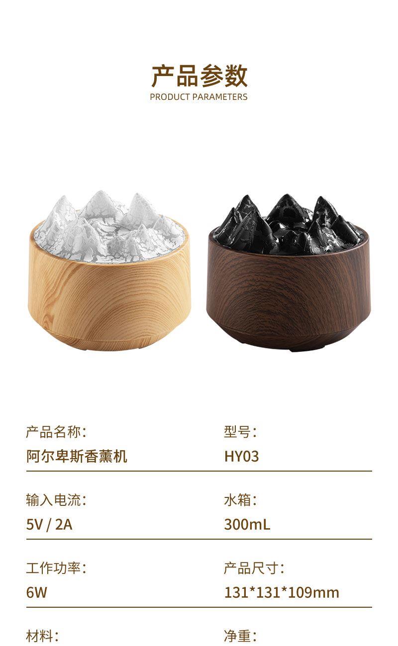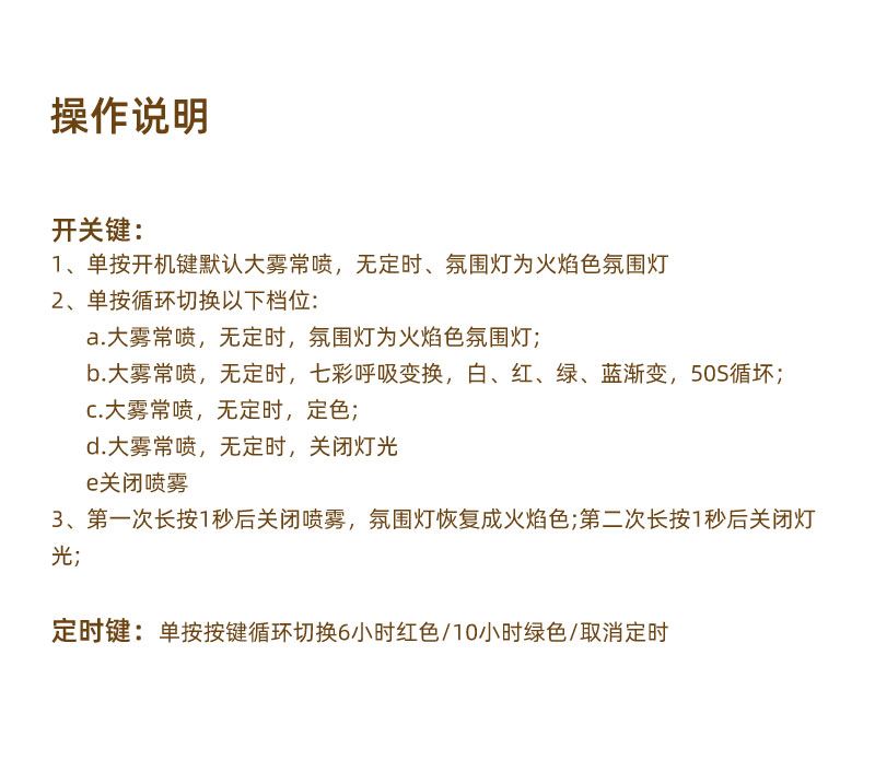 产品功能: *加湿器+香薰机+夜灯三合一 *七彩渐变氛围灯+仿真火光+冷光 * 内置缺水断电保护,带遥控 产品参数: *材质:ABS+PP+电子元件 *外箱尺寸:56*42*24.8cm *整箱重量:7.37KG/8.37KG *产品尺寸:131*131*109mm *包装盒尺寸:135*135*114mm *产品重量:237g/307g *颜色:浅木纹、深木纹 *标配:香薰机、彩盒、数据线、遥控、说明书