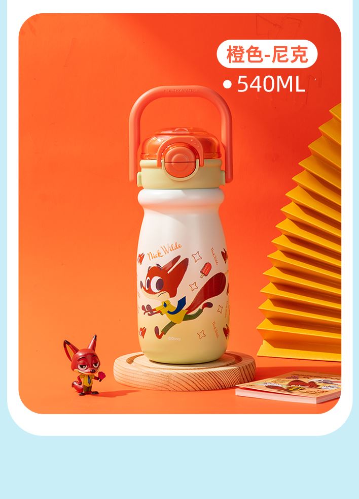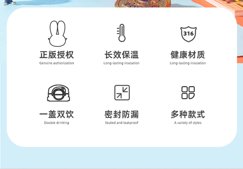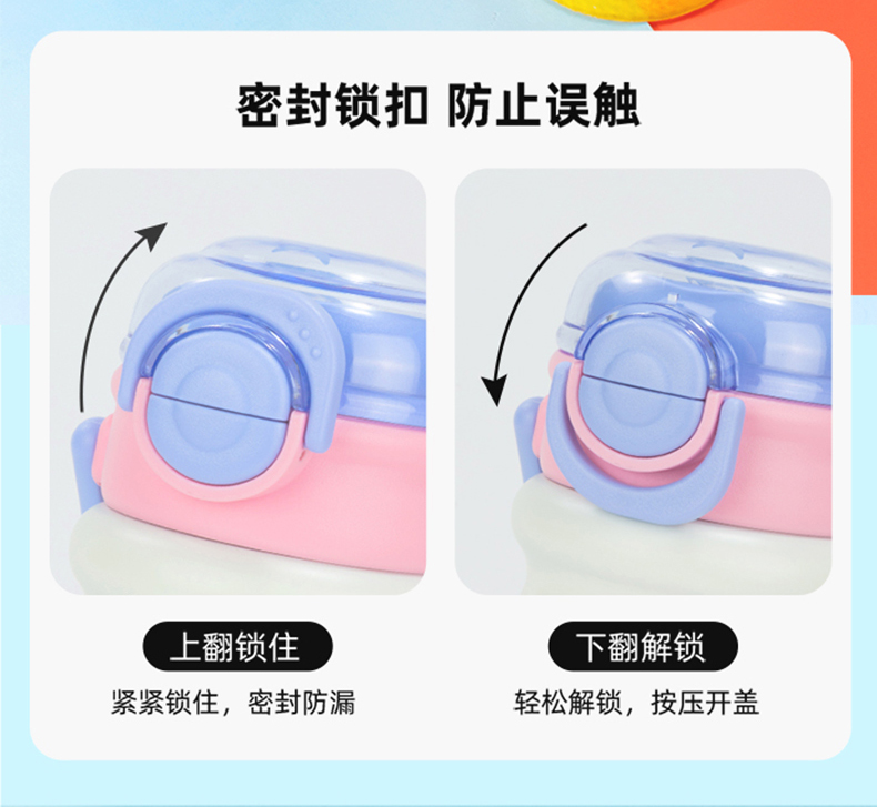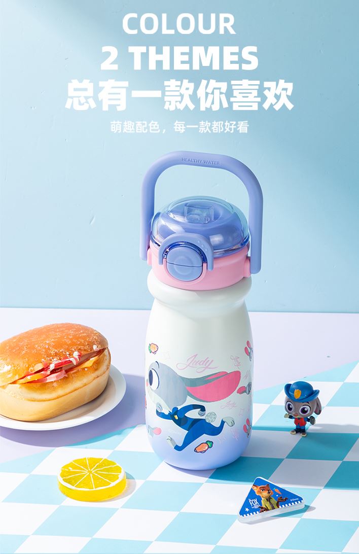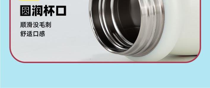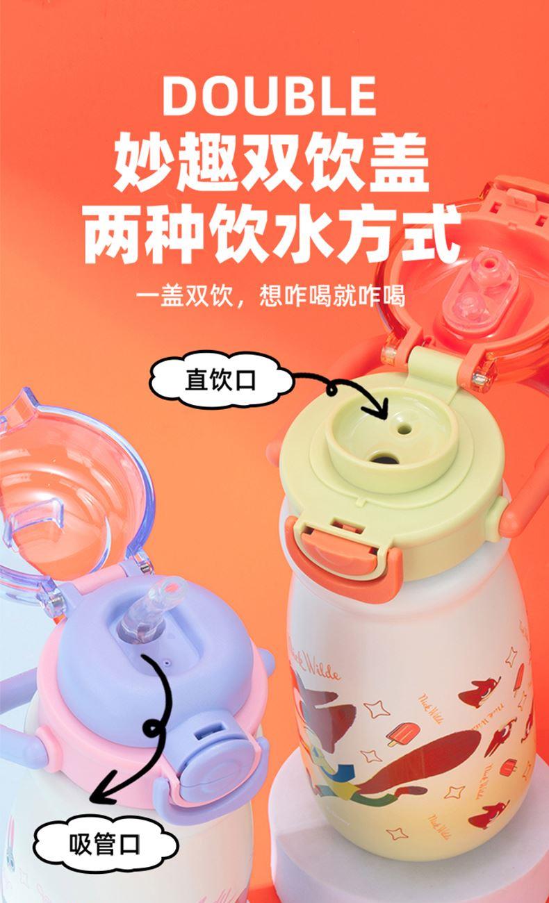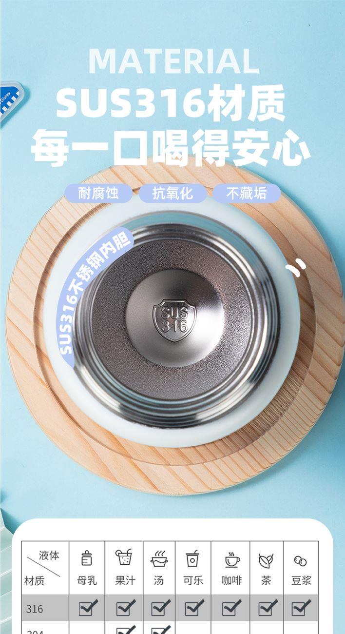 容量:540ml 彩盒尺寸:23.7*8.5cm 材质:PP、硅橡胶、内胆:316材质 卖点: ①妙趣双饮盖两种饮水方式,一盖双饮,想咋喝就咋喝 ②密封锁扣,防止误触 ③6层锁温,12小时长效护航 ④SUS316材质,耐腐蚀不藏垢,每一口喝得安心 ⑤安全密封,倒置不漏水 ⑥萌趣图案,便携提手,圆润杯口