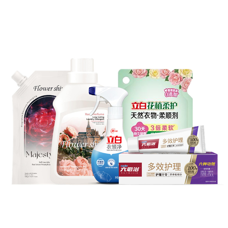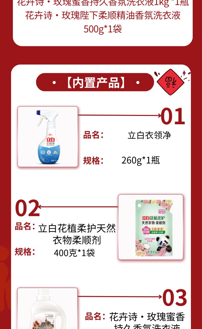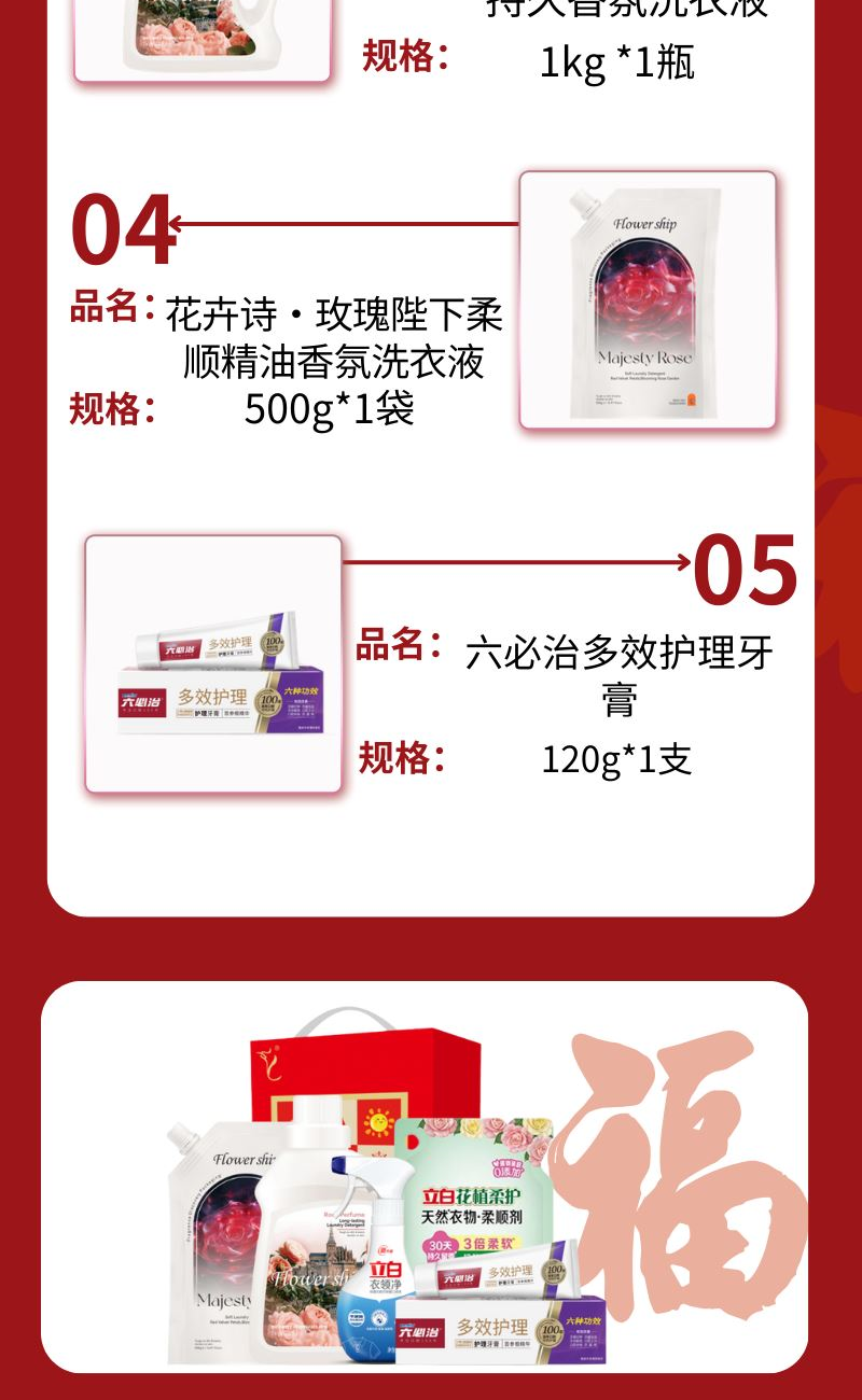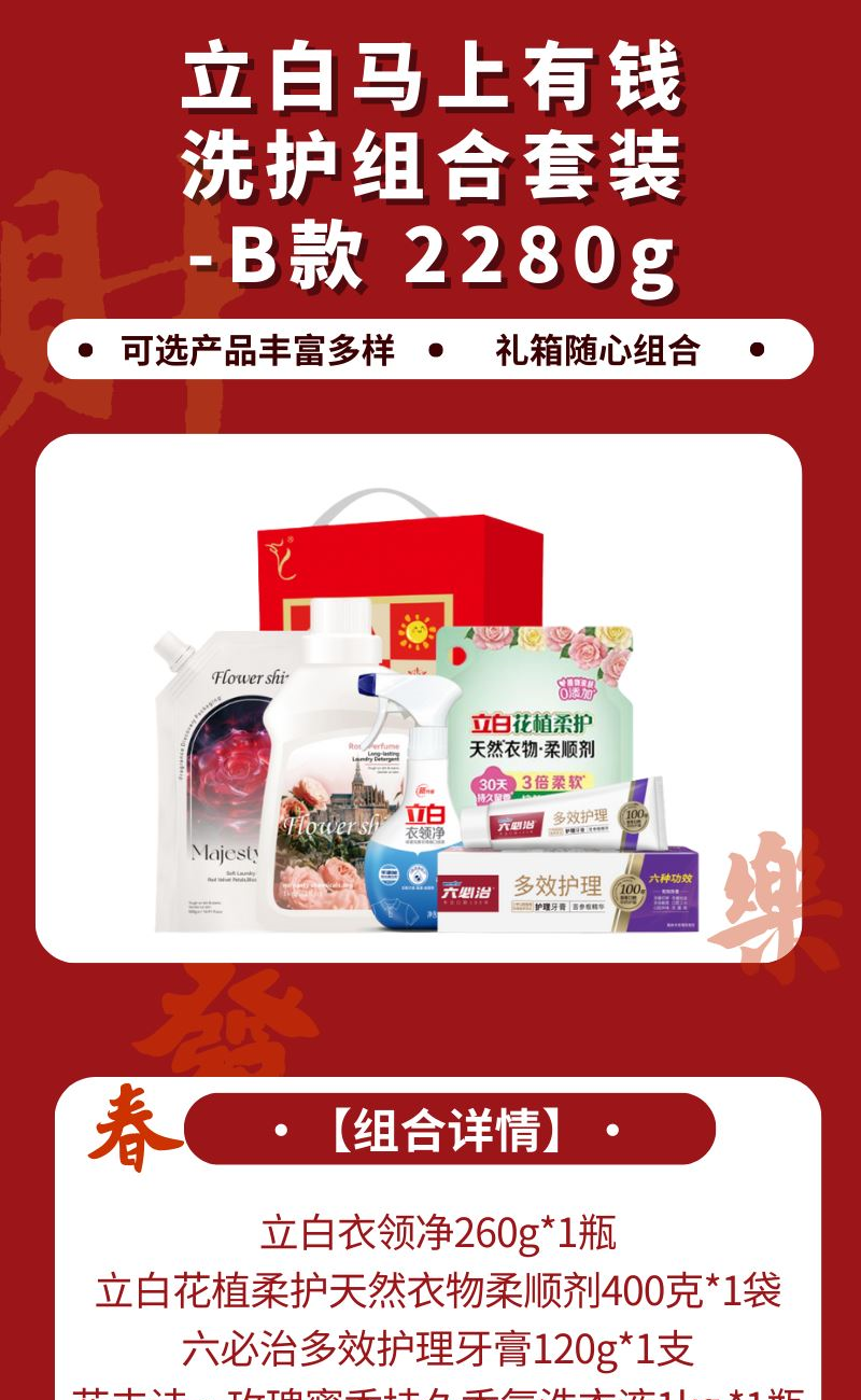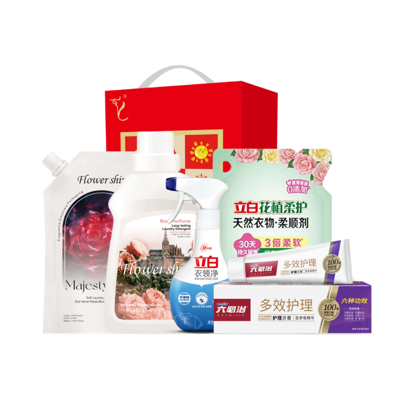 配置: 立白衣领净260g*1瓶 立白花植柔护天然衣物柔顺剂400克*1袋 六必治多效护理牙膏120g*1支 花卉诗·玫瑰蜜香持久香氛洗衣液1kg *1瓶 花卉诗·玫瑰陛下柔顺精油香氛洗衣液500g*1袋 卖点: 可选产品丰富多样,礼箱随心组合,多种价位因需而定,充分满足各种送礼需求,是商务送礼、单位福利的用心之选。