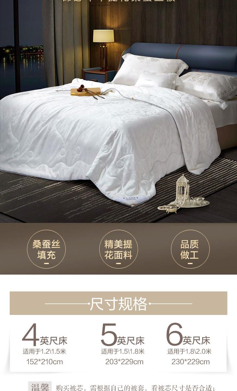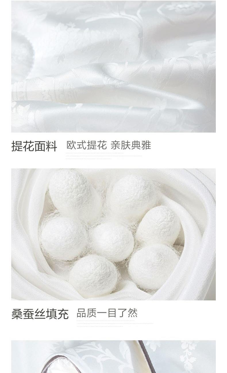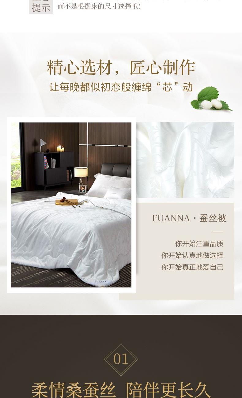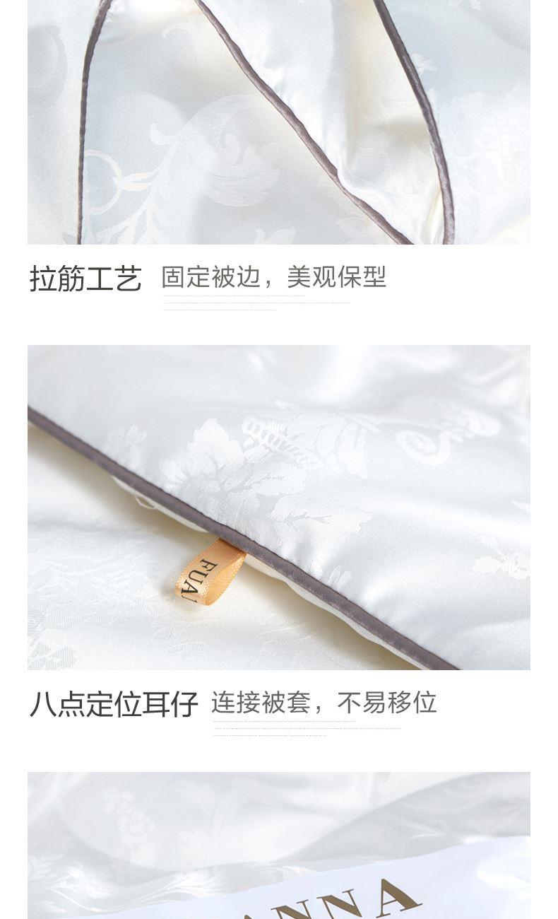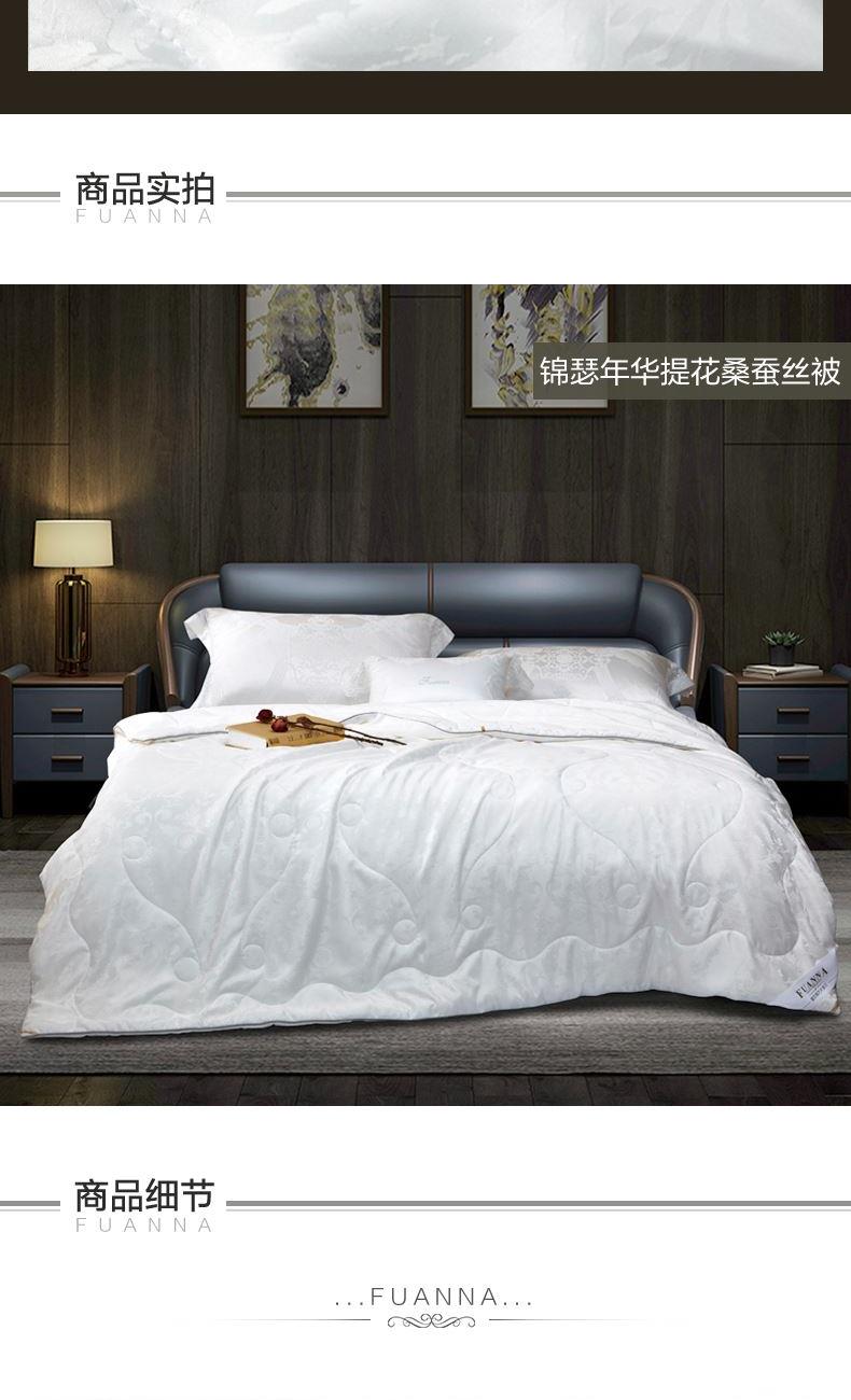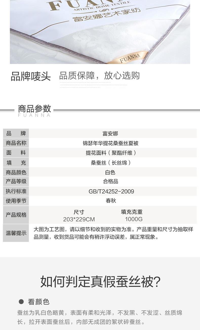 【产品面料】大提花 【产品填充】桑蚕丝 【产品规格】203*229cm(1000g) 【产品重量】毛重约2.6kg 净重约2.1kg 【包装尺寸】富安娜精美礼盒50*12*40cm 【每箱数量】5床 1.吸湿透气、冬暖夏凉,防霉,含有18种氨基酸能够延缓皮肤老化,滋养皮肤的,带您拥有健康睡眠 2.采用超柔提花面料,手感舒适,花型立体饱满,丝滑莹润,让整个卧室更具品质感