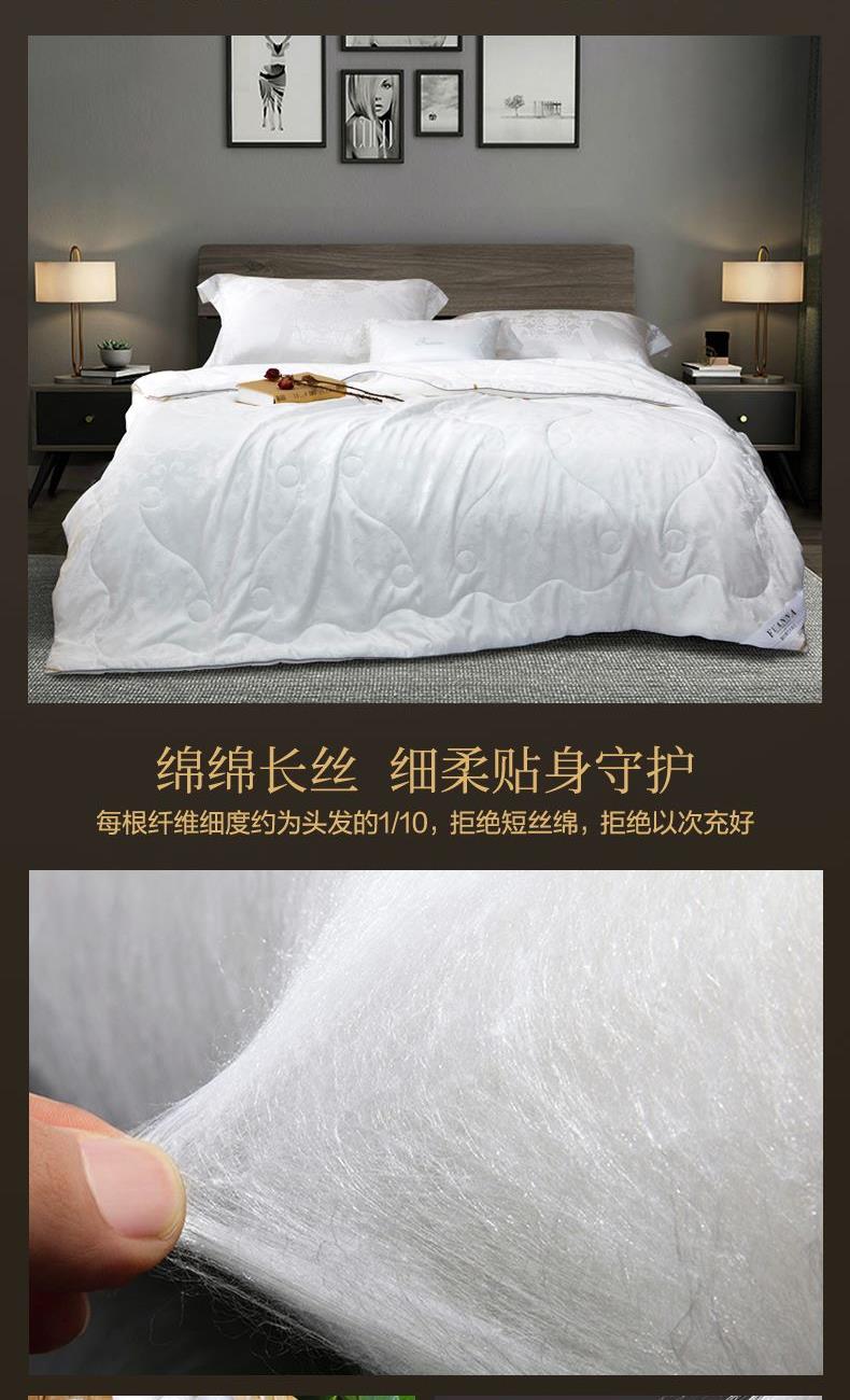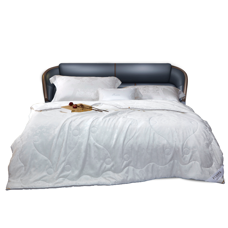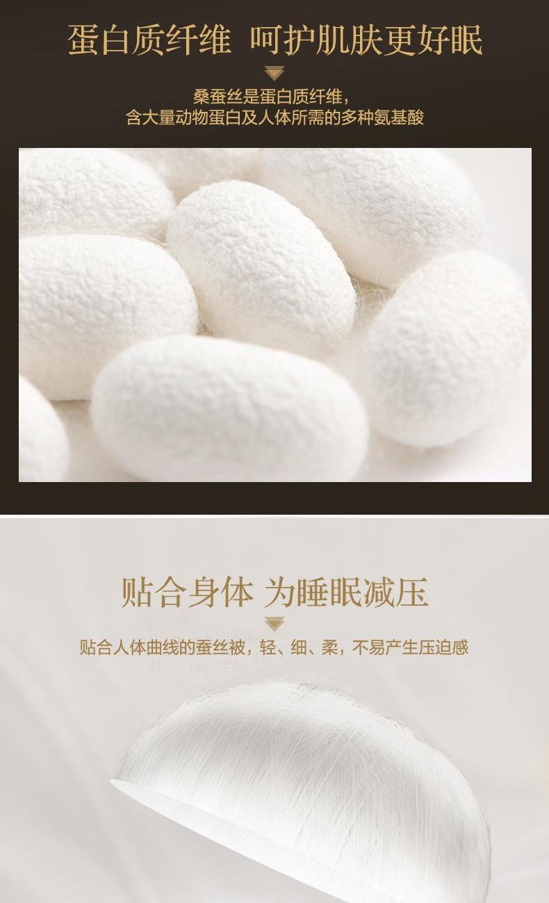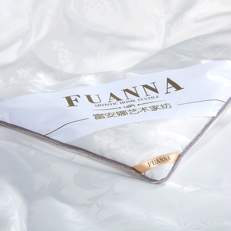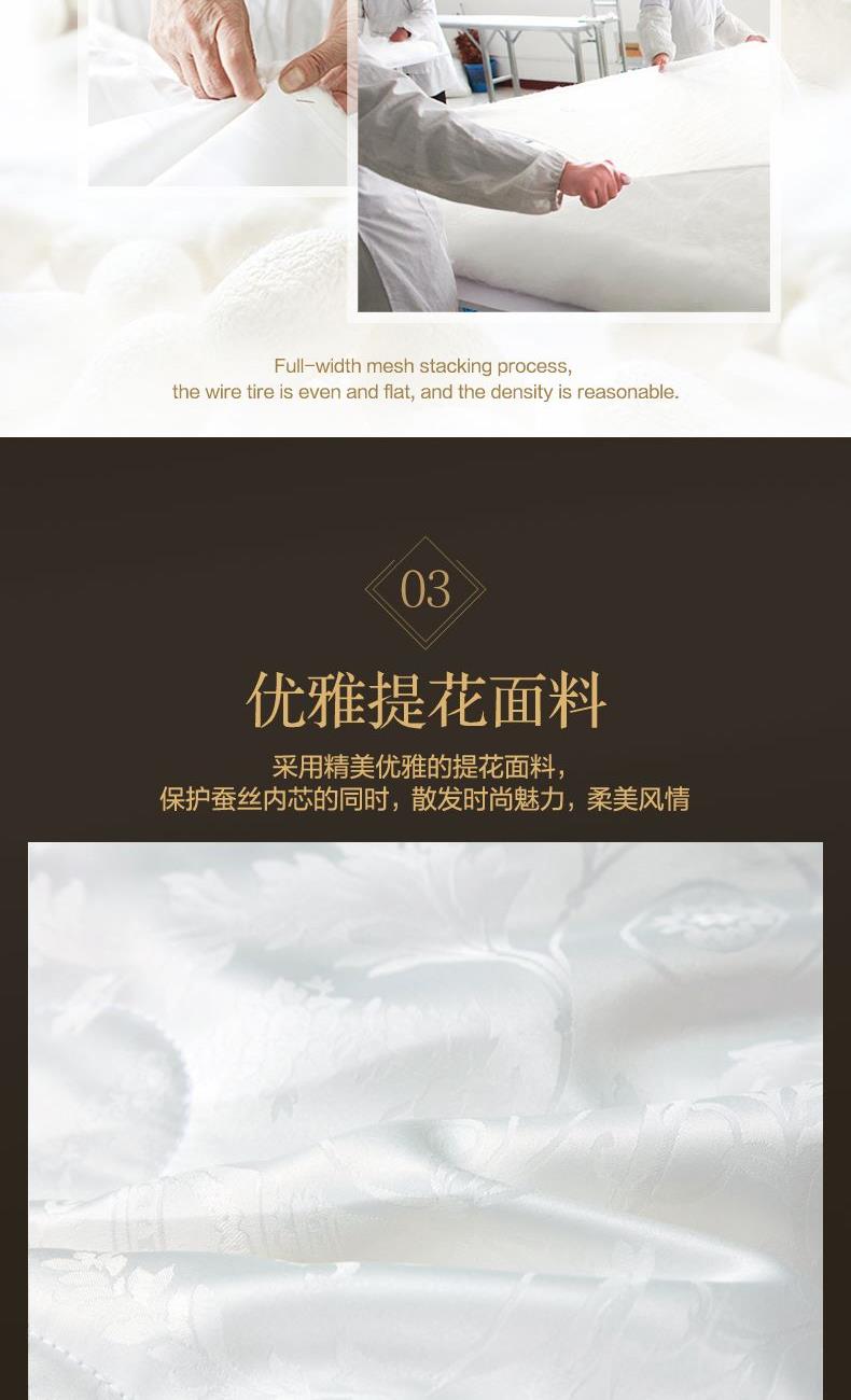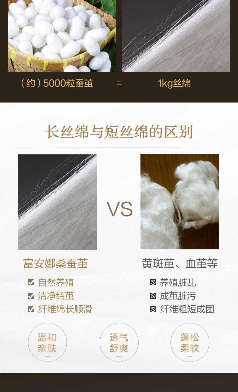 【产品面料】大提花 【产品填充】桑蚕丝 【产品规格】203*229cm(1000g) 【产品重量】毛重约2.6kg 净重约2.1kg 【包装尺寸】富安娜精美礼盒50*12*40cm 【每箱数量】5床 1.吸湿透气、冬暖夏凉,防霉,含有18种氨基酸能够延缓皮肤老化,滋养皮肤的,带您拥有健康睡眠 2.采用超柔提花面料,手感舒适,花型立体饱满,丝滑莹润,让整个卧室更具品质感