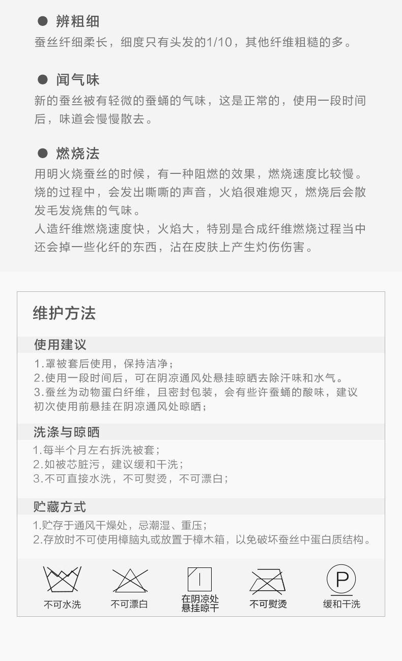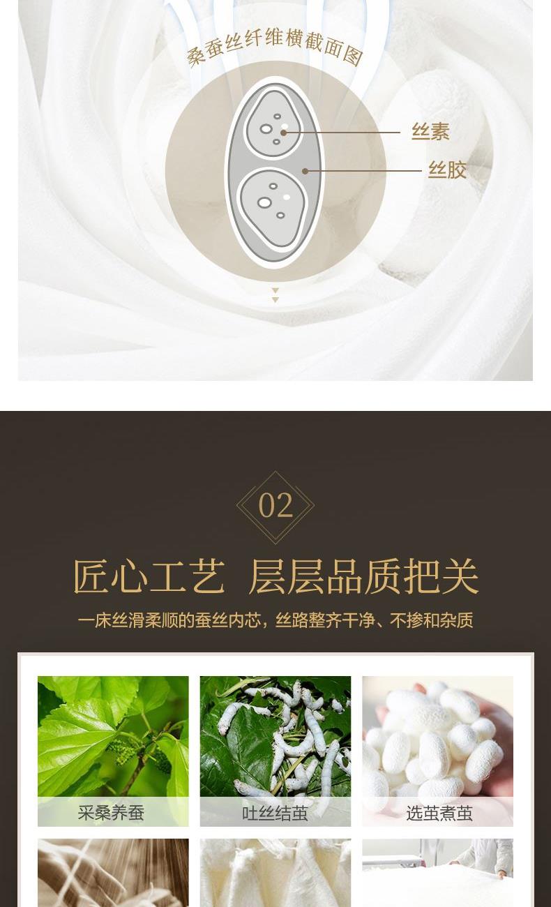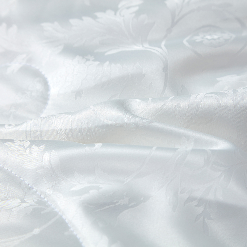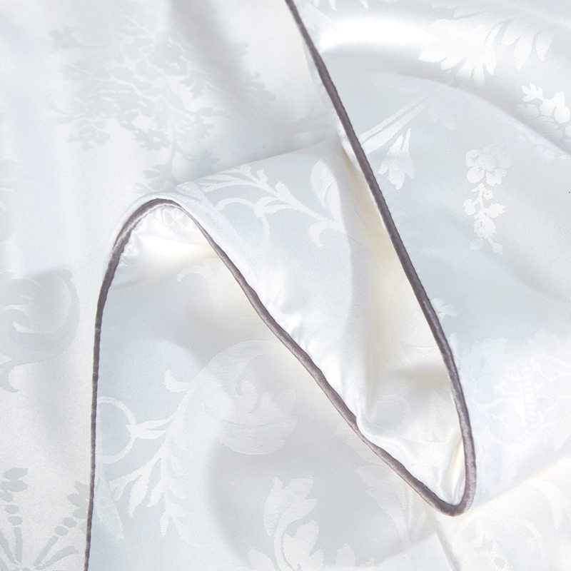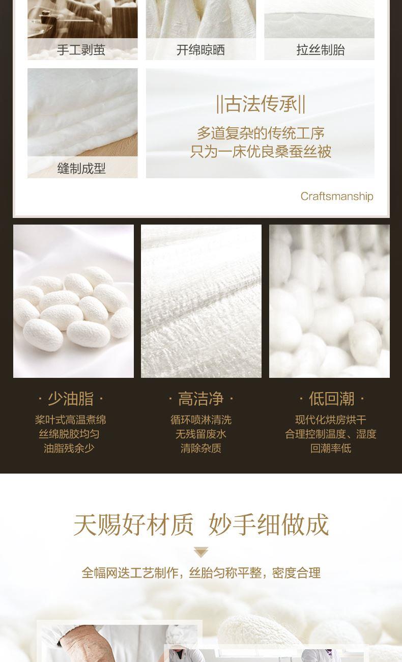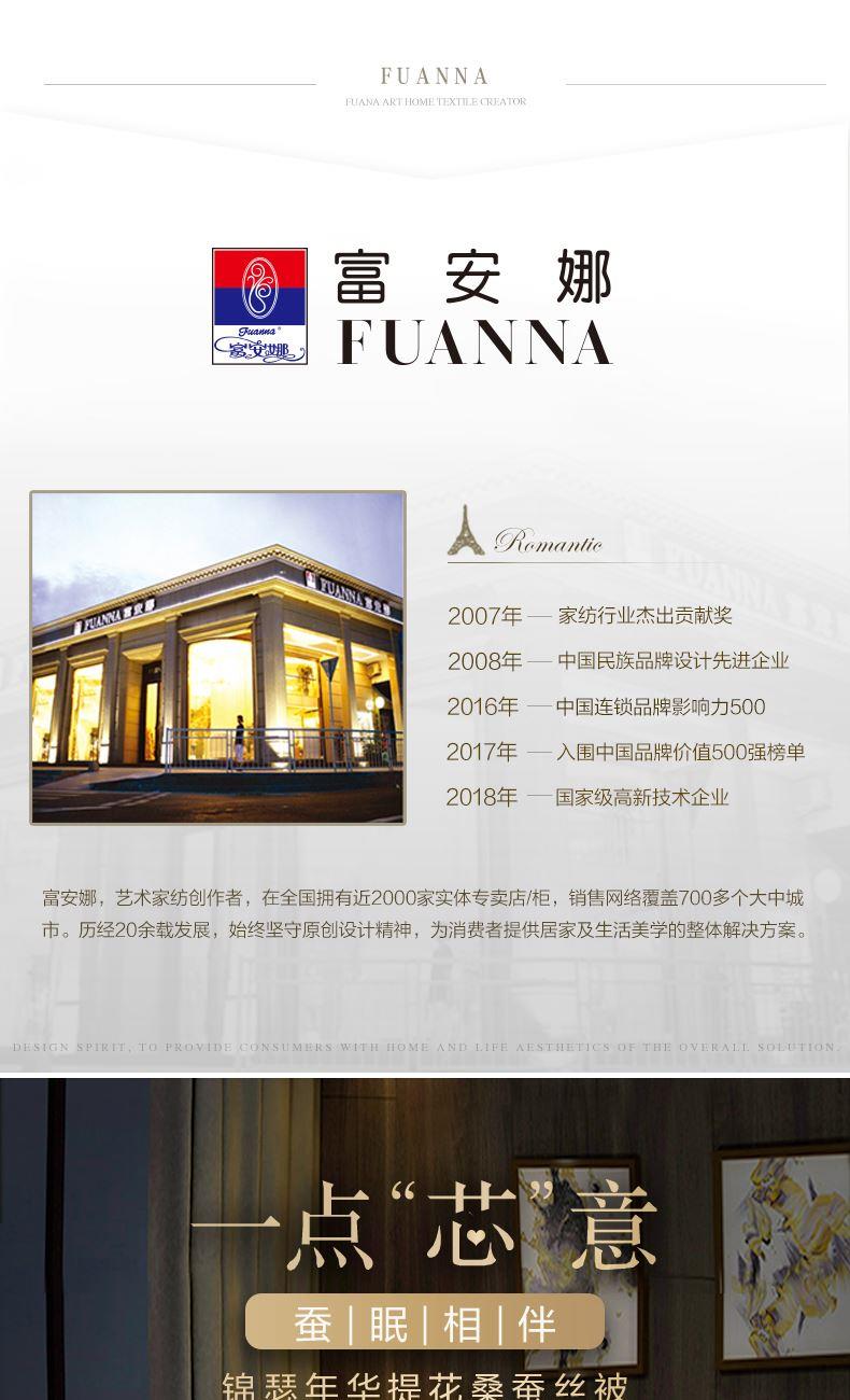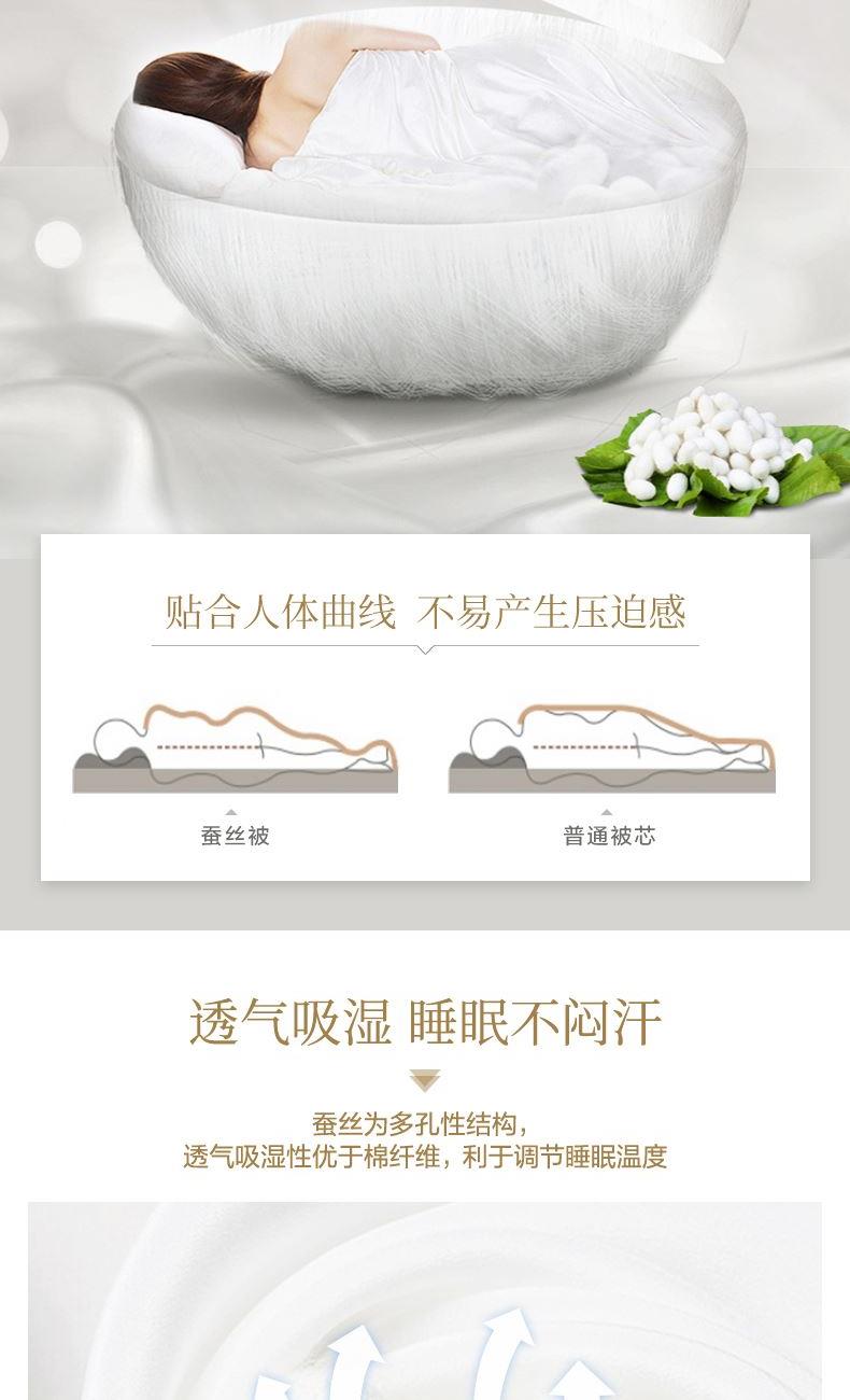【产品面料】大提花 【产品填充】桑蚕丝 【产品规格】203*229cm(1000g) 【产品重量】毛重约2.6kg 净重约2.1kg 【包装尺寸】富安娜精美礼盒50*12*40cm 【每箱数量】5床 1.吸湿透气、冬暖夏凉,防霉,含有18种氨基酸能够延缓皮肤老化,滋养皮肤的,带您拥有健康睡眠 2.采用超柔提花面料,手感舒适,花型立体饱满,丝滑莹润,让整个卧室更具品质感