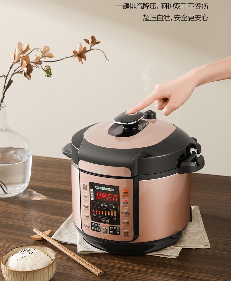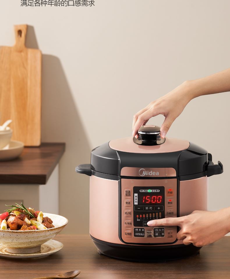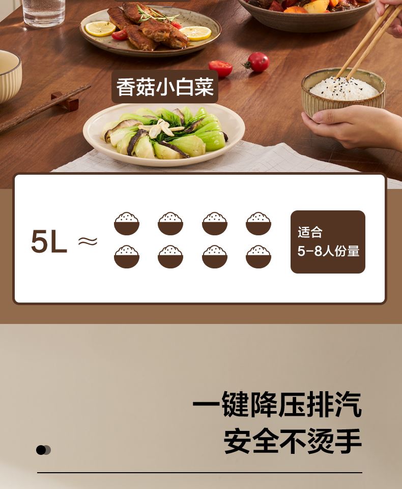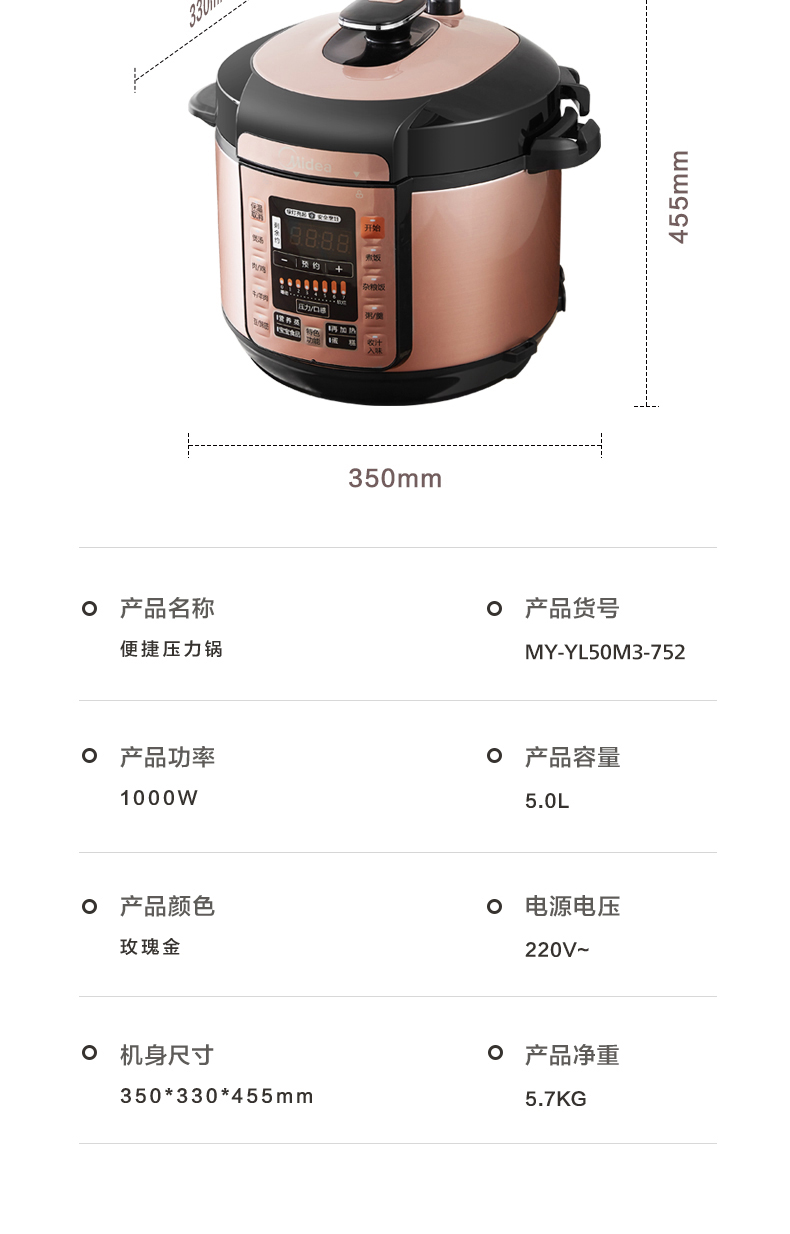 产品尺寸:350*330*455mm 产品净重:5.7kg 电源电压:220V 产品容量:5.0L 产品功率:1000W 产品卖点 一锅双胆留香不串味 一键降压排气安全不烫手 24小时预约美味暖心守候 12大私厨特色鲜香自如 内设八重保护安全面面俱到