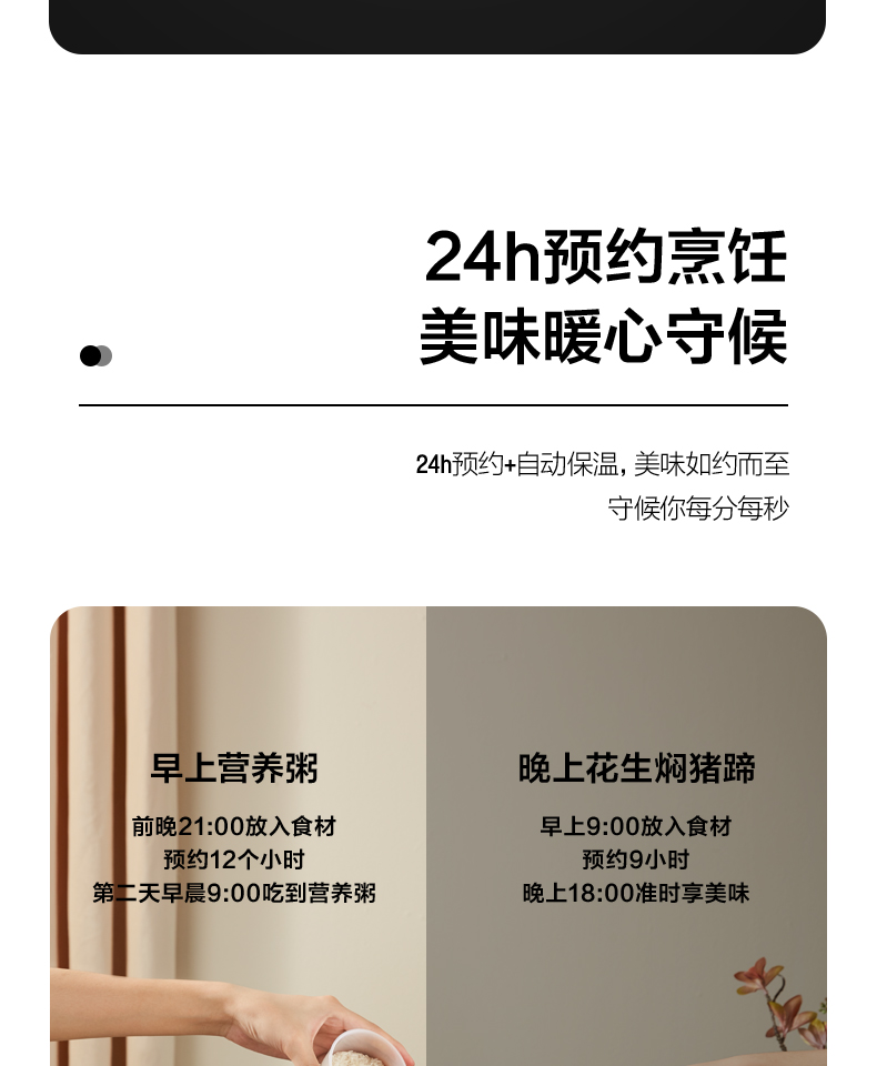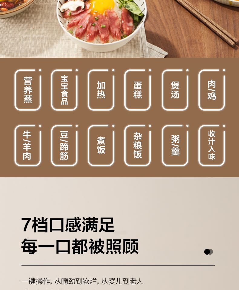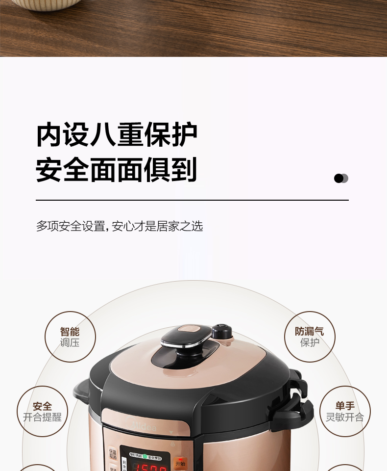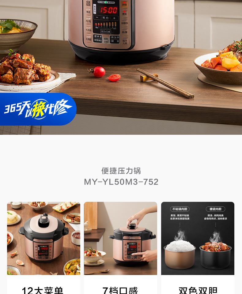 产品尺寸:350*330*455mm 产品净重:5.7kg 电源电压:220V 产品容量:5.0L 产品功率:1000W 产品卖点 一锅双胆留香不串味 一键降压排气安全不烫手 24小时预约美味暖心守候 12大私厨特色鲜香自如 内设八重保护安全面面俱到