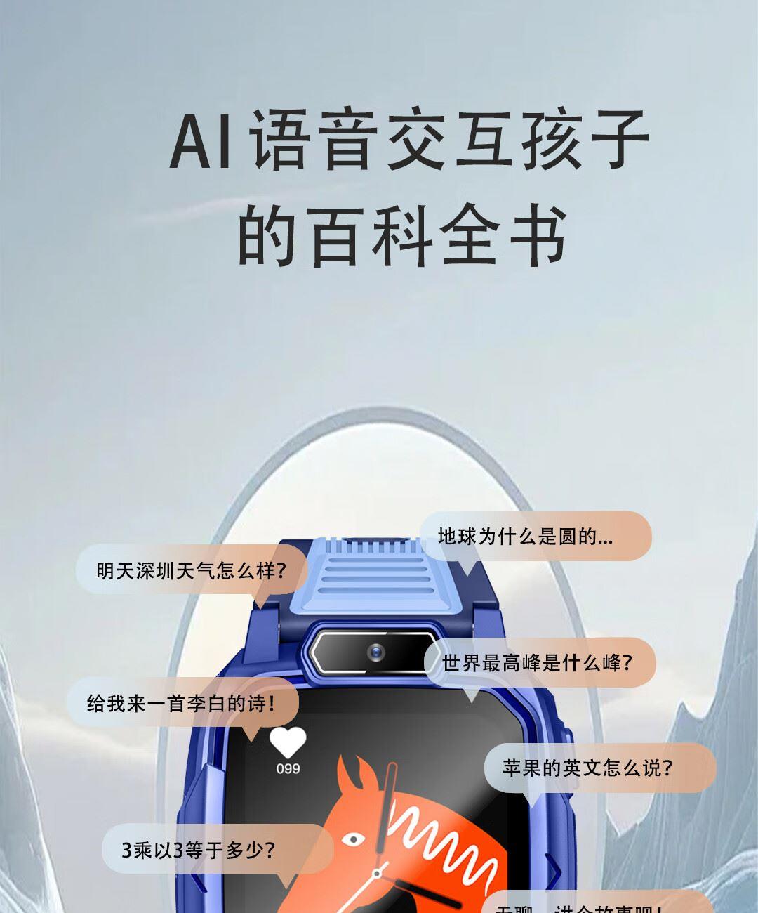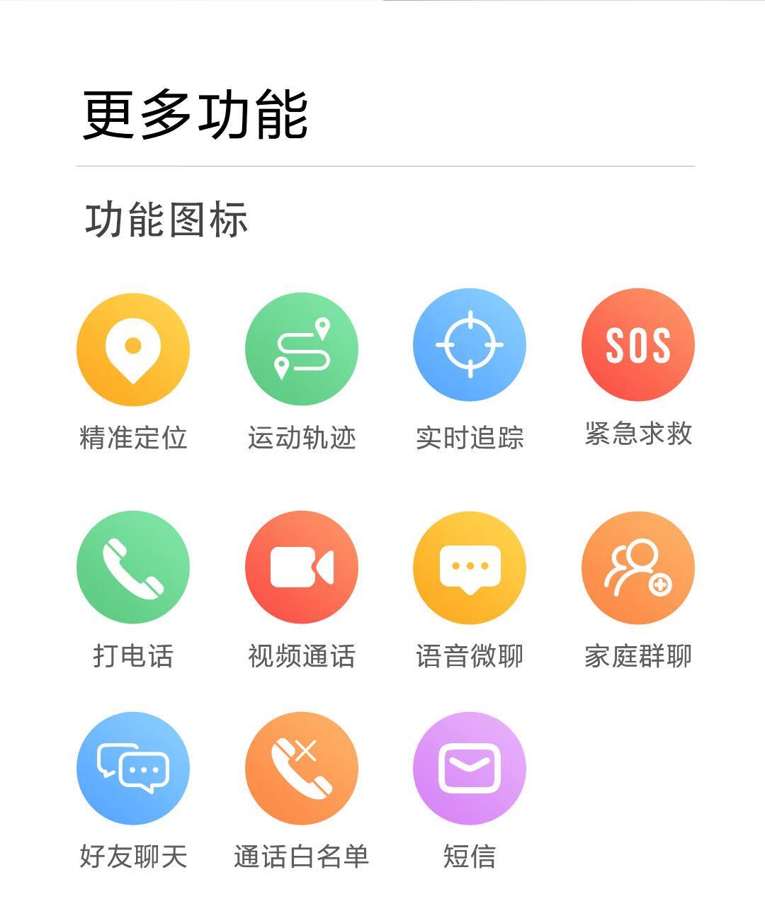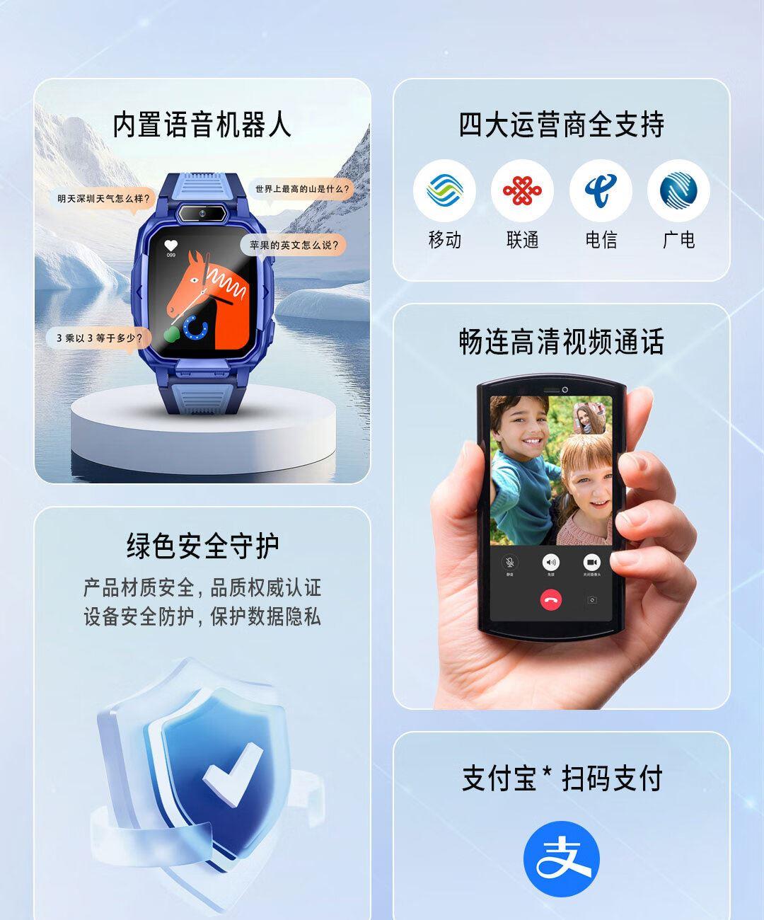 实时定位,当日历史轨迹,双向通话,语音微聊,闹钟设置,上课禁用,安全守护,生活防水,支付宝零钱包,视频通话,AI智能机器人,远程关机,拒接陌生电话,禁用拨号盘等功能