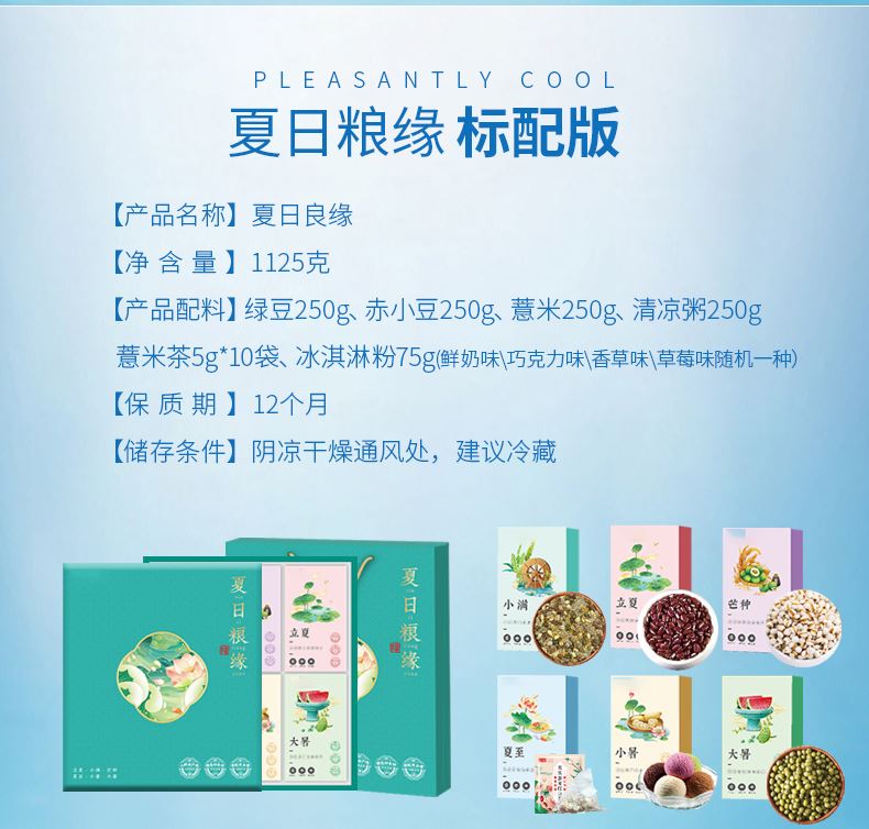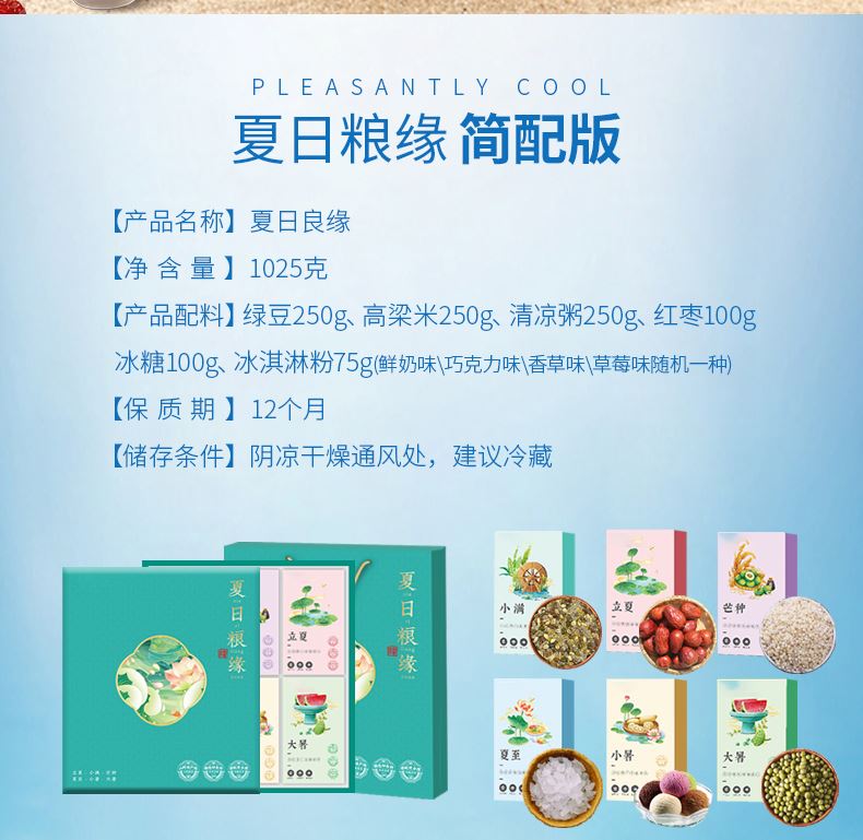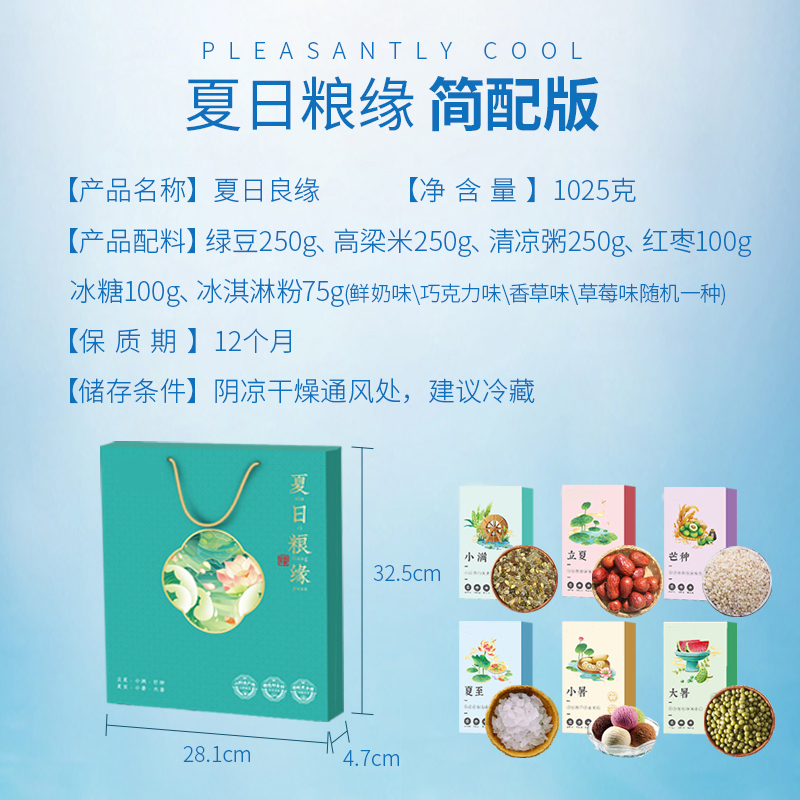 夏日粮缘(简配款) 净含量:1025g 产品规格配置:绿豆、高粱米、清凉粥各250g 红枣100g、冰糖100g、冰淇淋粉75g(牛奶\巧克力\香草\草莓四种口味随机) 盒尺寸:32.5*28.1*4.7cm 手袋尺寸:34*29.5*5 箱尺寸:50*39*39 箱体积:0.076方 箱重量:18.65kg